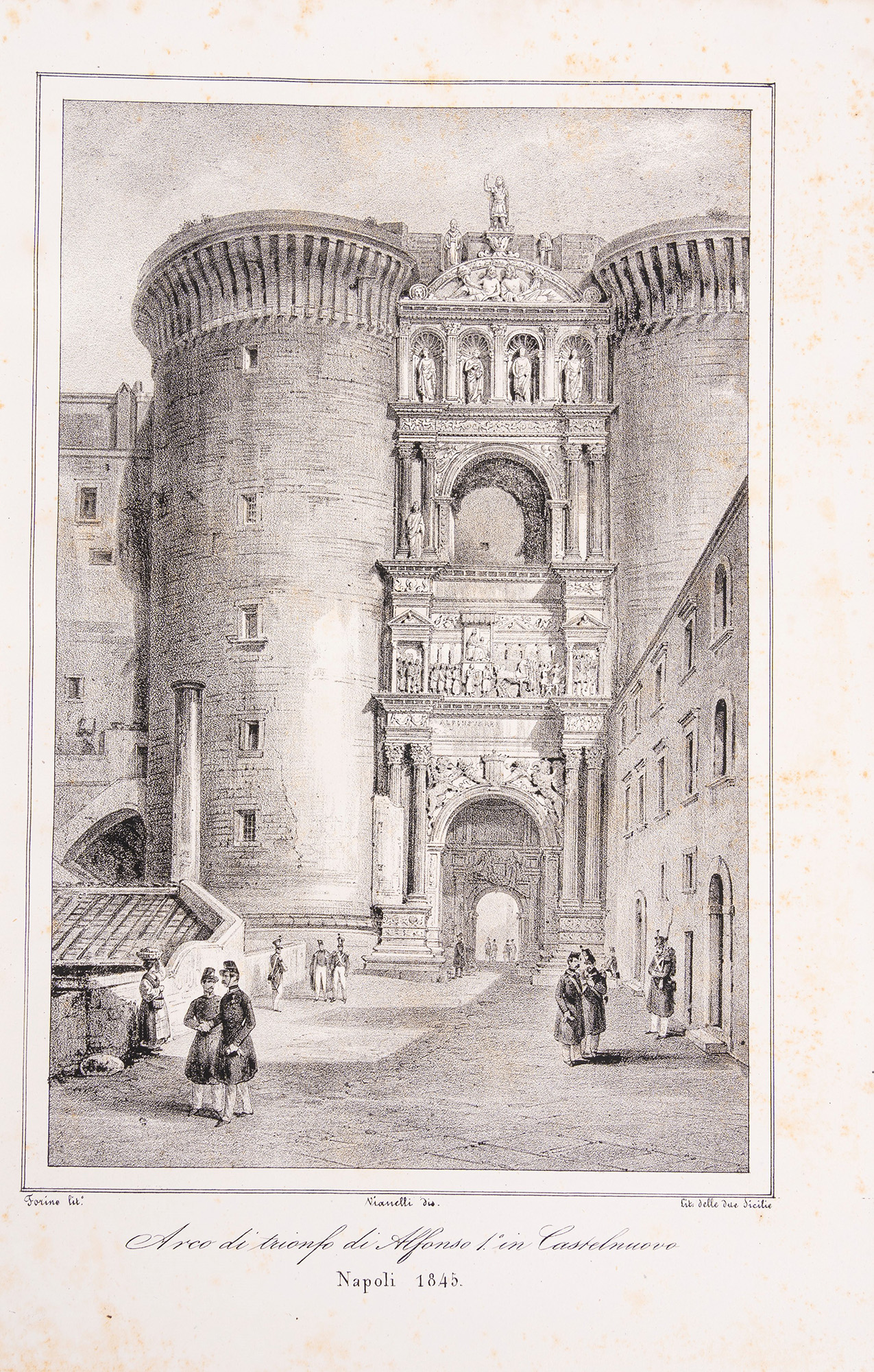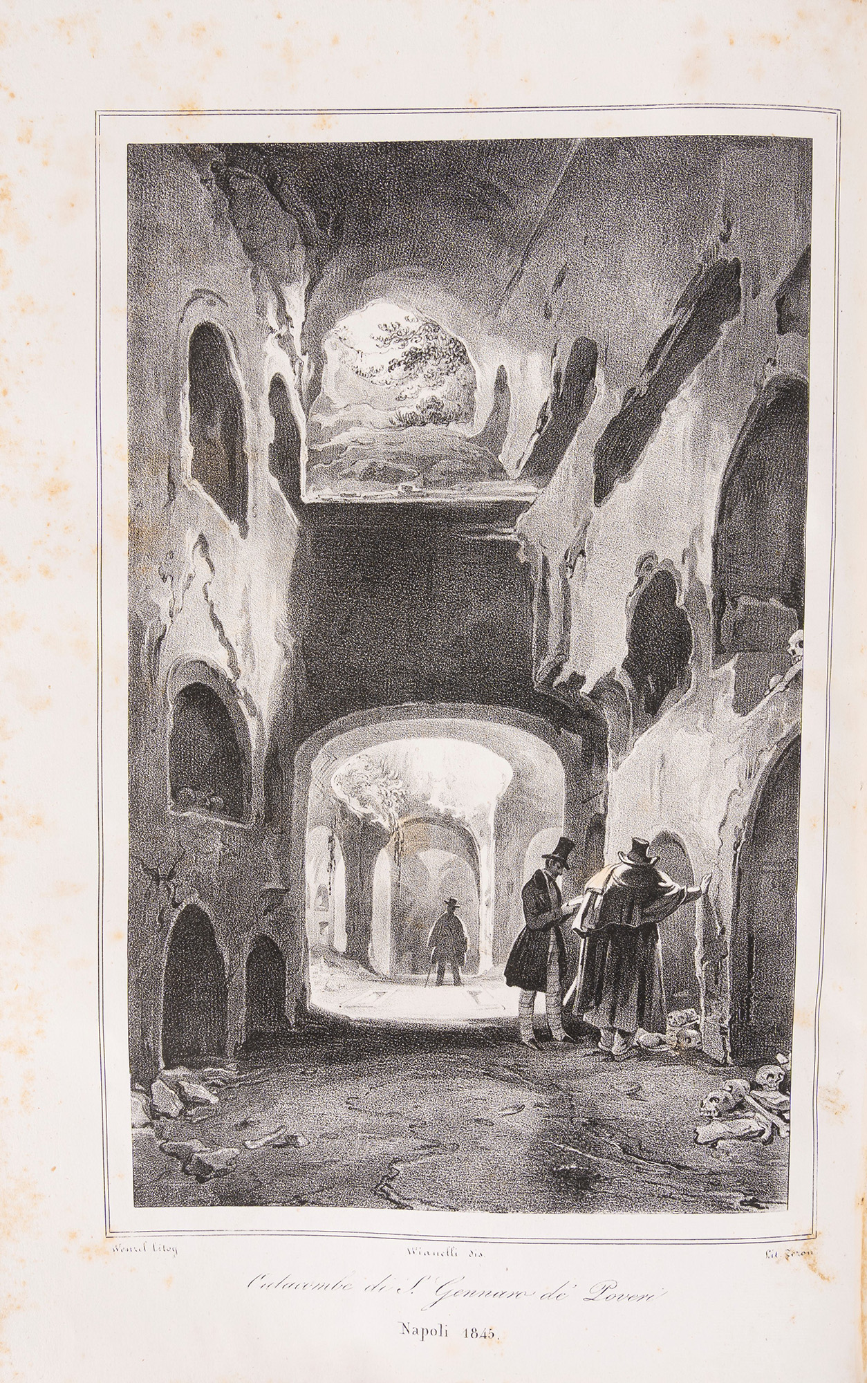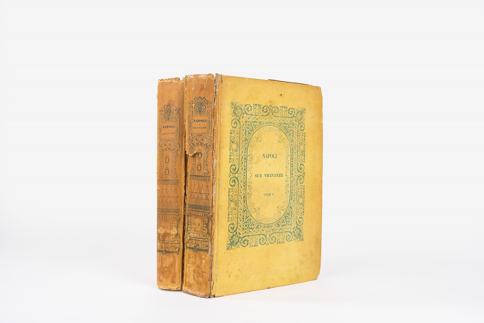 Napoli, Stabilimento tipografico Gaetano Nobile, 1845. In 8° grande. 2 voll. Con 25 tavole litografiche fuori testo protette da velina, 3 carte topografiche ripiegate, quella di Napoli con confini colorati a mano, lievi fioriture, legatura in cartonato editoriale con titolo ai piatti entro ampie ricche cornici in inchiostro blu, dorso del 2 volume parzialmente staccato, lievi difetti.