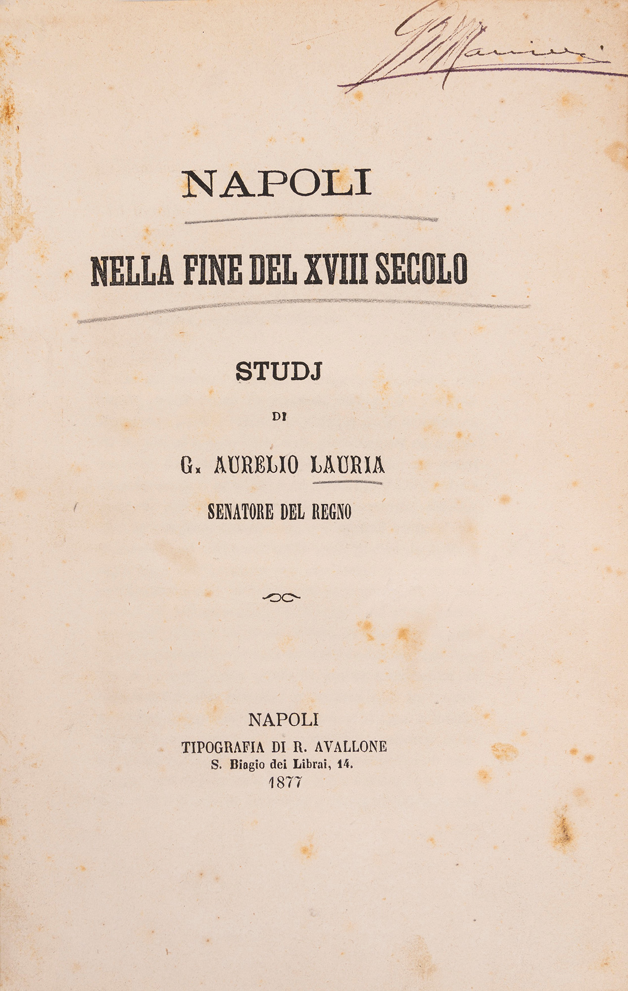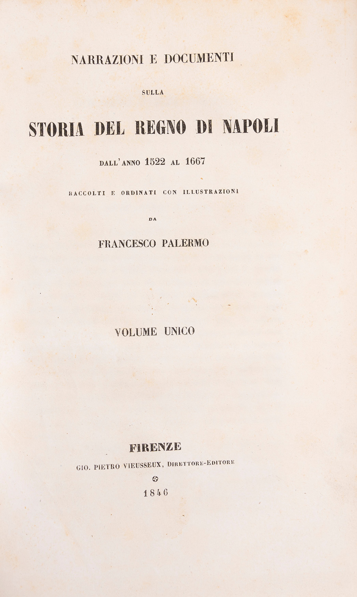 Napoli, Tipografia di R. Avallone, 1877. Legatura moderna in mezza pelle marrone e tela. § Pietro Calà Ulloa. Intorno alla Storia del Reame di Napoli di Pietro Colletta. Napoli, L. De Bonis, 1877. Legatura moderna in mezza pergamena e cartone. § Francesco Palermo. Narrazioni e documenti sulla Storia del Regno di Napoli dall'anno 1522 al 1667. Firenze, Gio. Pietro Vieusseux, 1846. Legatura coeva in mezza pelle marrone e cartone marmorizzato.