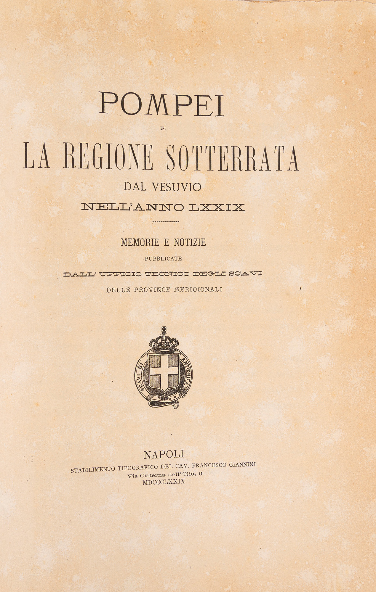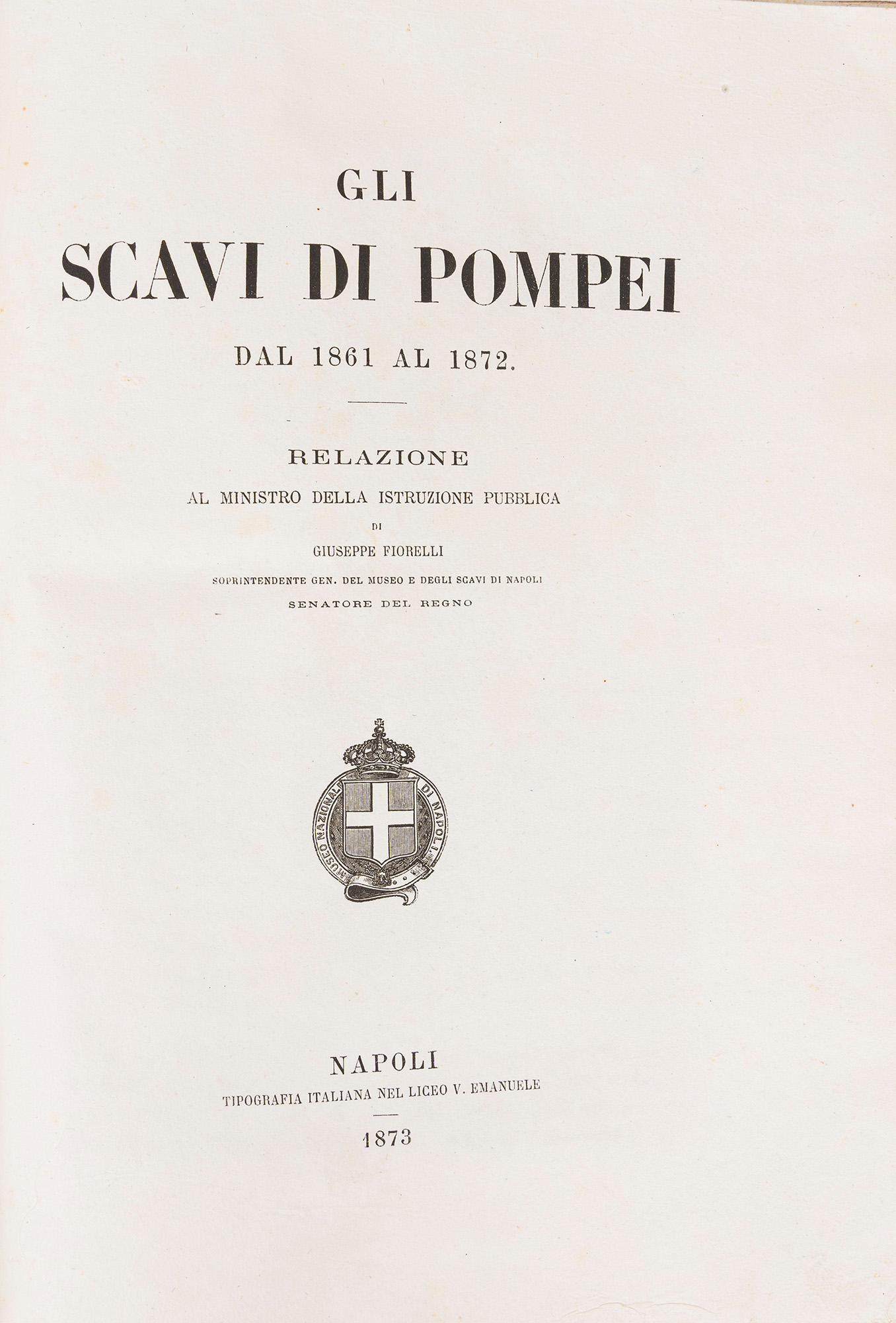 Napoli, Tipografia italiana, 1873. In 2°. Con 20 tavole, di cui diverse a colori, in fine al volume, esemplare con ampi margini, legatura in cartone rigido, titolo in nero al piatto, lievi difetti. § Ruggiero, Michele. Pompei e la regione sotterrata dal Vesuvio nell'anno LXXIX : memorie e notizie. Napoli, Giannini, 1879. In 2°. Con numerose tavole, di cui molte a colori, qualche lieve arrossatura, legatura coeva in piena pergamena rigida, titolo in oro entro tassello al dorso, lievissimi segni del tempo.