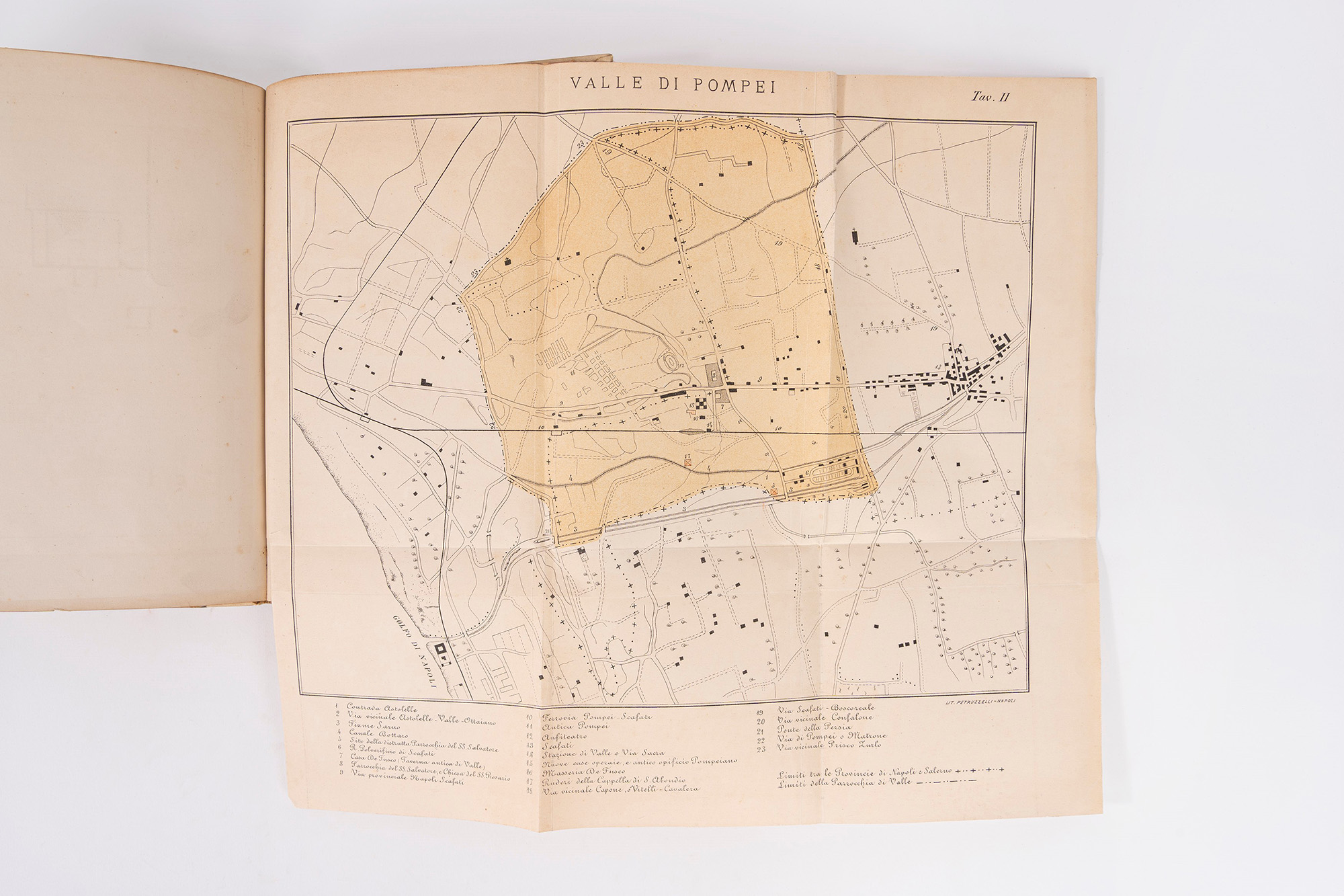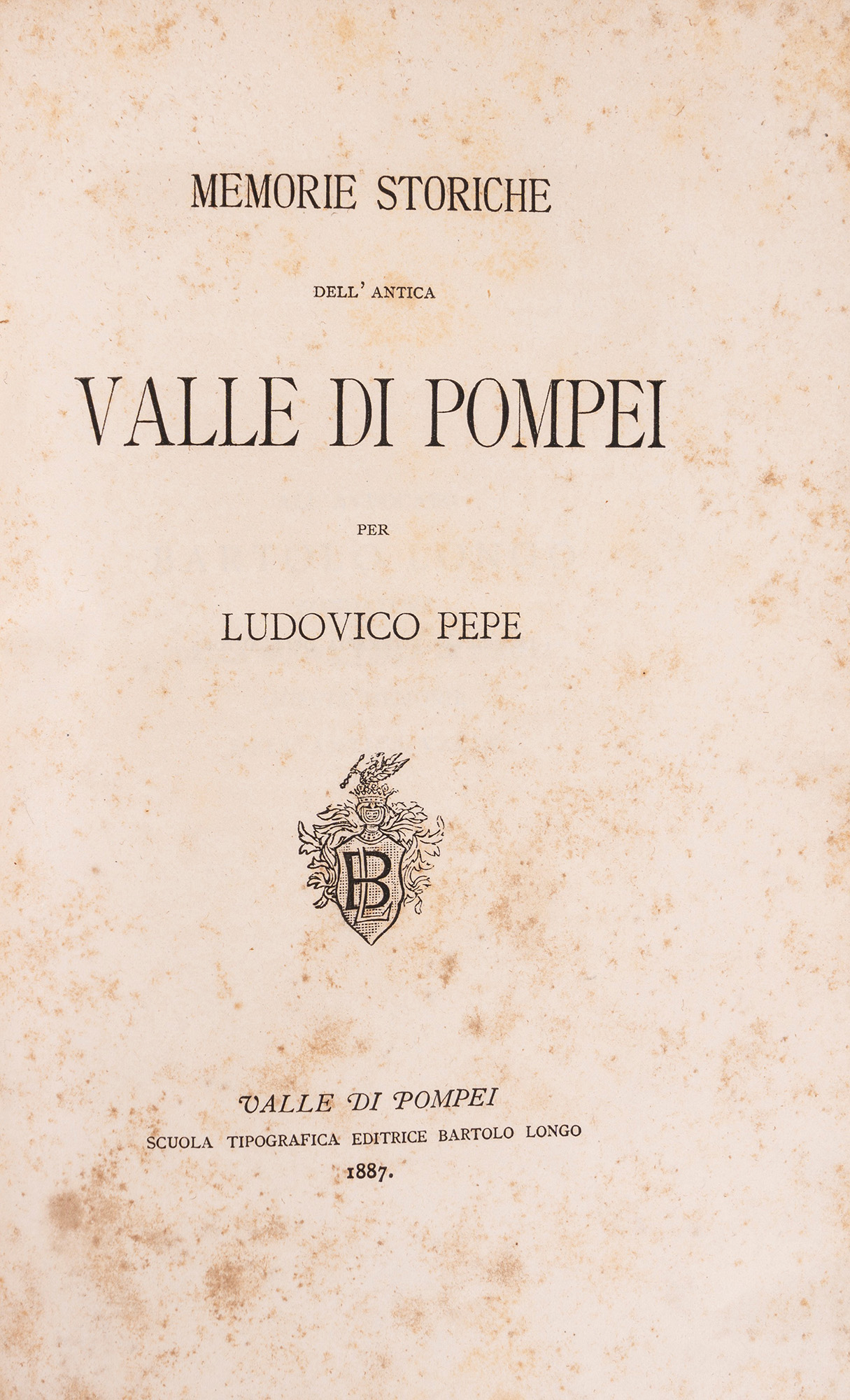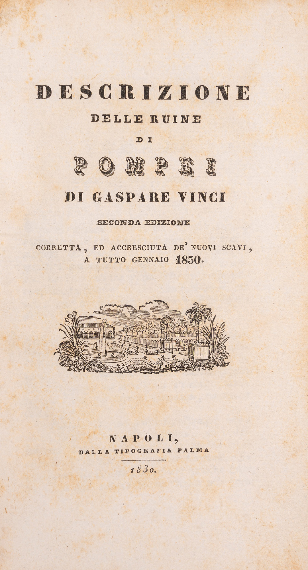 Valle di Pompei, Bartolo Longo, 1887. In 8°. Con un albero genealogico ripiegato della famiglia Piccolomini e due tavole in fine al volume, legatura in mezza pergamena con angoli e carta marmorizzata, titolo in nero al dorso. Ex libris cartaceo al contropiatto. § Romanelli, Domenico. Viaggio a Pompei a Pesto e di ritorno ad Ercolano. Napoli, Perger, 1811. In 8°. Con una bella tavola ripiegata in fine al volume, arrossature, legatura coeva in pelle, piatti decorati con fregi fitomorfi in oro, titolo in oro entro tassello rosso al dorso. § Vinci, Gaspare. Descrizione delle ruine di Pompei, Napoli, Tipografia Palma, 1831. In 8°. Con 4 tavole in fine al volume, fioriture sparse legatura in mezza pelle, lievi difetti.§ Giannone, Pietro. Le ruine di Pompei saggio poetico, Napoli, Tipografia Chianese, 1827. In 8°. Frontespizio brunito, fascicolo allentato, mancanti le ultime due pagine (17-18), rilegato in carta decorata.