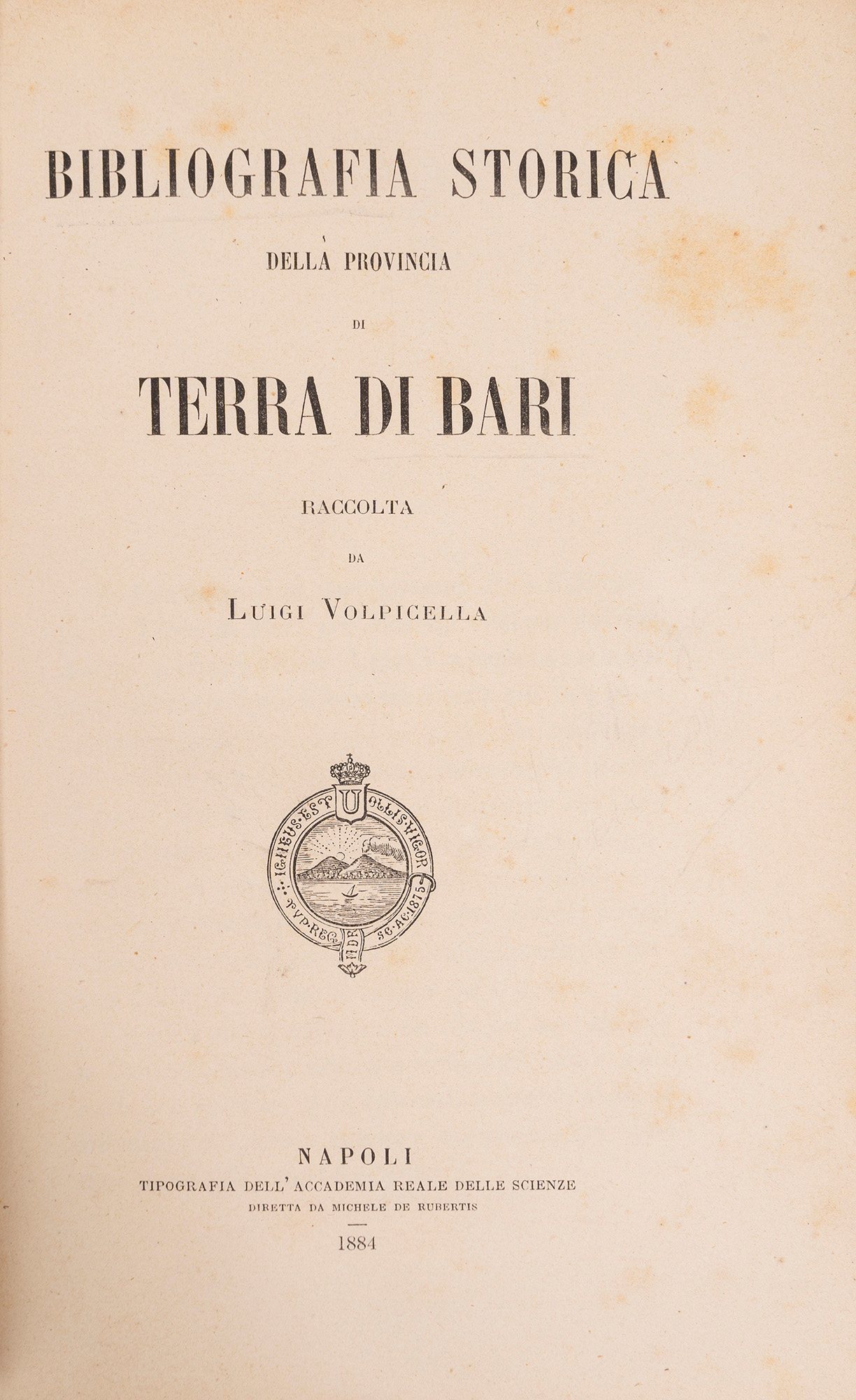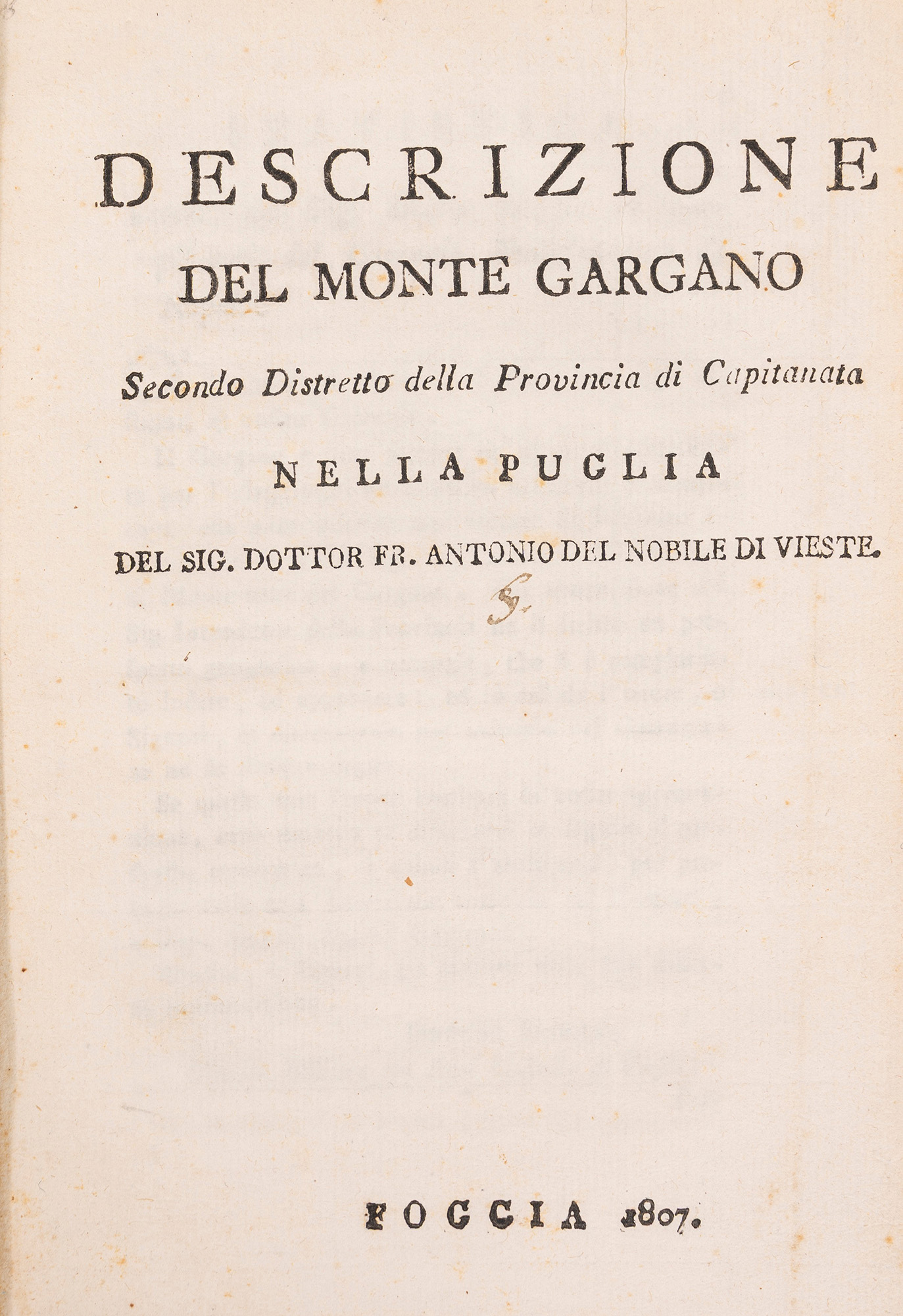 Napoli, Tipografia dell'accademia reale delle scienze, 1884-'87. In 8°. Prime tre carte leggermente staccate dal dorso, piccola nota manoscritta in alto a destra sul frontespizio, leggere fioriture. Legatura in pergamena e titolo in oro entro tassello bordeaux al dorso. § Del Nobile di Vieste A. Fr., Descrizione del Monte Gargano, Foggia, 1807. In 8°. Brossura editoriale in cartoncino.