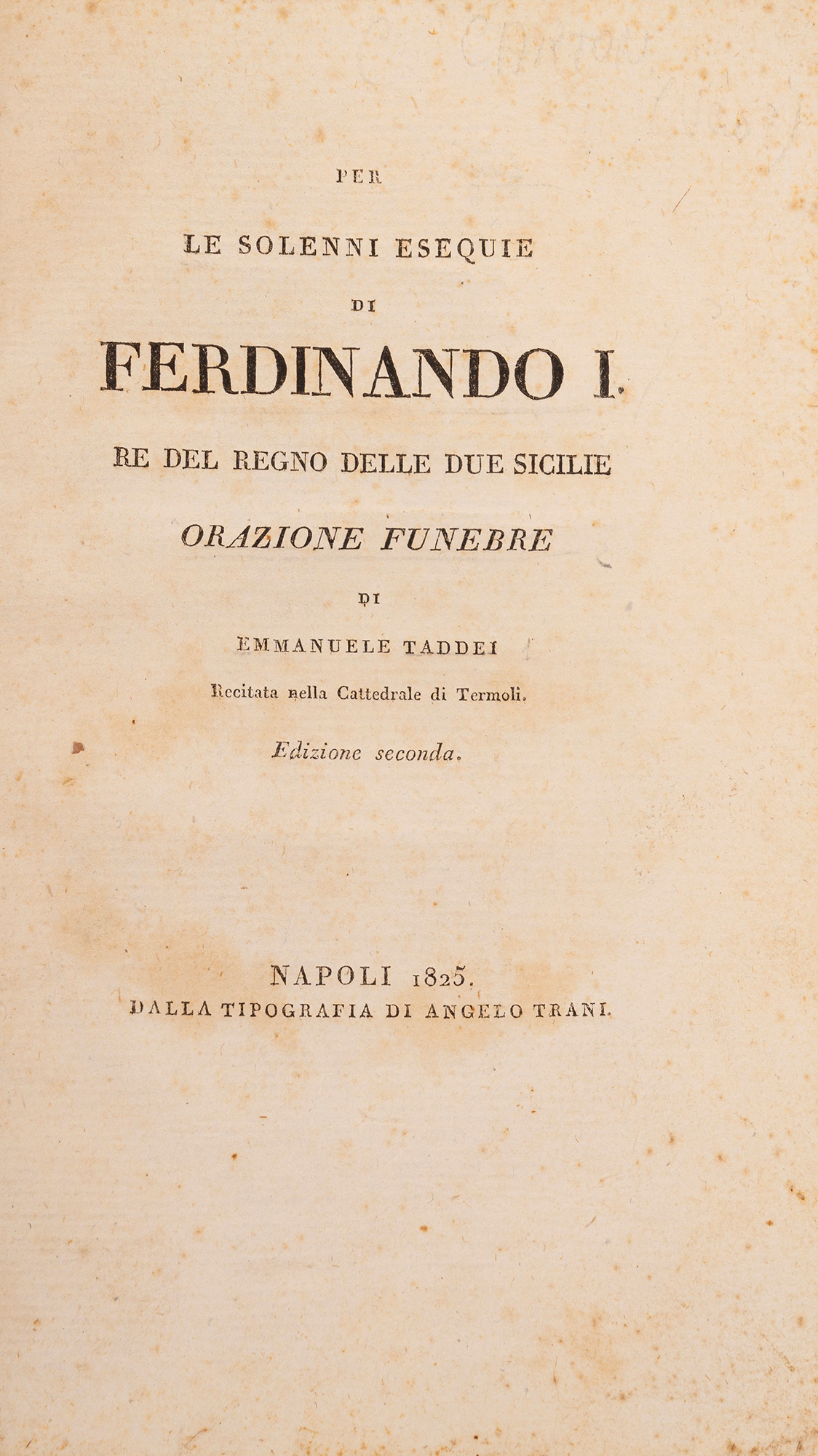 Napoli, Angelo Trani, 1825. In 8°. Lievi fioriture, brossura conservata entro legatura moderna in carta marmorizzata, tassello rosso al centro del piatto con titolo in oro.