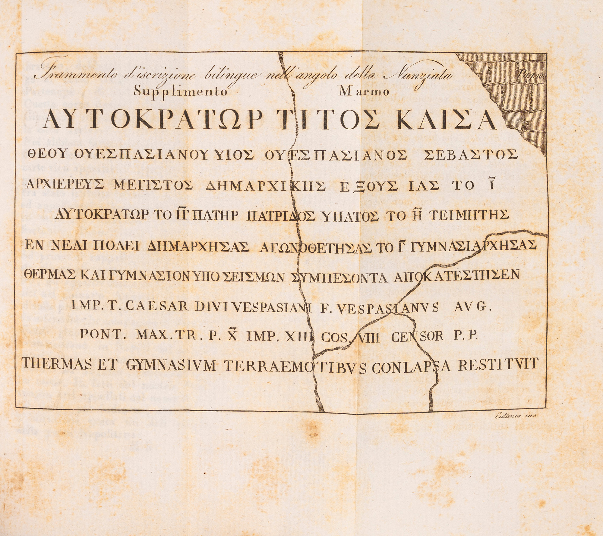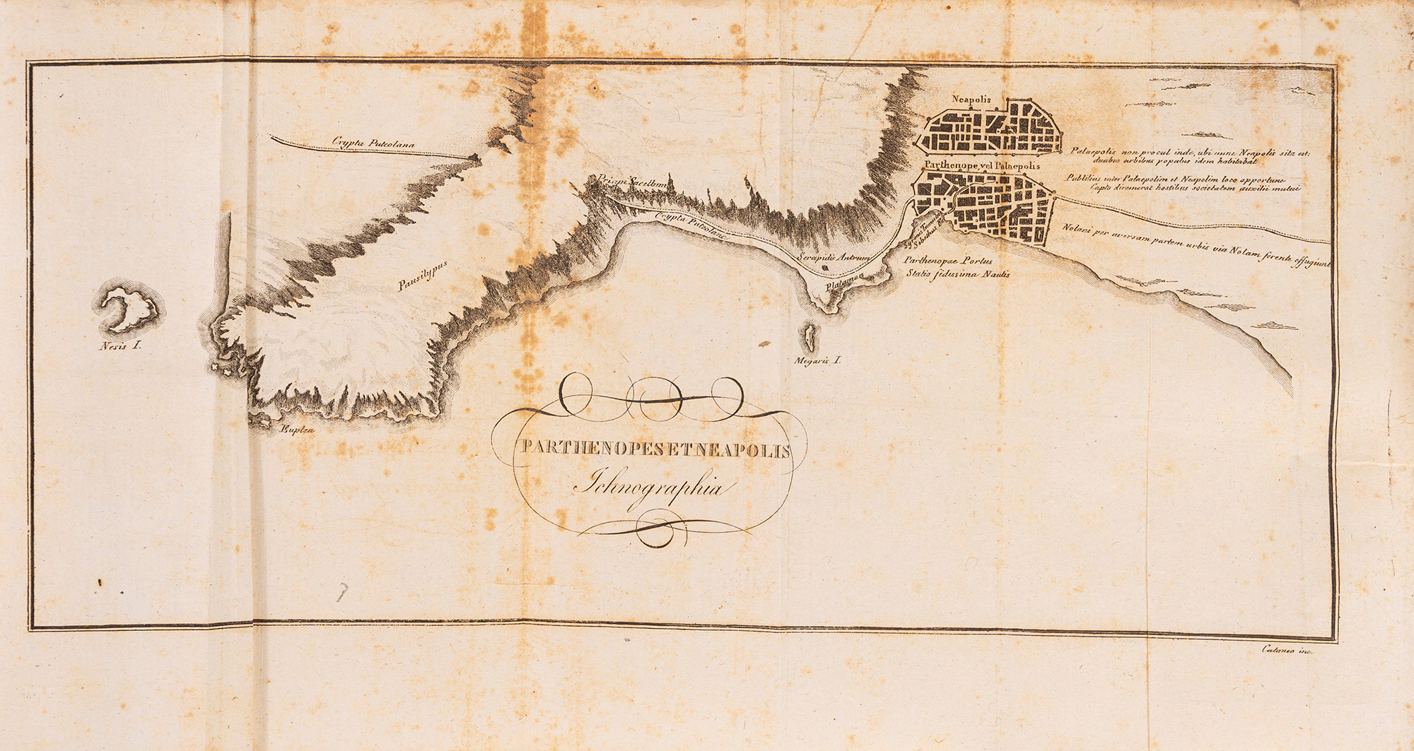 Napoli, Tipografia Angelo Trani, 1815. In-12°. 3 voll.  Con 2 tavole ripiegate (I vol.: 100 e 101, riportante iscrizione angolo della Nunziata, e una in fondo, riportante un'iconografia di Napoli e del golfo, entrambe del Cataneo inc.) e 2 tabelle in fine al III volume, lievi fioriture, legature coeve in mezza pelle e carta marmorizzata, titoli in oro al dorso, lievi difetti. Ex libris cartacei al contropiatto.§ Peccheneda, Francesco. Notizie generali sull'Antica Napoli, Napoli, Tipografia Chianese, 1827. In 8°. Fioriture e bruniture, legatura moderna in mezza pergamena con angoli e carta marmorizzata.