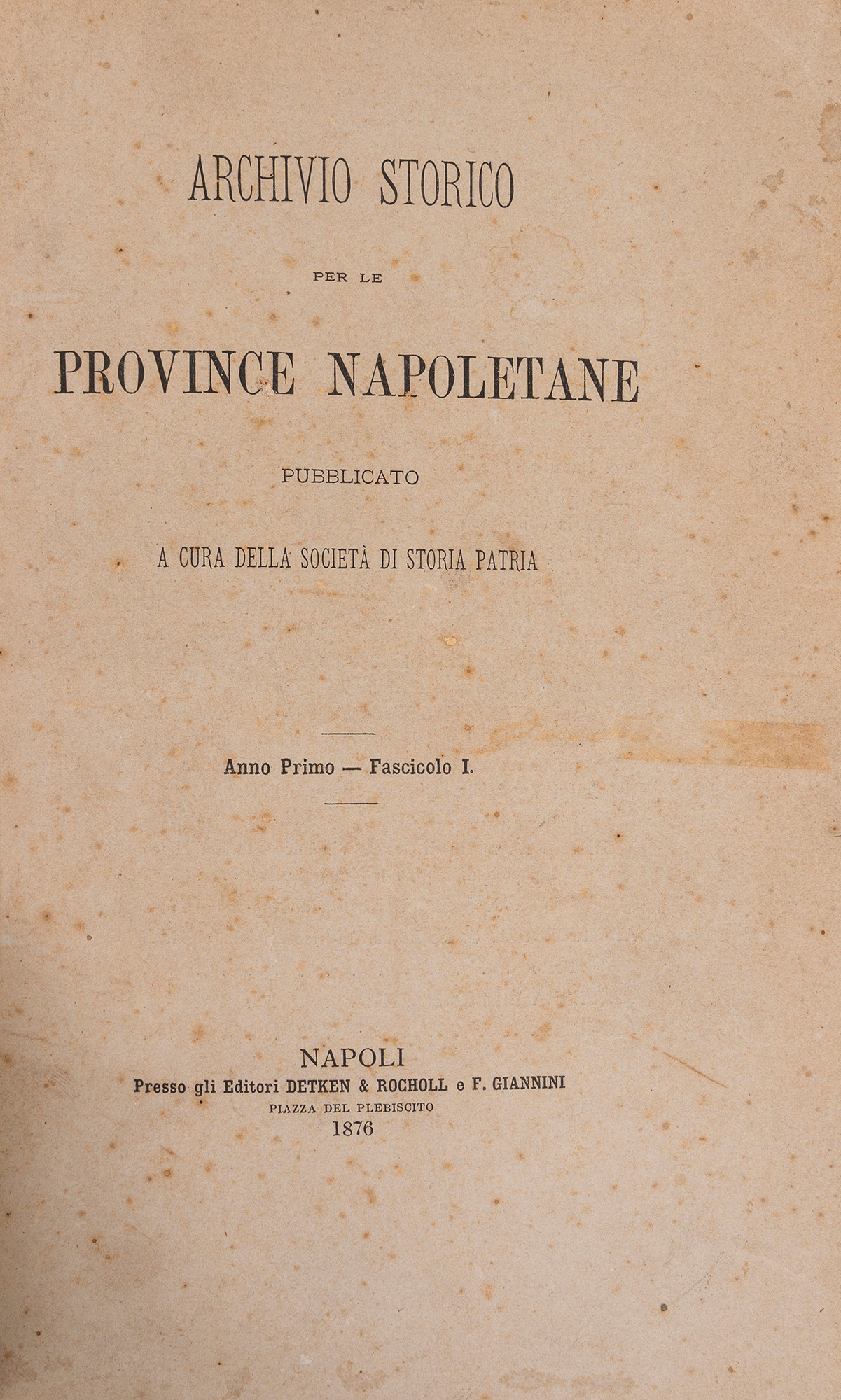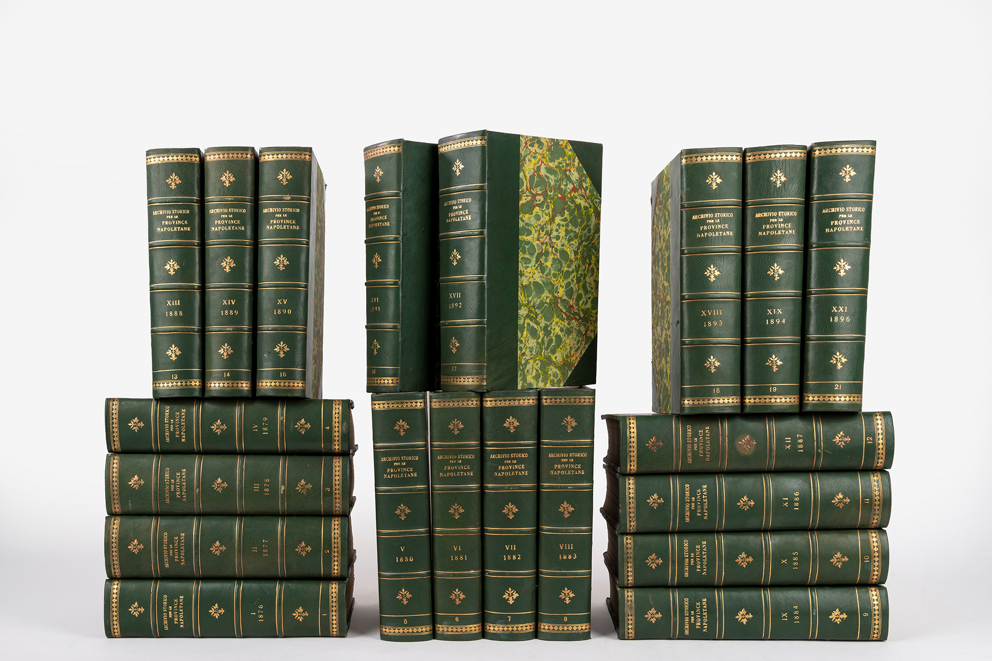 Napoli, Detken & Rocholl e F. Giannini, 1876-1896. In 8°. 20 voll. numerati I-XXI. Mancante il vol. XX relativo all'anno 1865. Brossure originali conservate entro belle legature in marocchino verde con angoli e carta marmorizzata, titoli in oro al dorso.