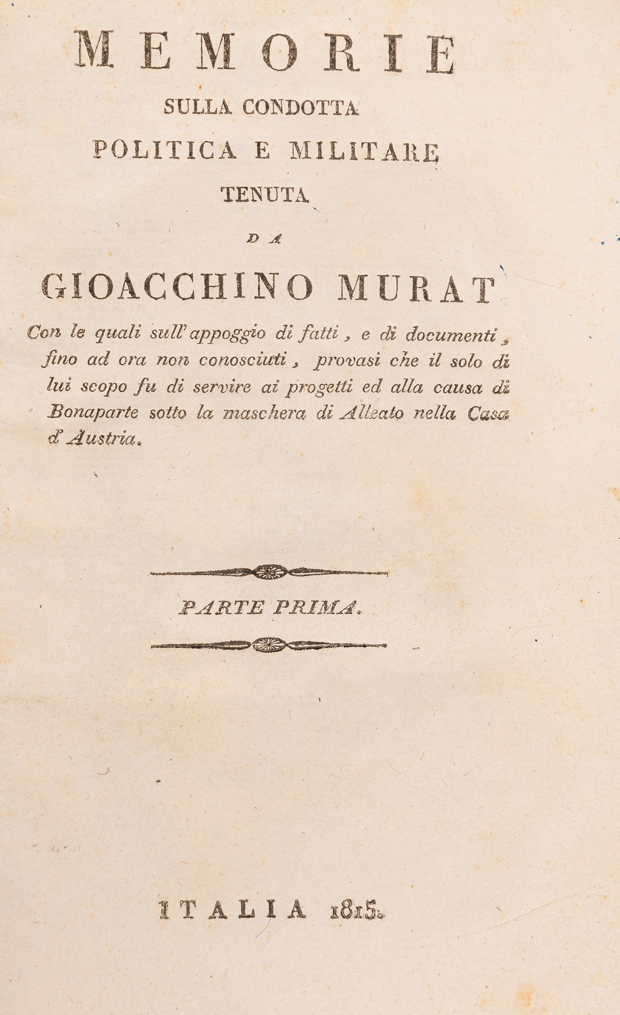 Napoli, Luigi Chiurazzi Librajo-editore, 1862. 3 voll. in un tomo, In 4°. Ritratto di Gioacchino Murat in antiporta. Legatura in mezza pelle verde e piatti marmorizzati. § Memorie sulla condotta politica e militare tenuta da Gioacchino Murat, Real Tipografia Militare, 1815. In 8°. Legatura in mezza pelle verde con angoli e piatti marmorizzati.