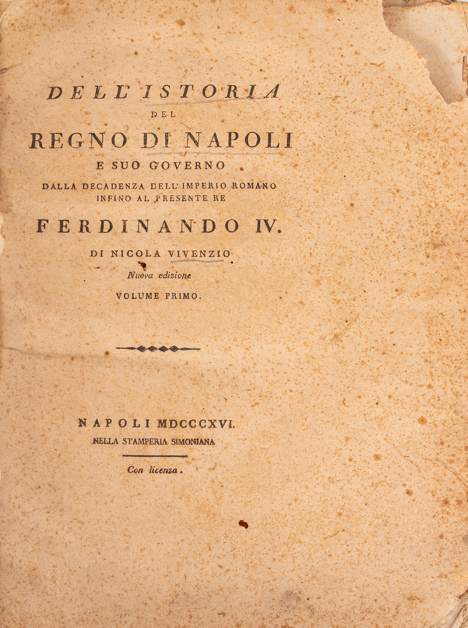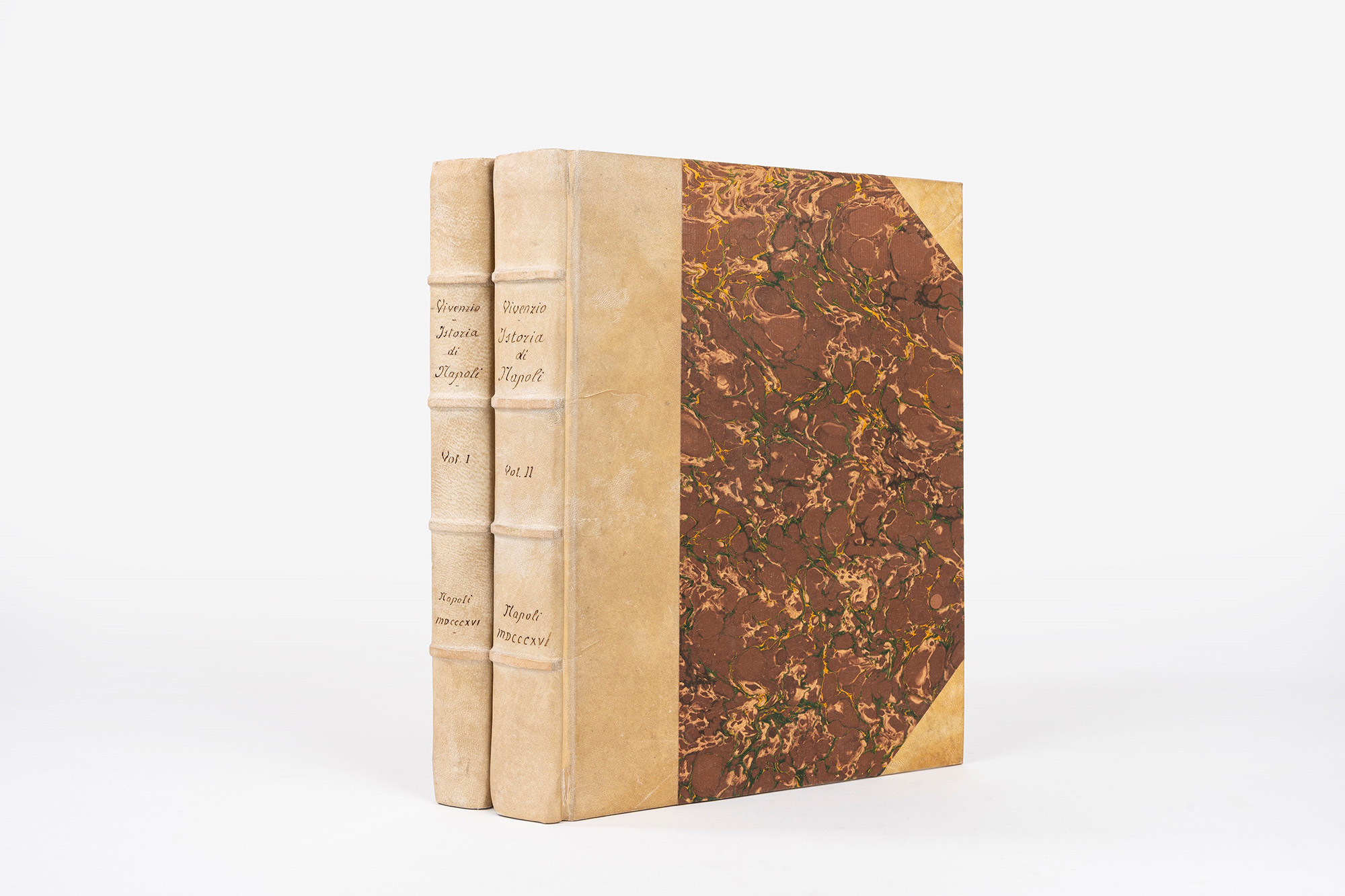 Napoli, Stamperia Simoniana, 1816. In 4°. 2 voll. Esemplari in barbe leggermente bruniti, qualche fioritura, al I volume difetti alle prime carte, al II volume frontespizio mancante supplito da carta manoscritta, legatura posteriore in mezza pergamena con angoli e carta marmorizzata, titolo manoscritto al dorso.