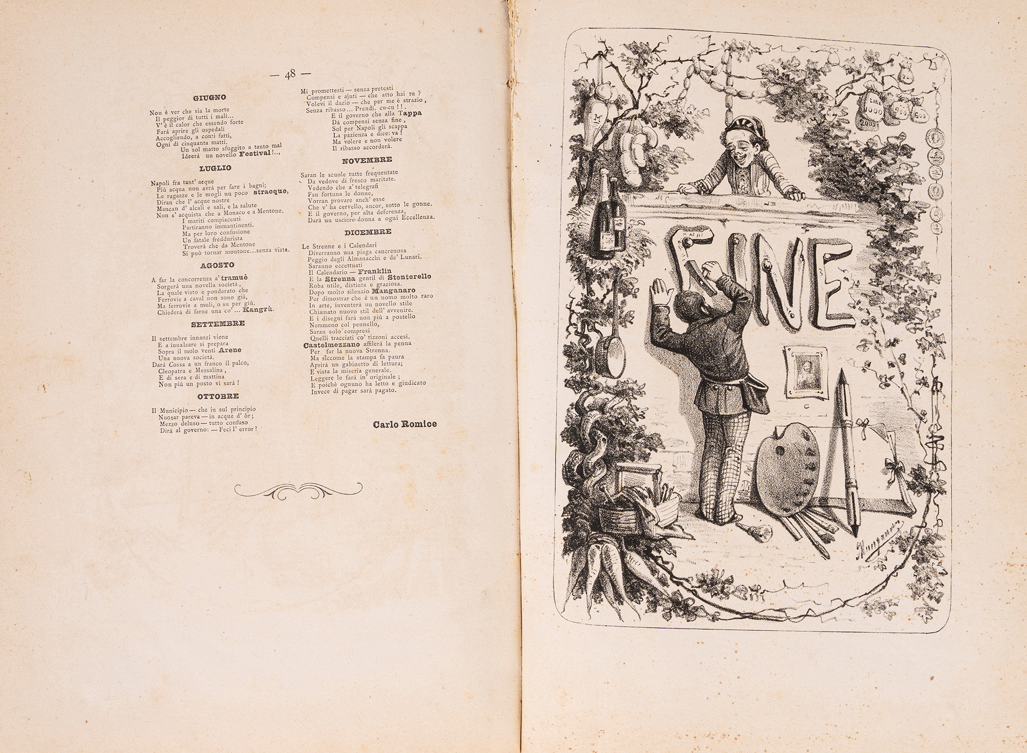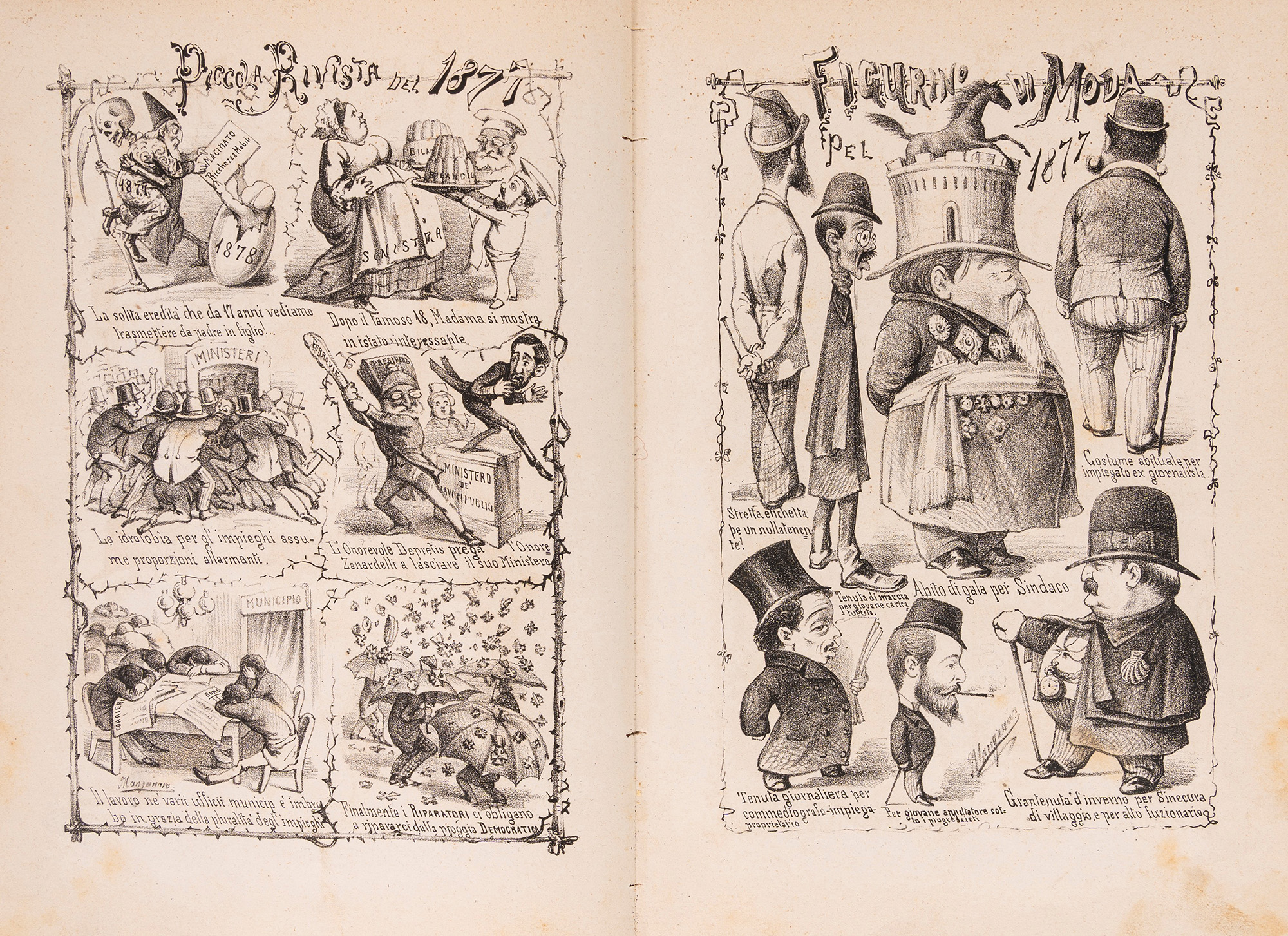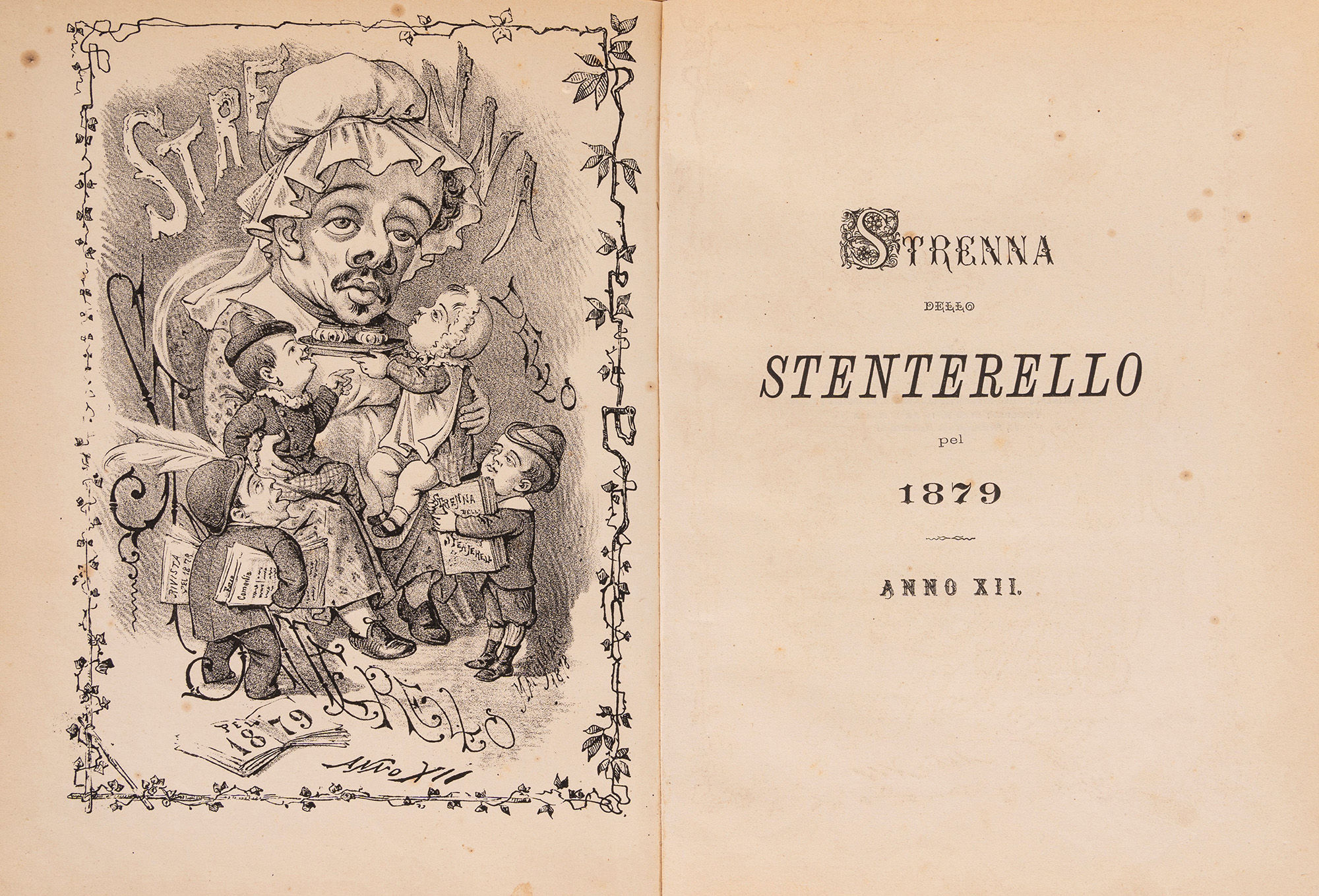Napoli, De Angelis e figlio, 1879. In 8°. Con numerose illustrazioni nel testo, lievi bruniture e fioriture, legatura in mezza tela e cartoncino rigido, con al centro dei piatti ritratto di donna inquadrato da cornice floreale e fregi dorati in rilievo, lievi difetti. Insieme nel lotto altre 3 Strenne: Strenna dello Stenterello pel 1877; Strenna dello Stenterello pel 1878; La Sirena Augurio pel Capodanno Anno X, Napoli, Stamperia del Fibreno, 1856 (piatto anteriore staccato).