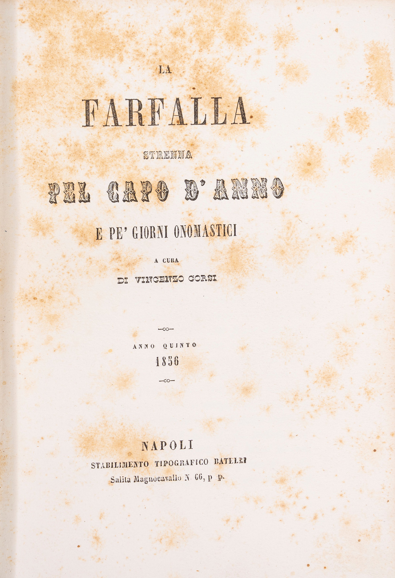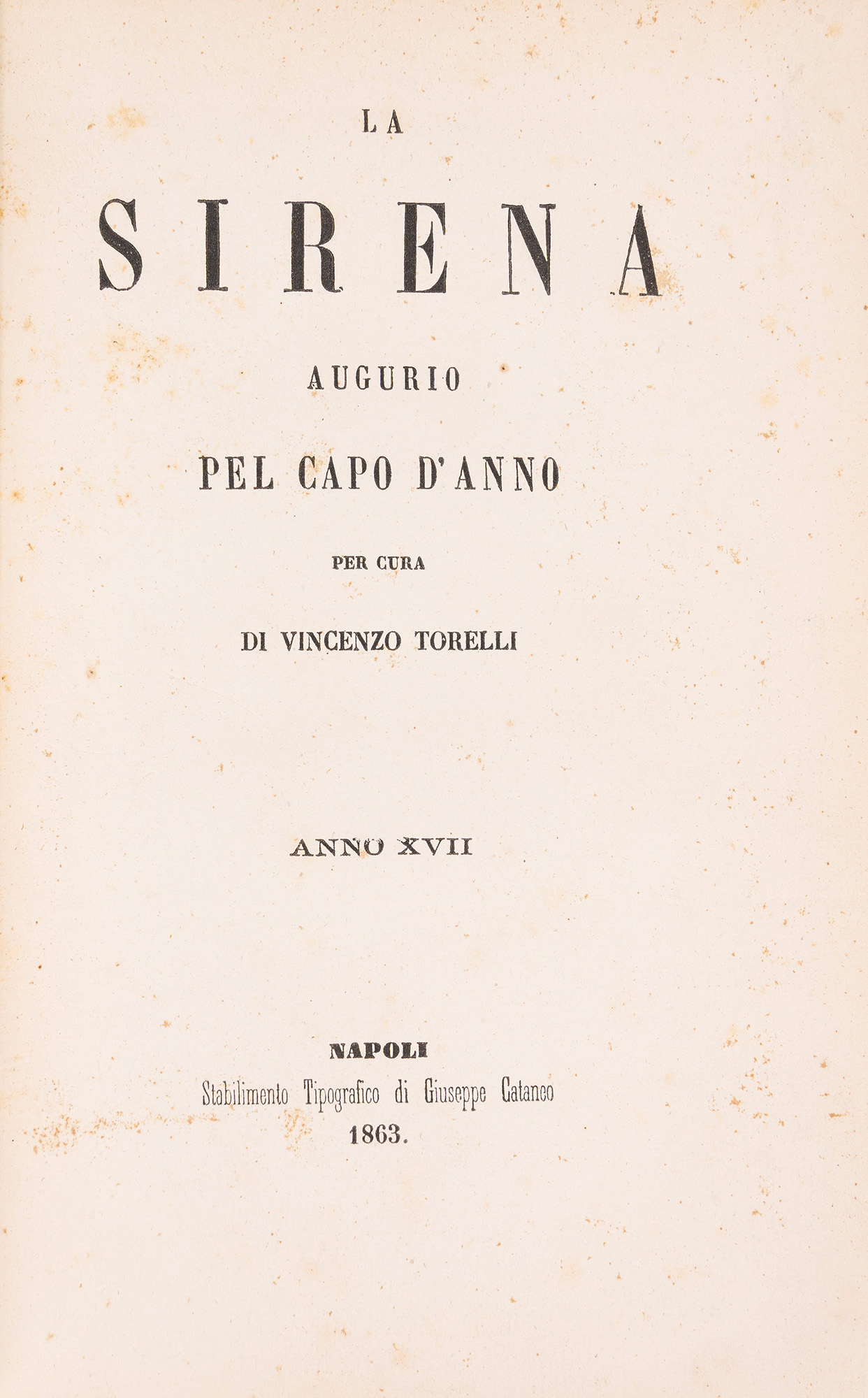 Napoli, Stamperia del Fibreno, 1851. In 4°. Vignetta al frontespizio disegnata da Ciuli e incisa da Pisanti, altre incisioni nel testo, uno spartito su due fogli ripiegati in fine volume. Bella legatura editoriale in cartone con decorazioni a rilievo. Nel lotto altre due strenne, La Sirena dell'anno 1863 e La Farfalla del 1856.