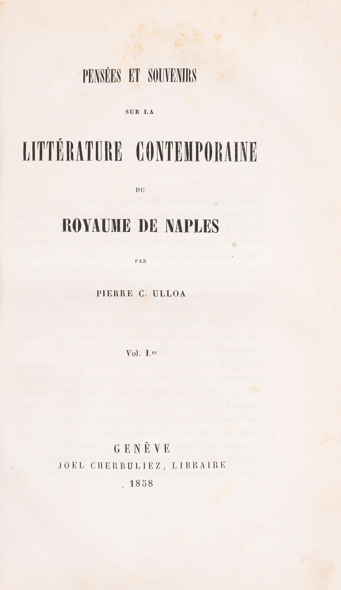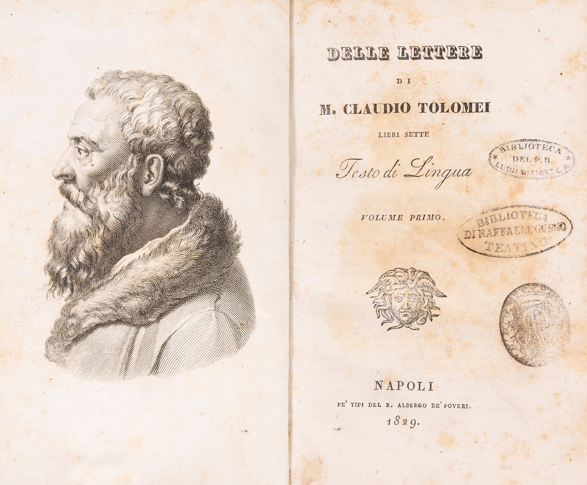 Genève, Joel Cherbuliez, 1858. In 4°. Due parti in un volume, legatura coeva in mezza pelle marrone. § G. Gozzoli. Gli Artisti viventi. Roma, Forzani e C., 1881. In 4°. Ritratti incisi nel testo, legatura editoriale in tela rossa. Insieme nel lotto un'edizione napoletana delle Lettere di Claudio Tolomei datata 1829, 2 voll.