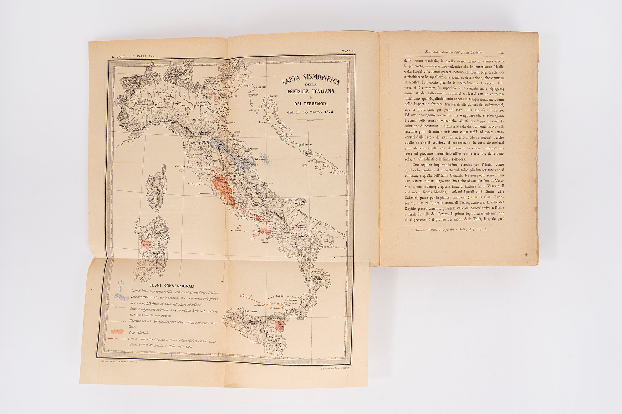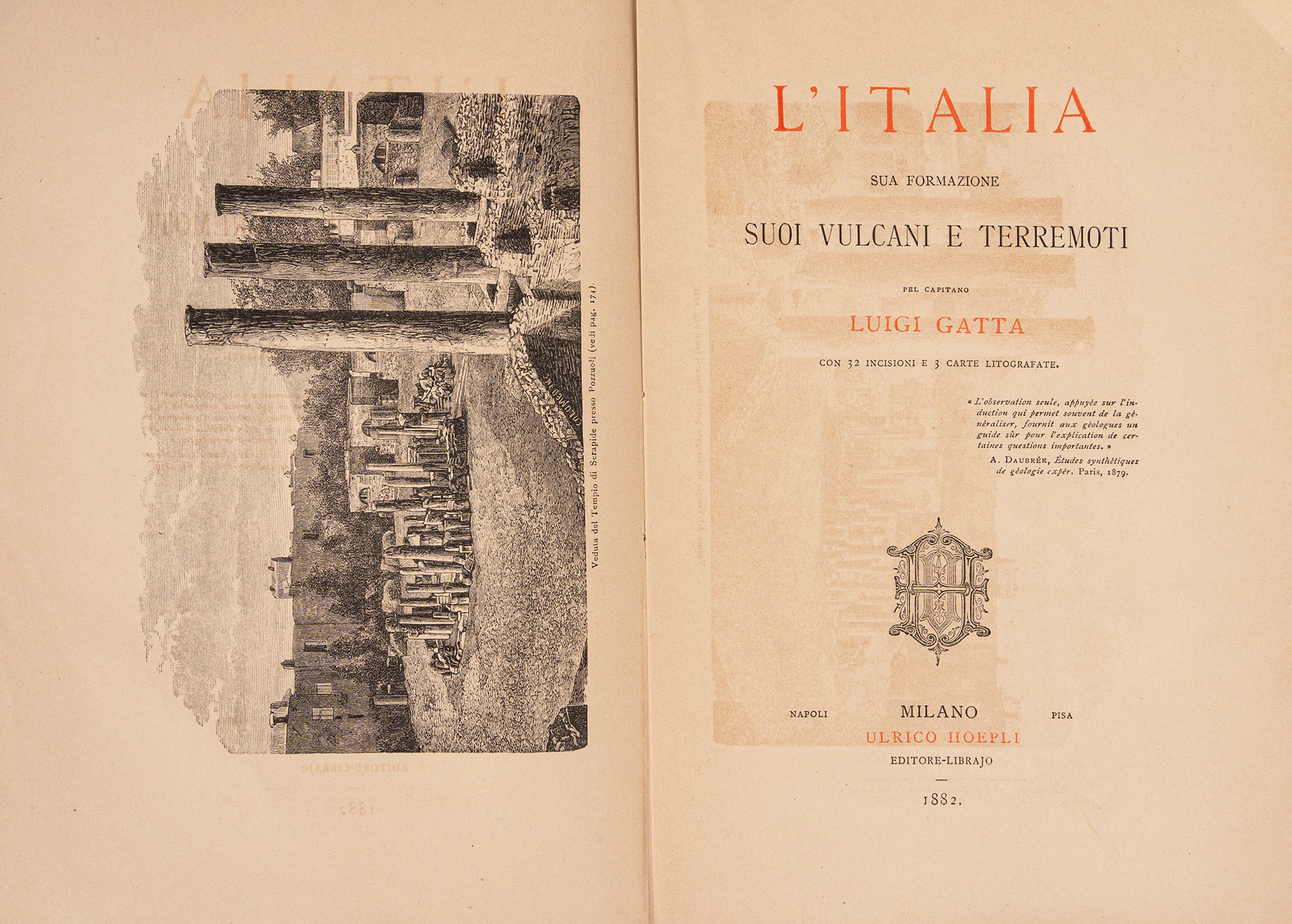 Napoli, Giuseppe Colavita, 1857. In 8°. Fregio xilografico al frontespizio, lievi fioriture, brossura editoriale (piccole mancanze e difetti) entro legatura in mezza tela con angoli e carta marmorizzata, titolo in oro al dorso. § Gatta, L. L'Italia sua formazione suoi vulcani e terremoti. Milano, Hoepli, 1882. In 8°. Con numerose tavole, alcuni fascicoli allentati, brossura editoriale con titolo in rosso e nero, difetti al dorso, segni d'usura.