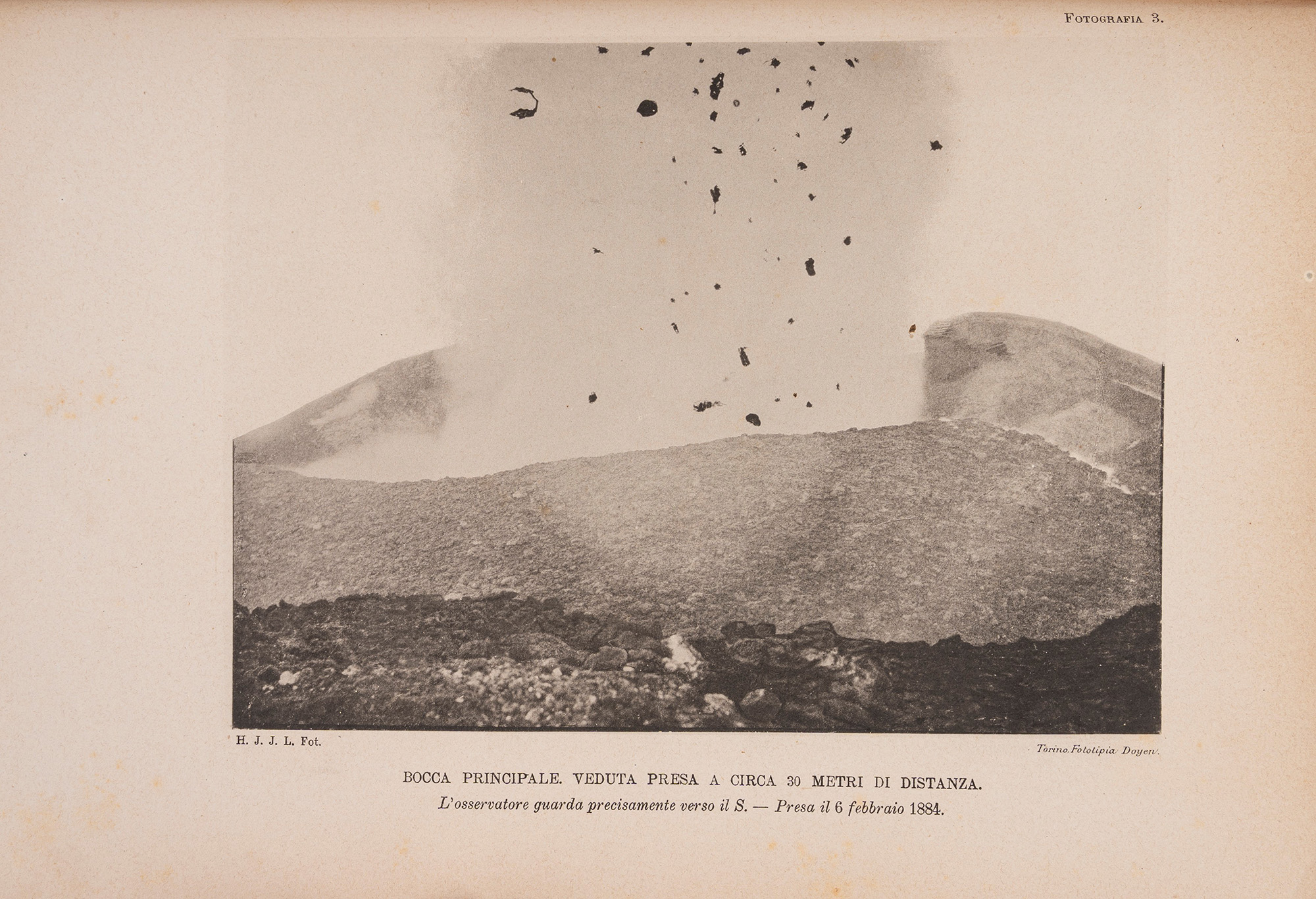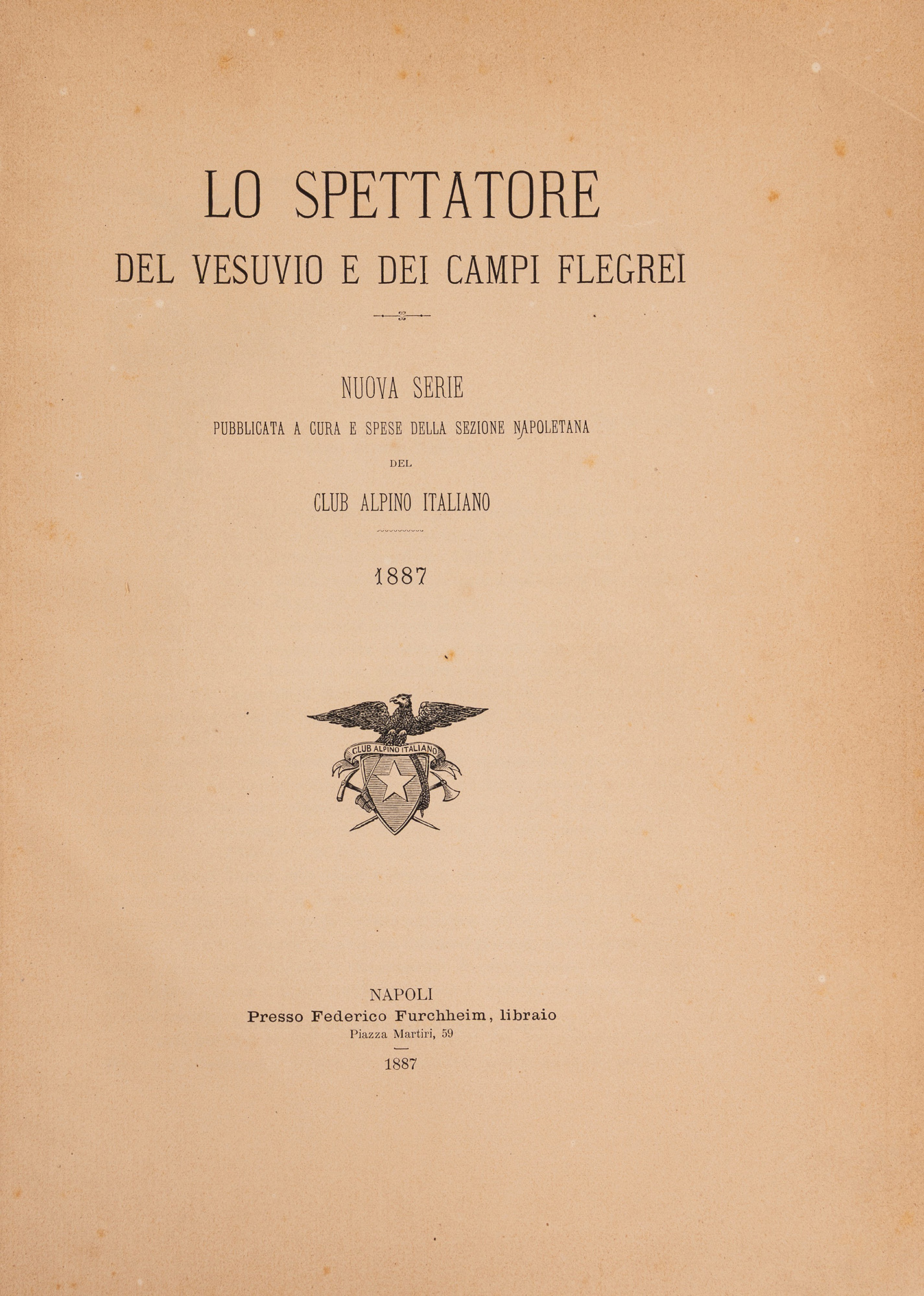 Napoli, Federico Furchheim, 1887. In 4°. Con 13 tavole di riproduzioni fotografiche del Vesuvio in fine al volume, leggera brunitura, legatura in cartone rigido, titolo al piatto anteriore, piatto anteriore e carta di guardia staccati, alcuni difetti.