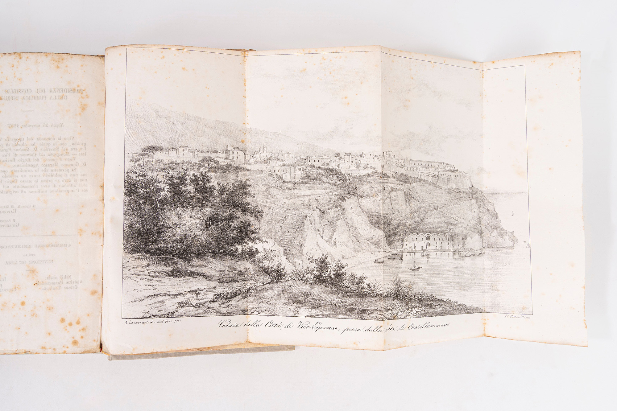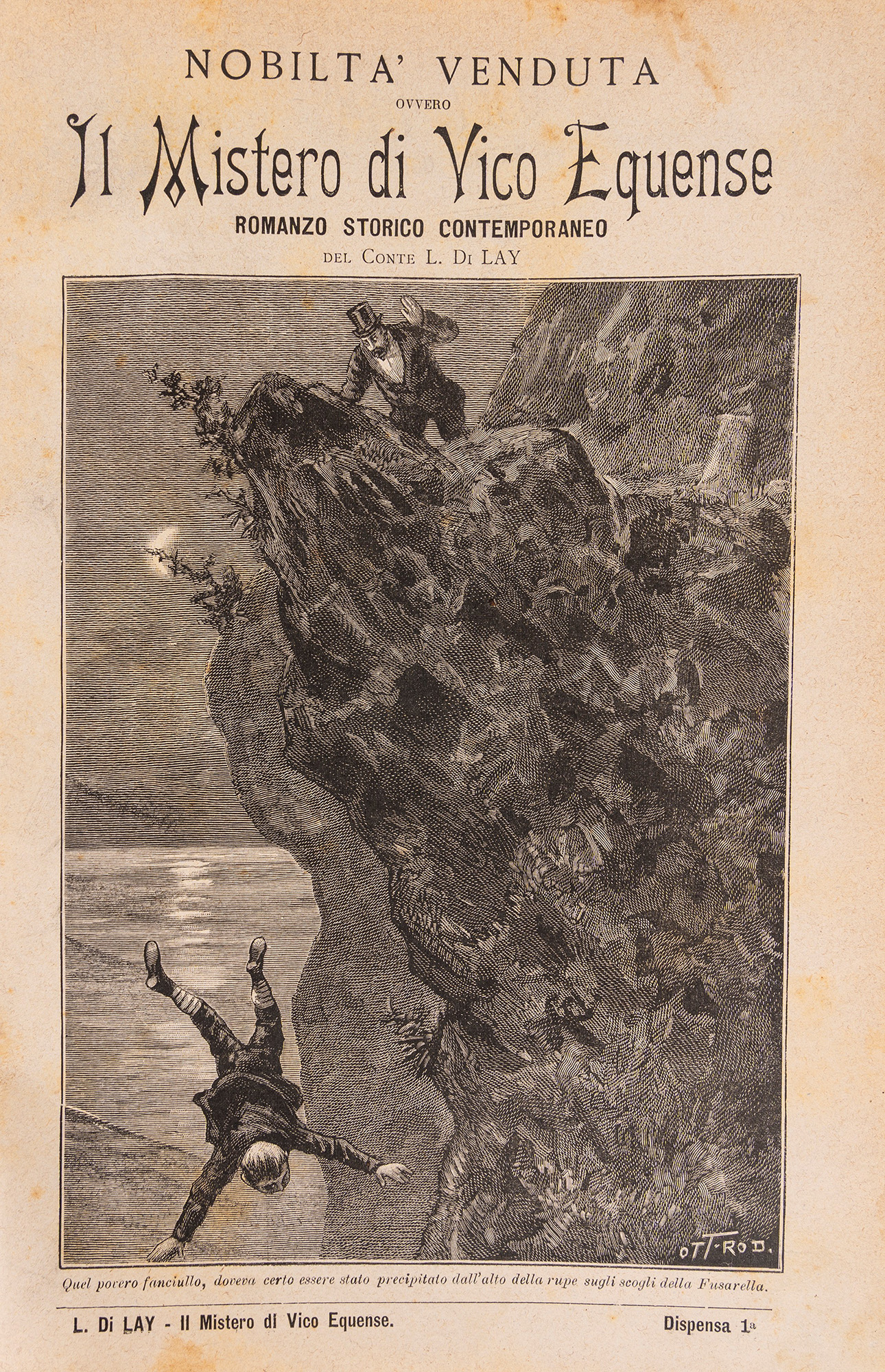 Napoli, Vincenzo Priggiobba, 1858. In 4°. Veduta ripiegata in fine volume di Vico Equense presa dalla strada di Castellammare, disegnata da Lavezzari e incisa da Gatti e Dura, 220 x 315 mm., marginali fioriture ma ESEMPLARE IN BARBE, legatura moderna in tela chiara che conserva le brossure originali, sciupate. § Conte L. Di Lay. Nobiltà venduta ovvero Il Mistero di Vico Equense Romanzo storico contemporaneo. Roma, Edoardo Perino, 1895. Serie di 25 dispense rilegate assieme, legatura in mezza tela marrone e cartone marmorizzato, sciupata.