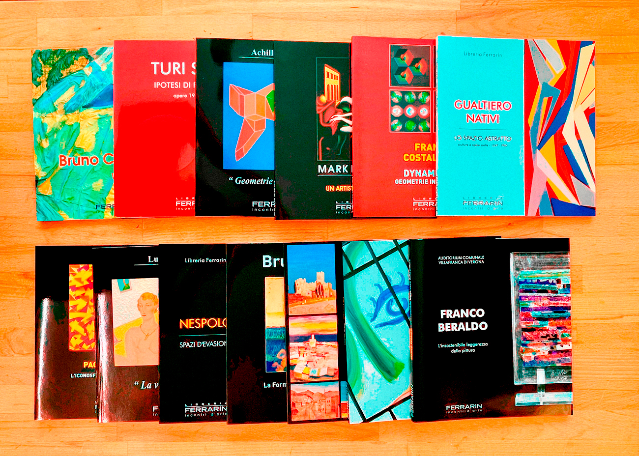 Interessante lotto di 13 cataloghi editi dall Galleria Ferrarin, Legnago, relativi ai seguenti artisti: Achille Perilli, Mark Kostabi, Franco Costalonga, Luca Linari, Paola Bernardi, Gualtiero Nativi, Bruno Saetti, Virgilio Guidi, Salvatore Magazzini, Franco Beraldo, Ugo Nespolo, Turi Simeti e Bruno Ceccobelli