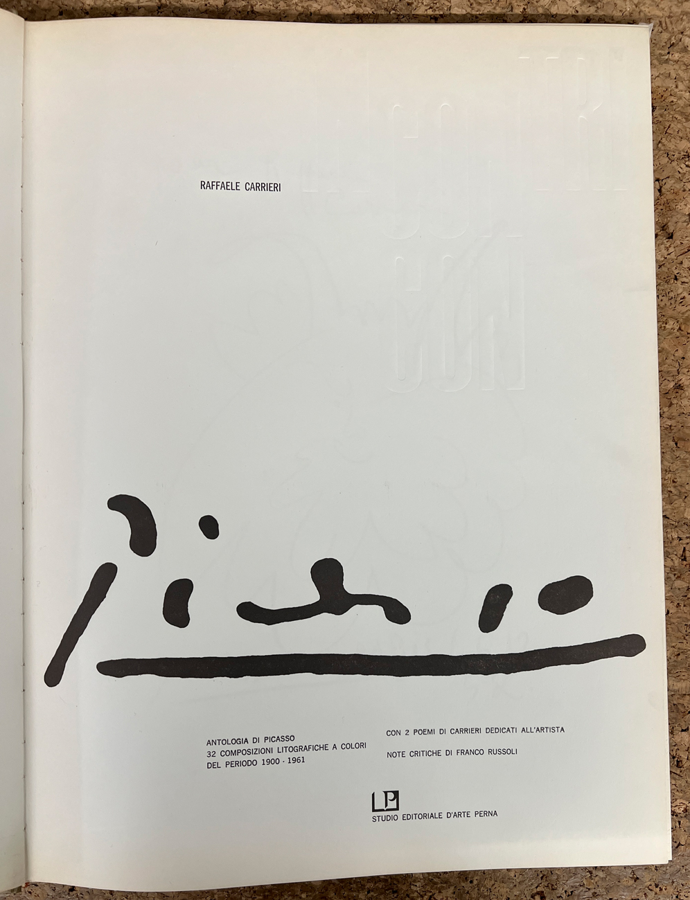 Volume contenente 32 composizioni litografiche a colori del periodo 1900-1961 di Pablo Picasso, 2 poemi di Raffaella Carrieri dedicati all'Artista e note critiche di Francesco Russoli e una tavola a colori fuori testo, entro cartellina protettiva