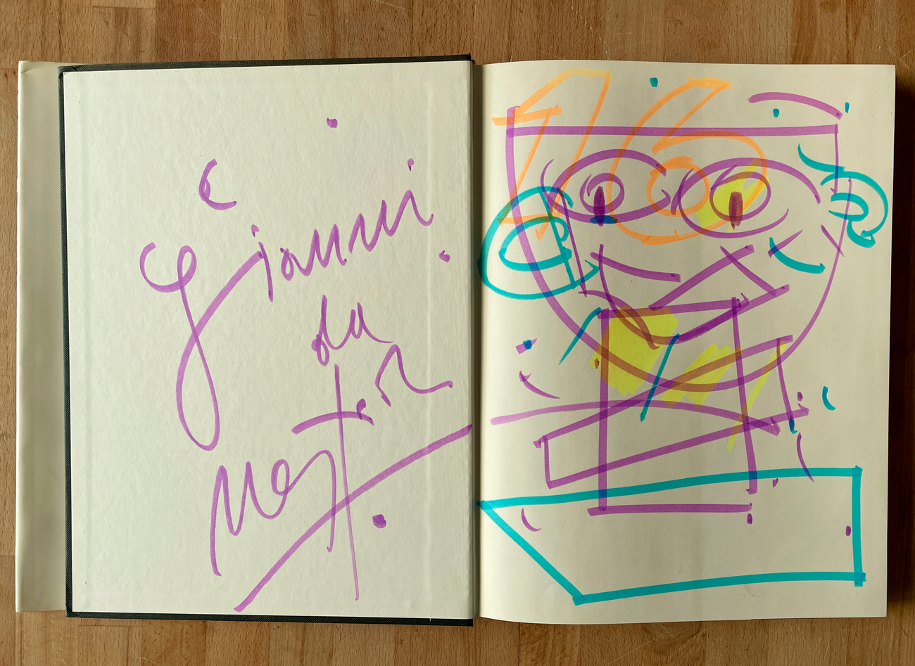 Reca disegno, firma e dedica dell'Artista a pennarelli colorati all'interno