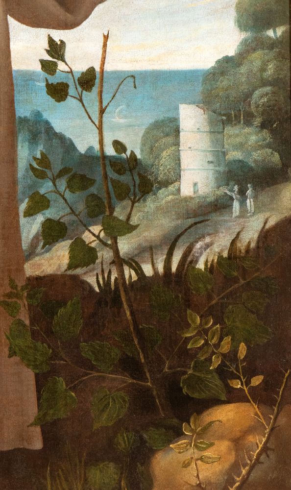 On the basis of formal quality, compositional design, and treatment of light, the work is attributable to Tommaso Bona, active in the second half of the sixteenth century and trained within the tradition of Savoldo and Moretto. The isolated figure, controlled chromatic contrasts, and atmospheric landscape recall the artist’s early phase, still rooted in Renaissance models, in a cultural context preceding full engagement with Venetian Mannerism.