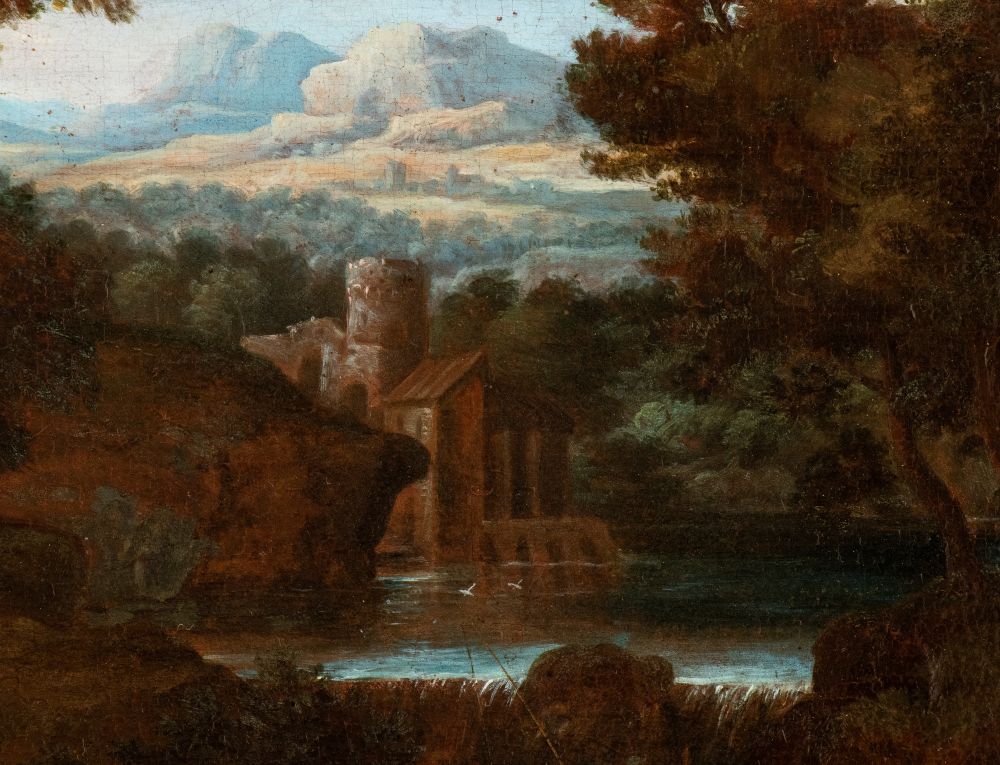 Landscape with a small waterfall, figures, and a castle Oil on canvas cm. 49,5x64,5. Framed Private collection, Lazio.