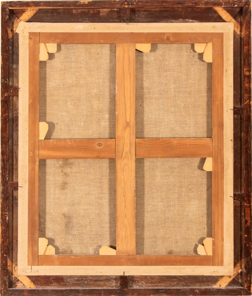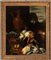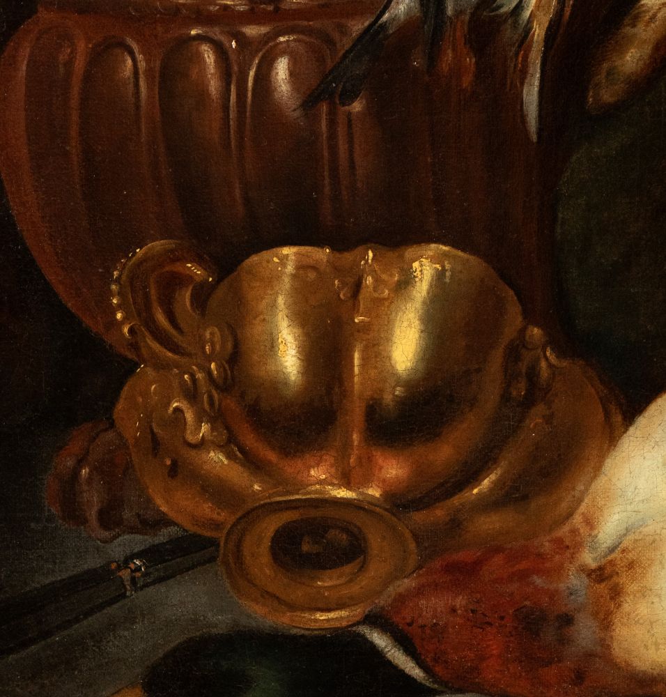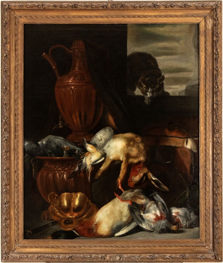 Still life with game, cat, and metalware Oil on canvas cm. 96,5x82. Framed This high-quality still life presents a particularly elaborate composition, combining game laid out on a ledge - including various birds and a hare - refined metal vessels, and a curious cat peeking from an open window in the background, which illuminates the foreground objects. The painting belongs to the hunting still life genre, which originated and flourished primarily in the Netherlands through artists such as Frans Snyders, Jan Fyt, and Pieter Boel. Private collection, Marche.
