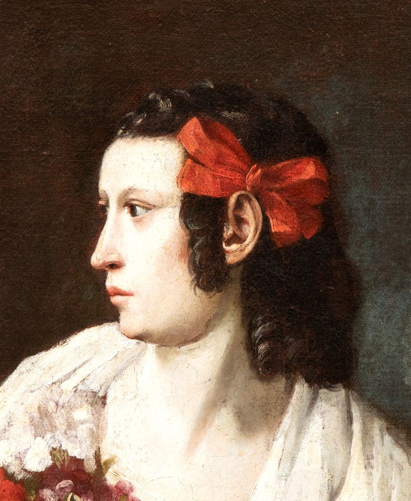 Portrait of a Lady with red ribbon Oil on canvas cm. 46,5x35,5. Framed