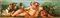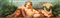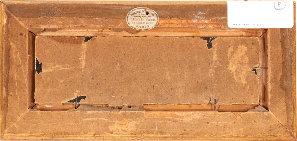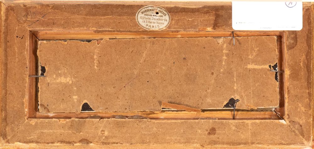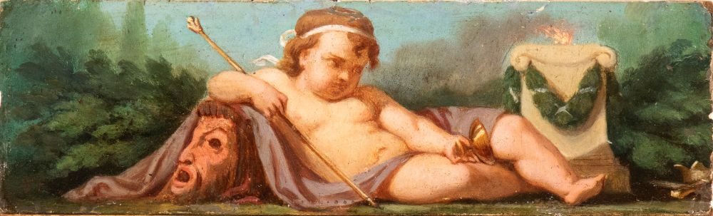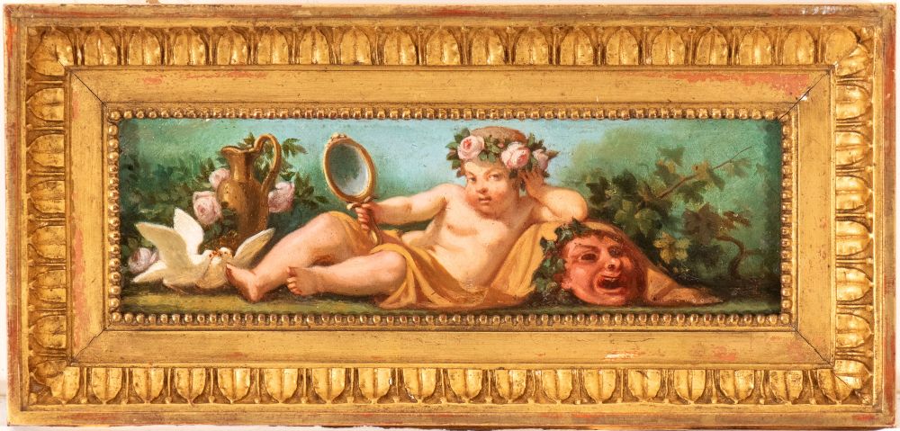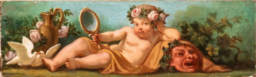 a) Infant Bacchus with cup, scepter, and mask; b) Infant Bacchus with mirror, flowers, and mask. Pair of paintings Oil on cardboard cm. 6x19,3 each. Framed