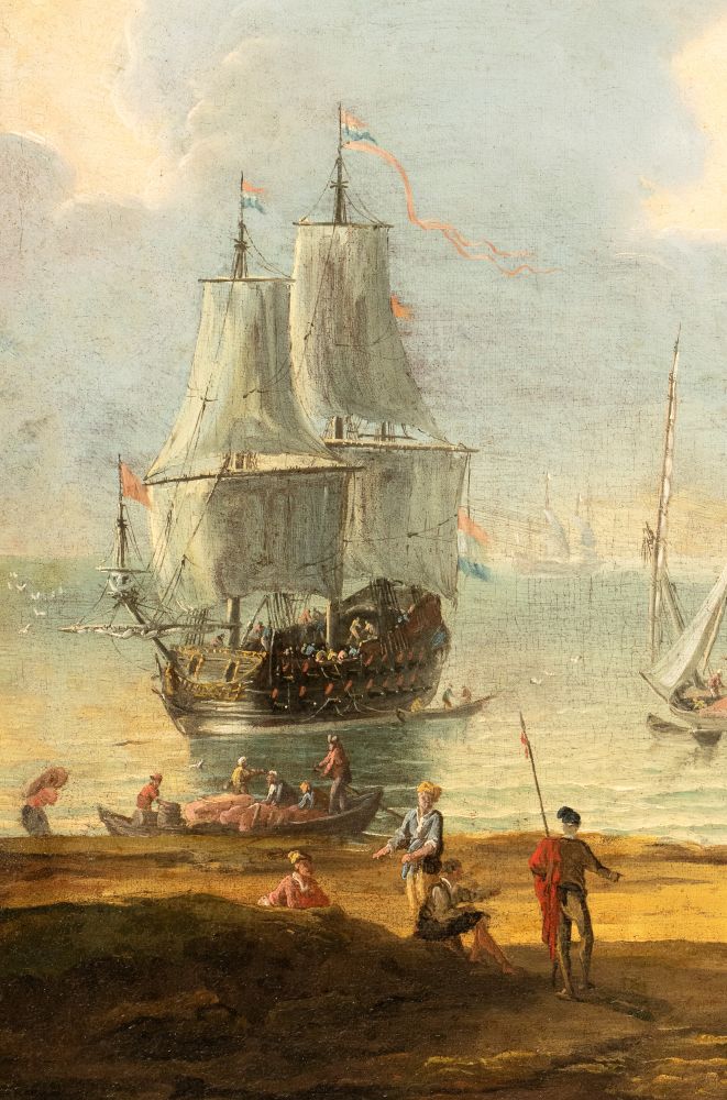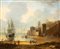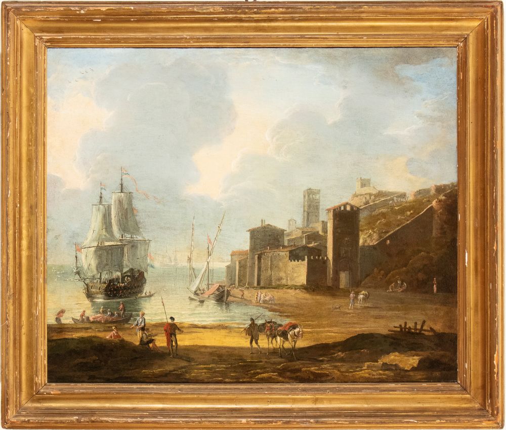 Marina with boats, figures, and citadel Oil on canvas cm. 62x74,4. Framed Private collection, Rome.