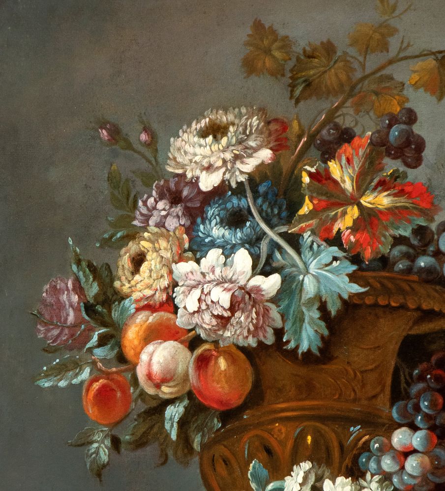 Bouquet di fiori in un vaso di rame con frutti