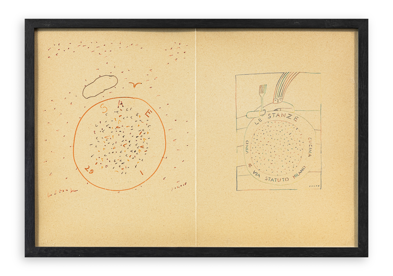 Intervento a pennarelli colorati su cartoncino plastificato pieghevole (originariamente utilizzato come menù del ristorante 'Le stanze' di via Statuto a Milano
