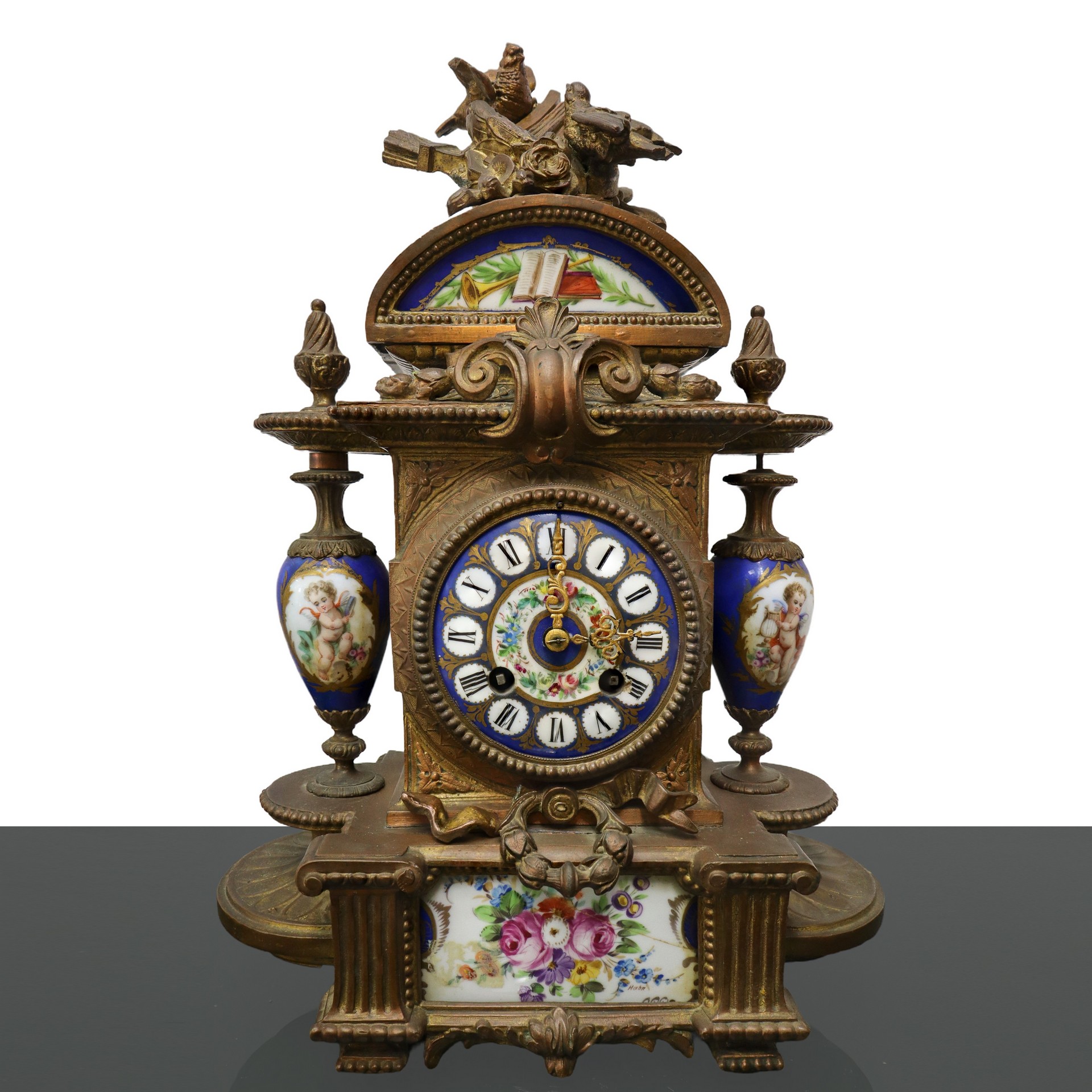 Orologio a pendolo da tavolo in bronzo dorato e porcellane applicate stile di Sevres