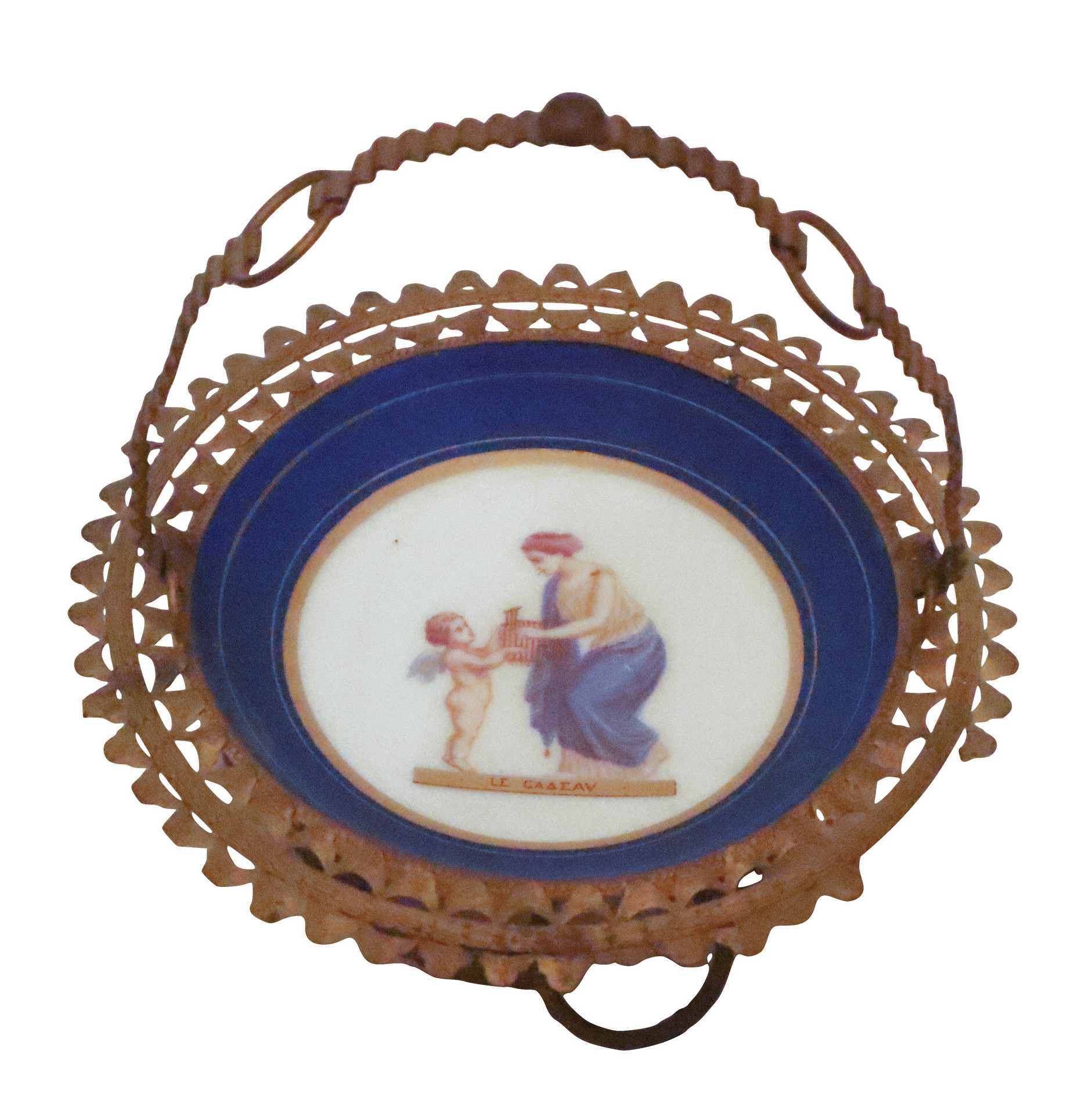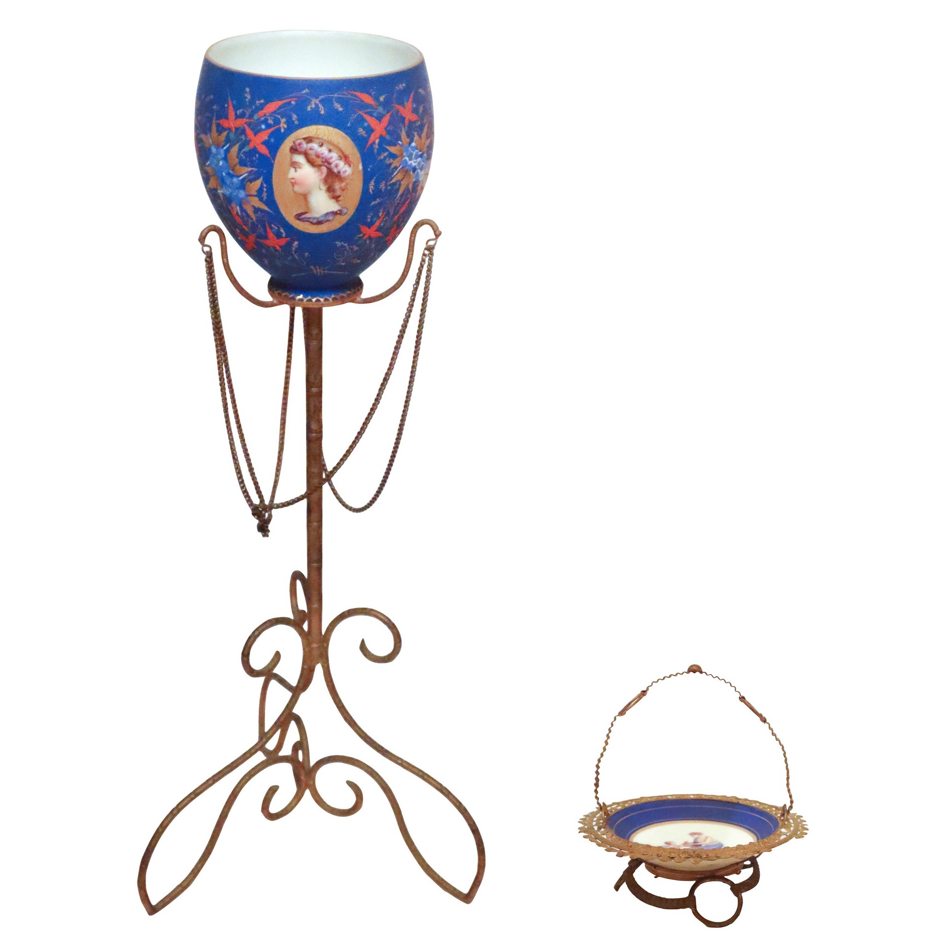 Vaso in porcellana ed alzatina in blue royal cobalto con dipinto H cm 35 x 24 Vaso con manico, blue royal cobalto su piedistallo in ferro dorato, più alzatina in blue royal cobalto con raffigurazione al centro