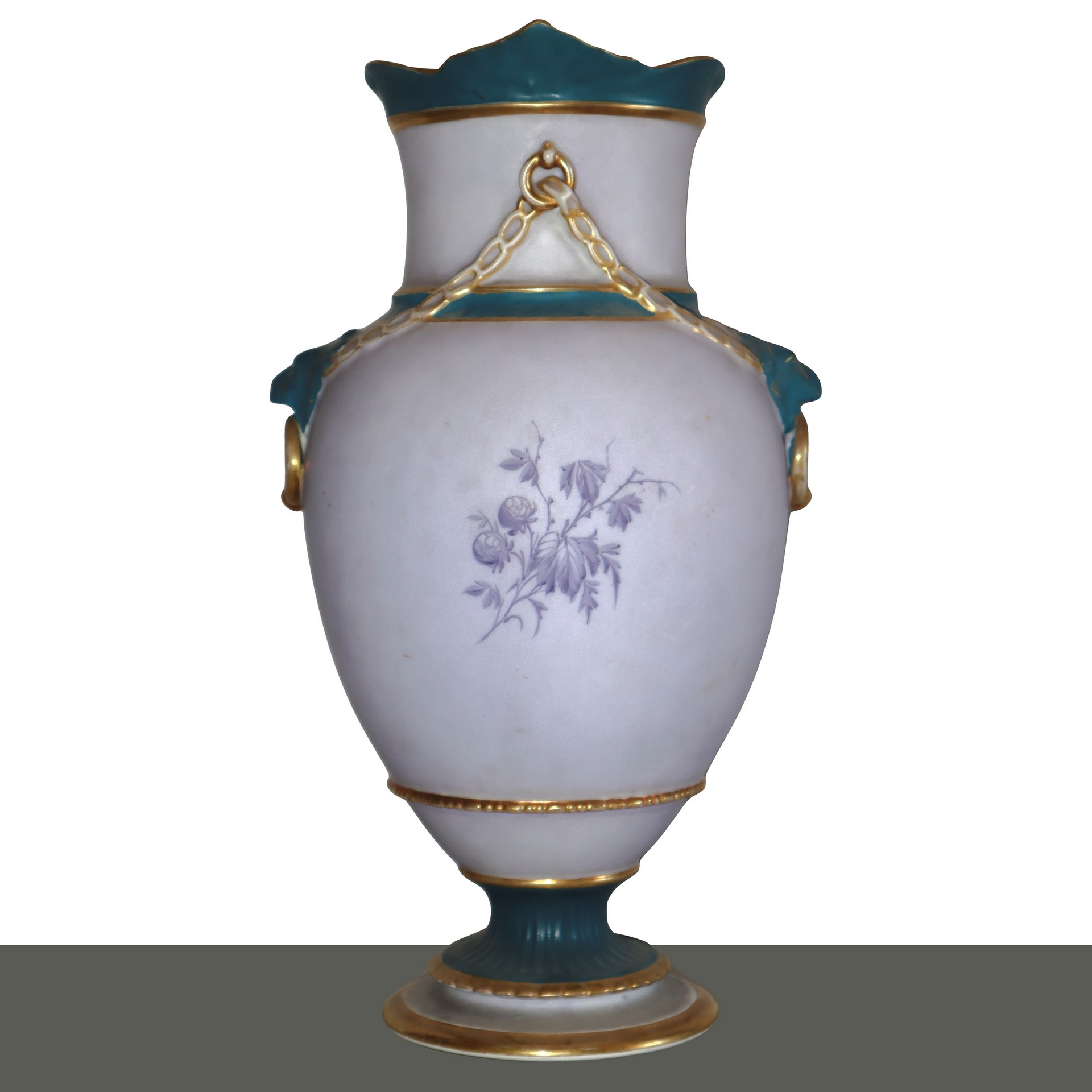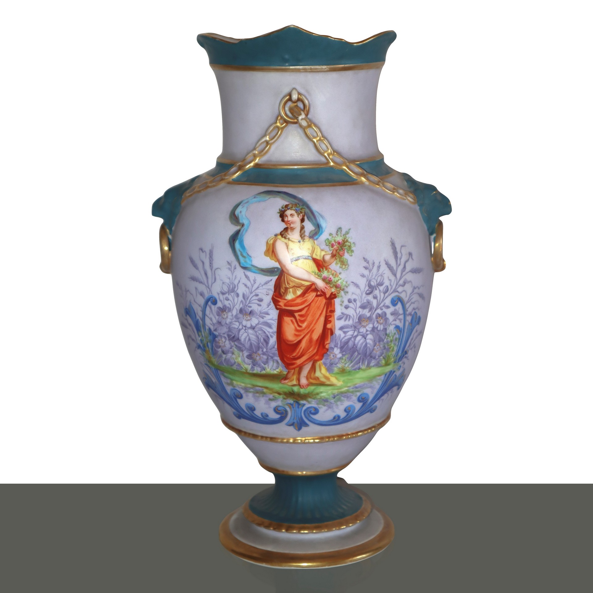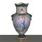 Coppia vasi in porcellana dipinta con raffigurazione di figure femminili, finiture in oro e maniglie leonine, Old France, early 19° secolo