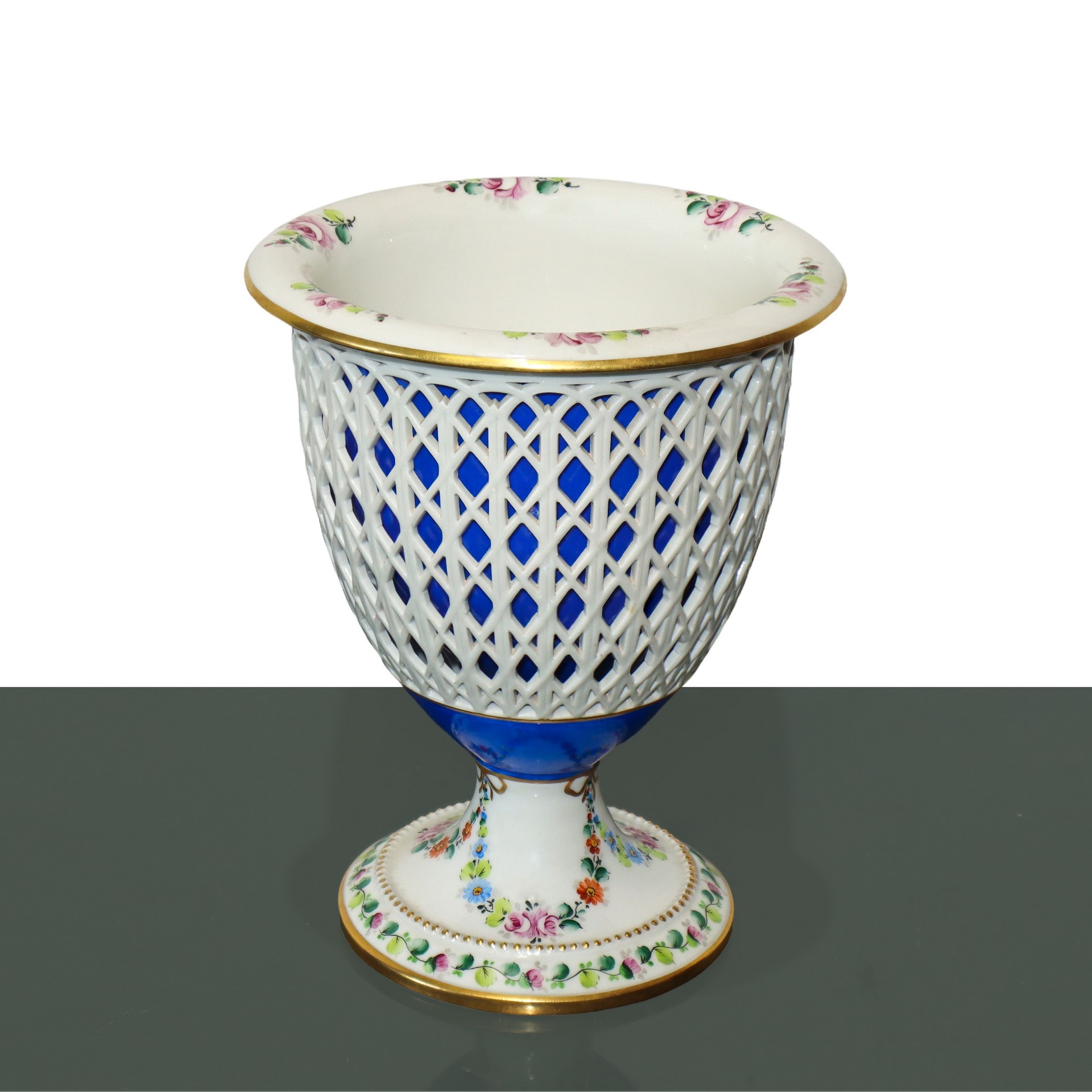 Vaso in porcellana a cesto bianco base a motivi floreali con vaso interno blu cobalto e orlo a motivi floreali h cm 19X15 vaso interno h cm 11X15 Marchio della manifattura alla base Handgemalt