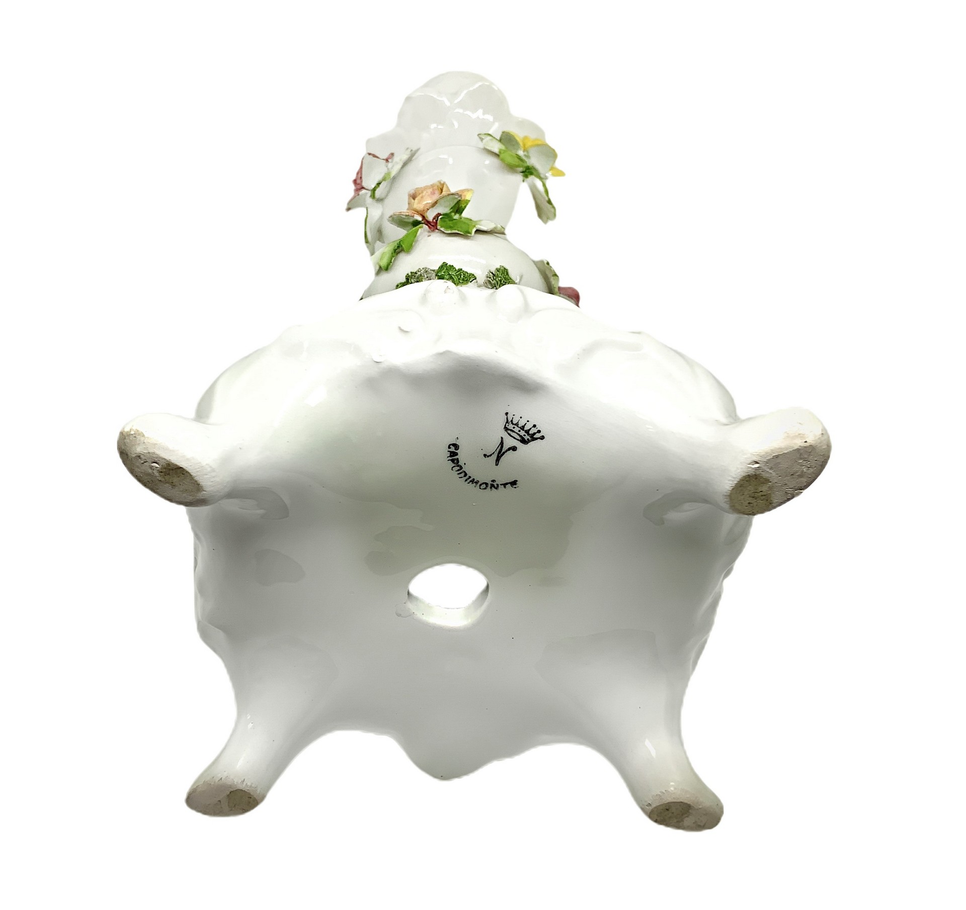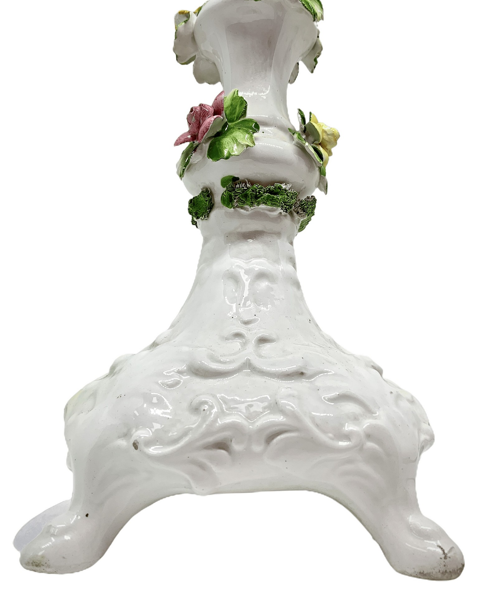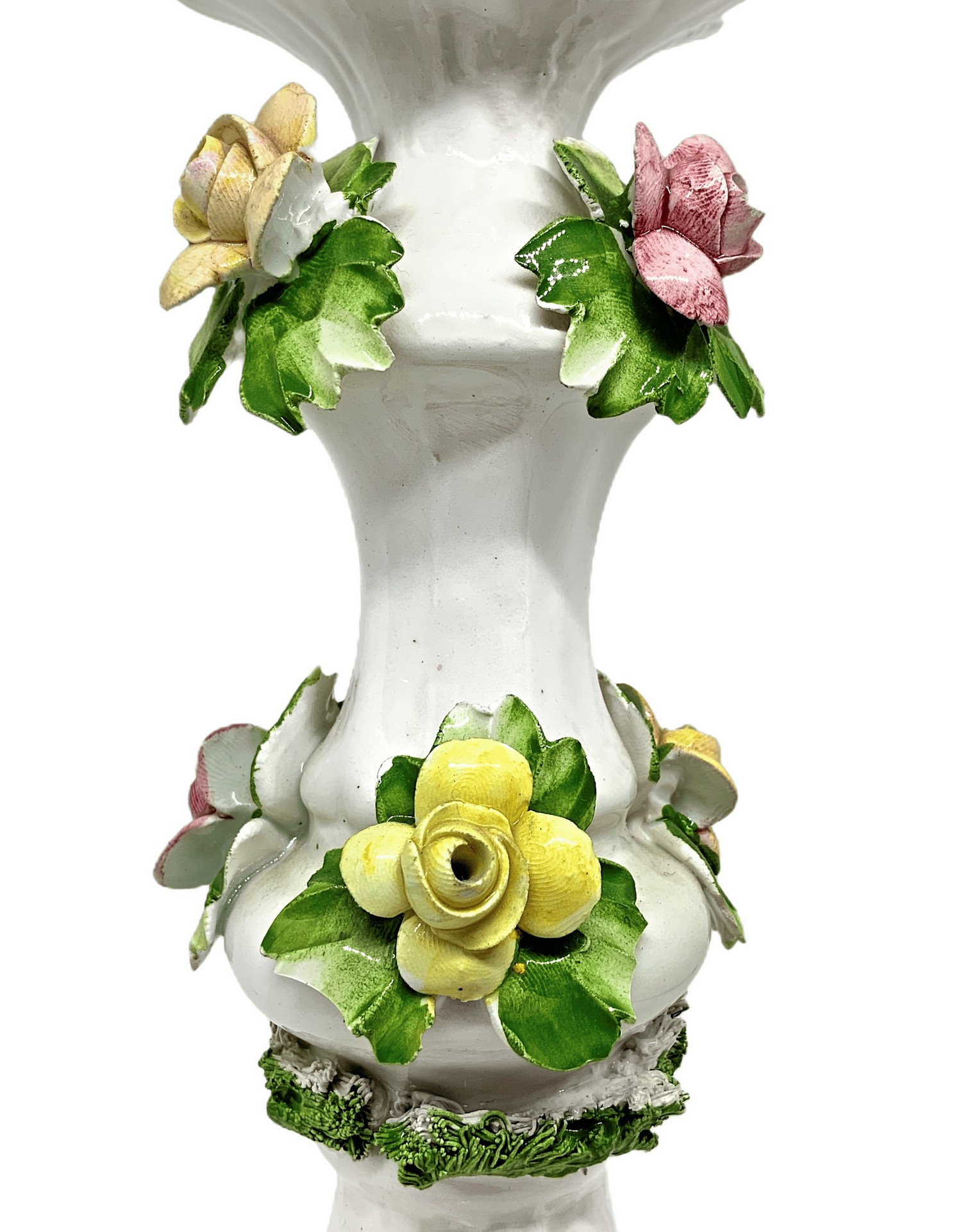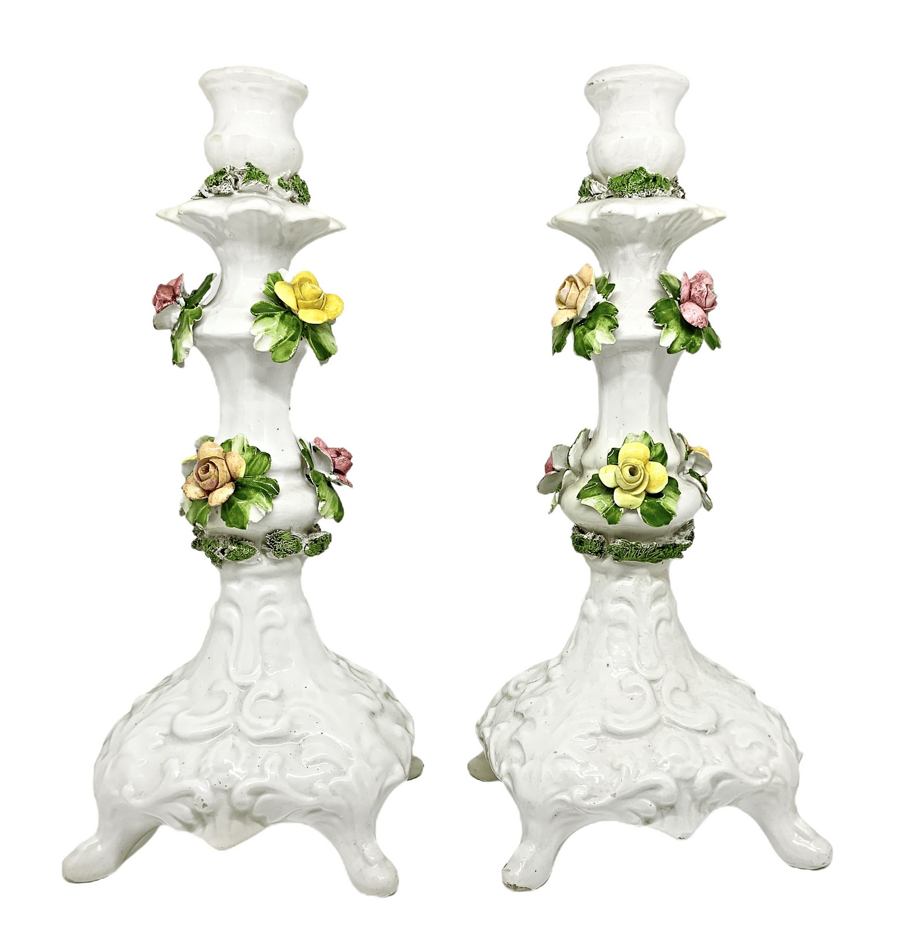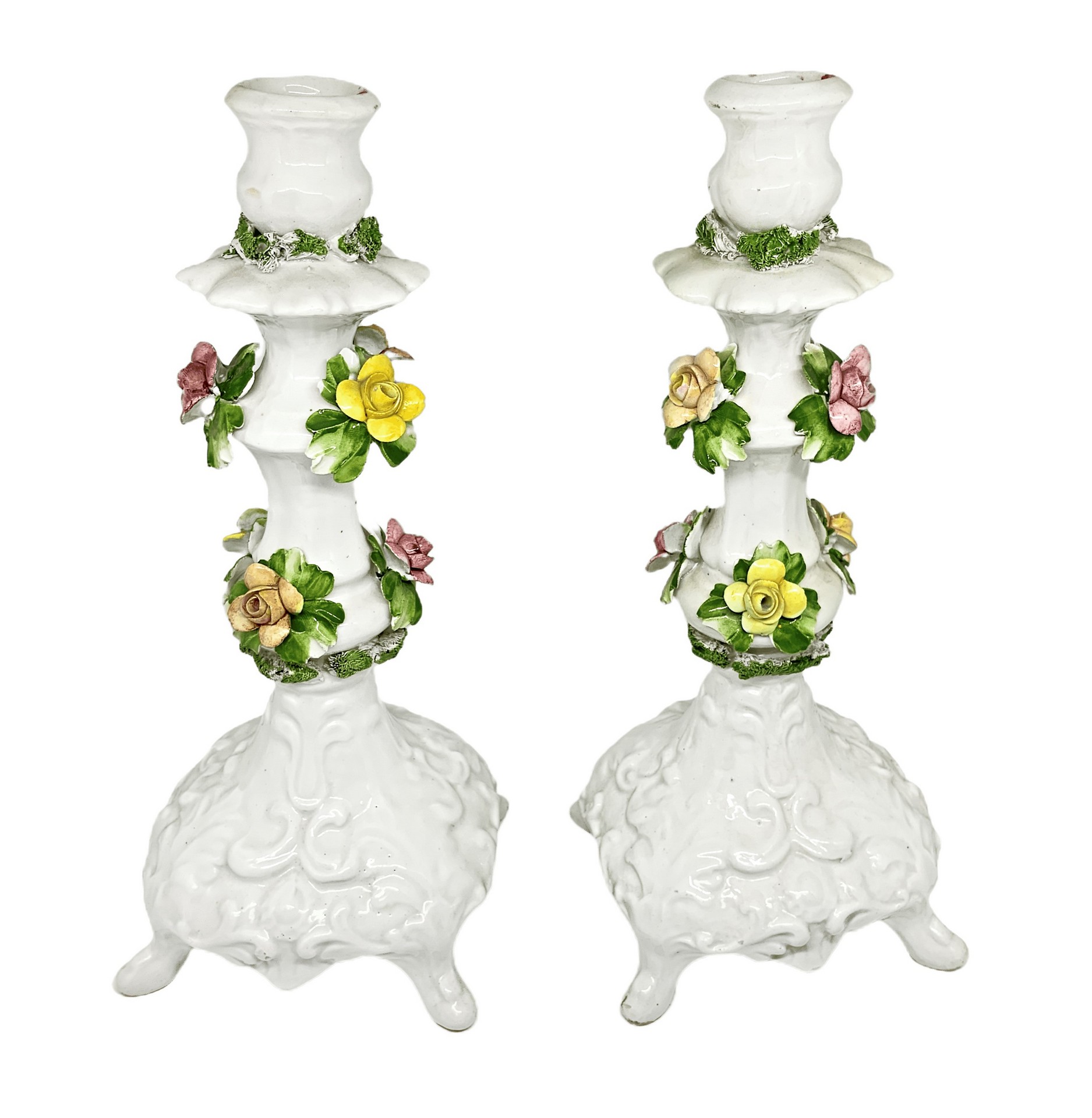 Capodimonte - Coppia candelieri bianchi in porcellana di Capodimonte H cm 32 Con fondo bianco e decorzione floreale policroma. Marchio sulla base. Piccole mancanze