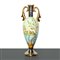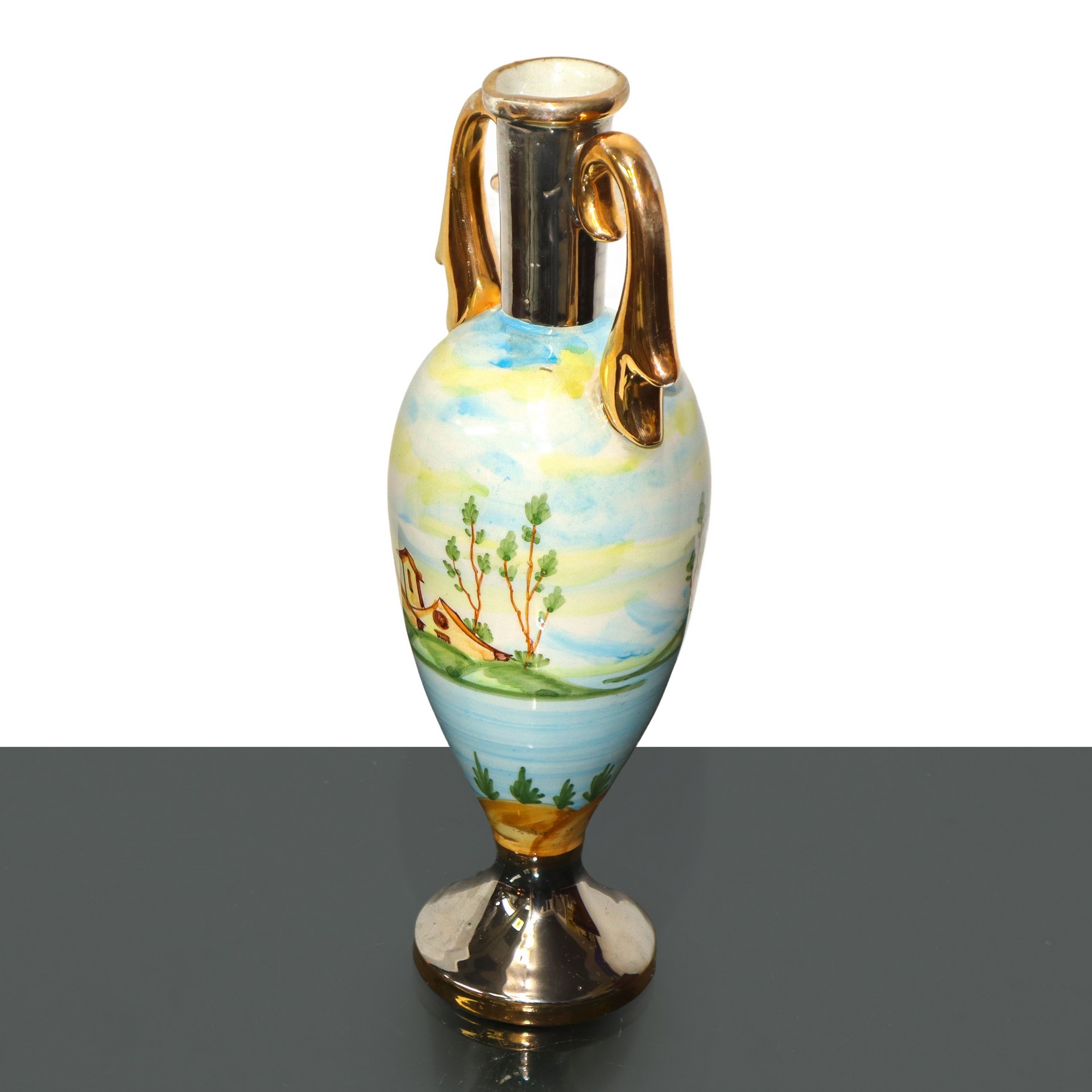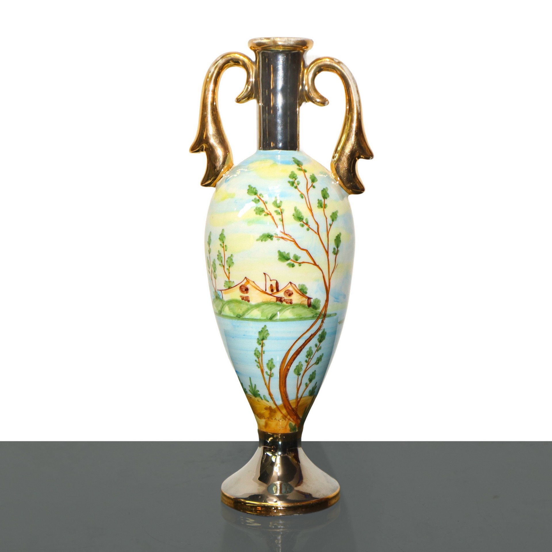 Vaso biansato in porcellana con decorazione paesaggistica policroma sul corpo del vaso e manici dorati