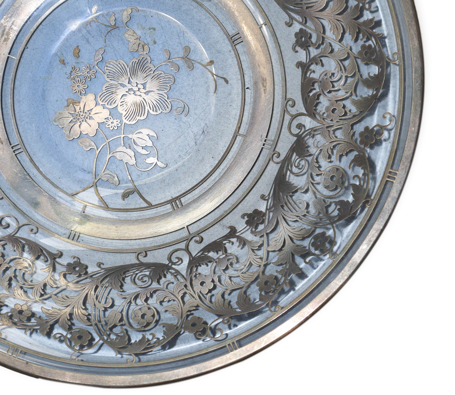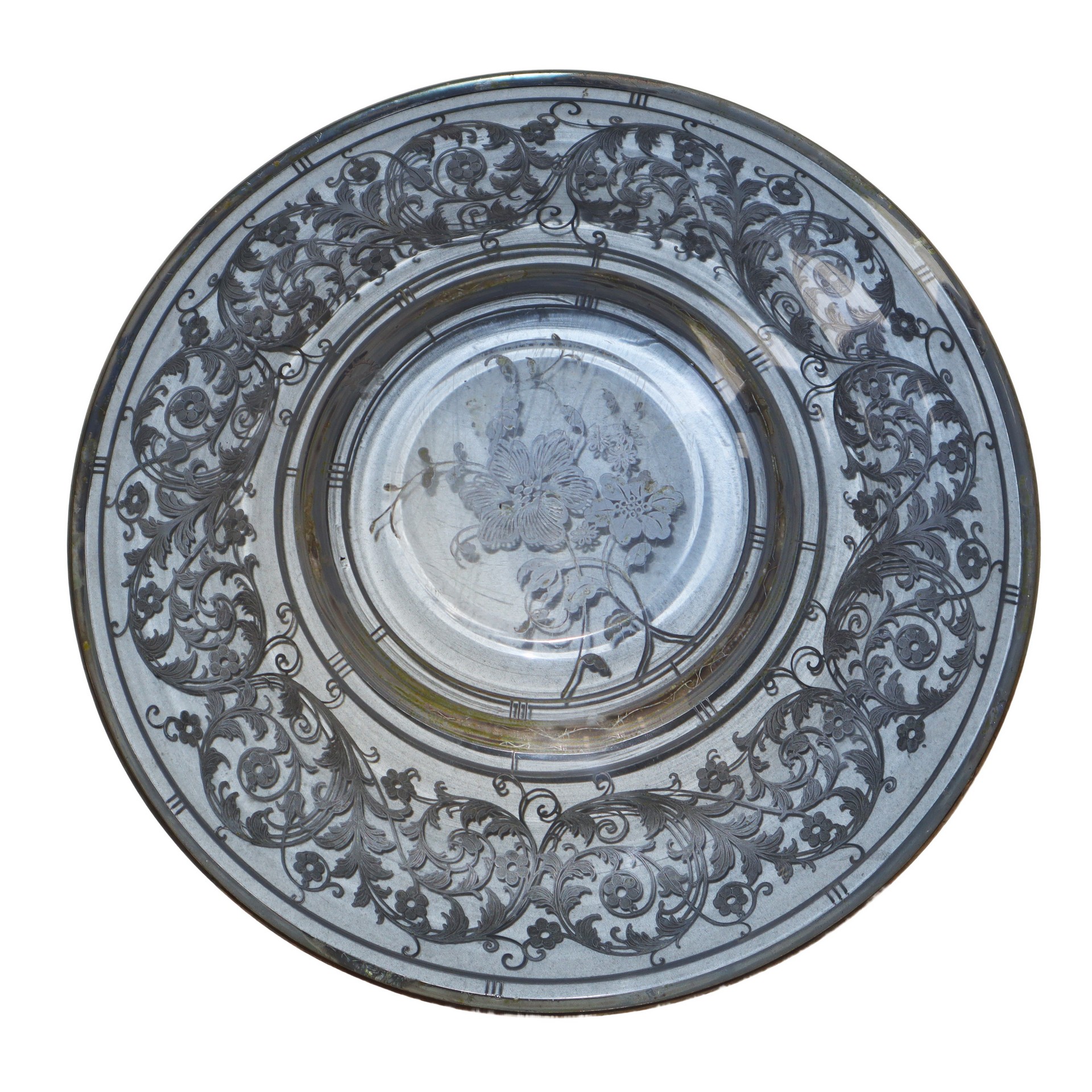 Piatto in vetro con decorazioni in argento diametro cm 32