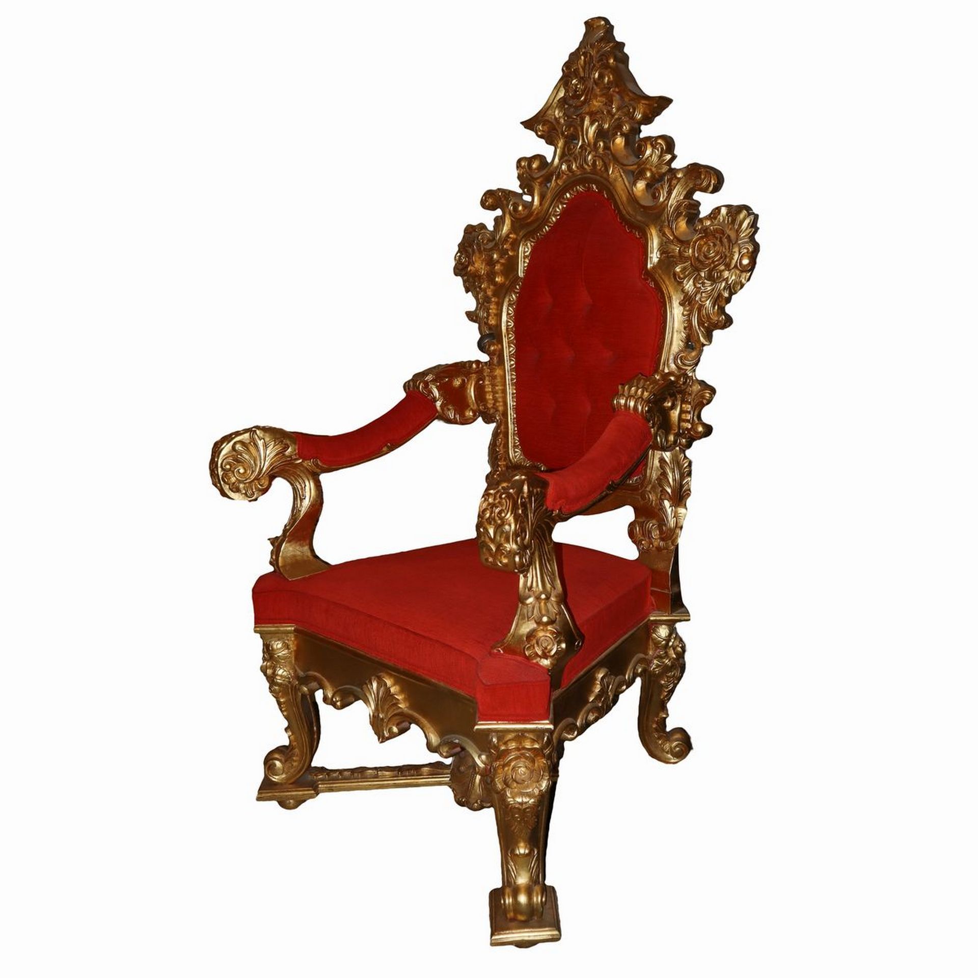 Grande trono stile barocco in legno dorato H cm 195 x 50 x 45 Nello stile del Re Sole, tapezzeria rosso cardinale
