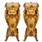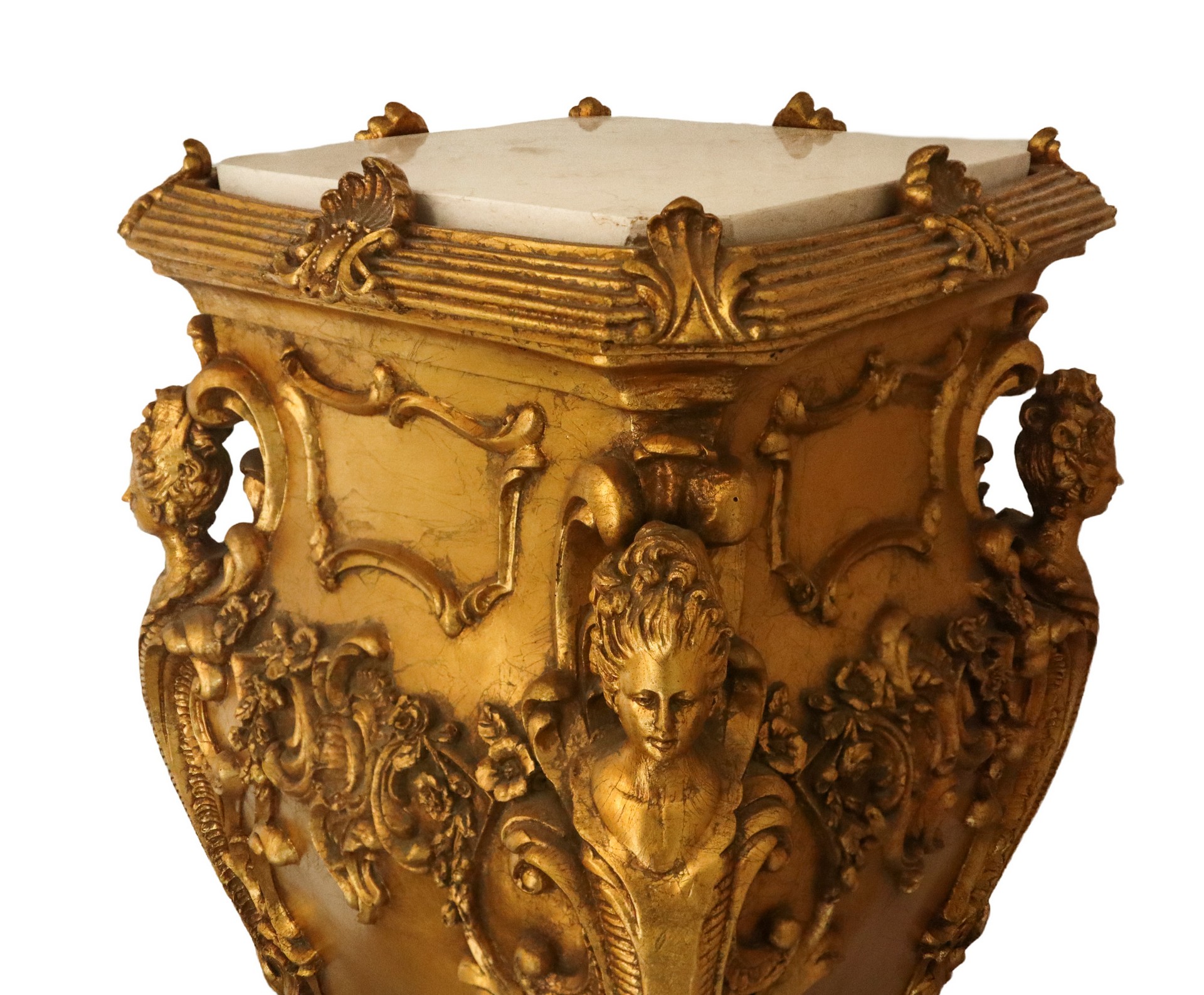 Coppia di gueridon in legno dorato H cm 106 , piano 37 x 37 stile Luigi XIV barocco, piano con marmo bianco con sculture di cariatidi ai quattro angoli con decori a rilievo, alla base piedi cabriole