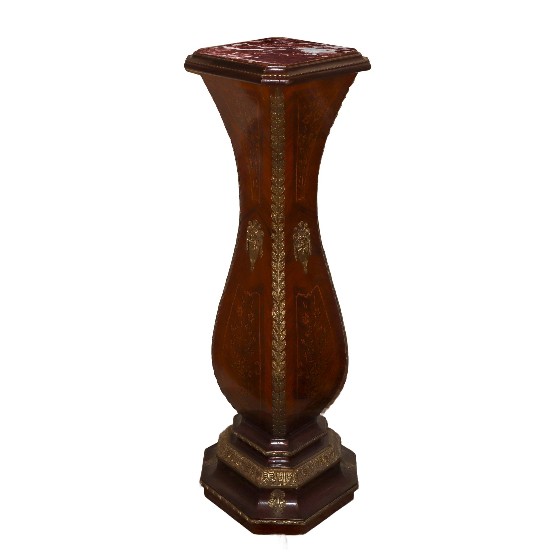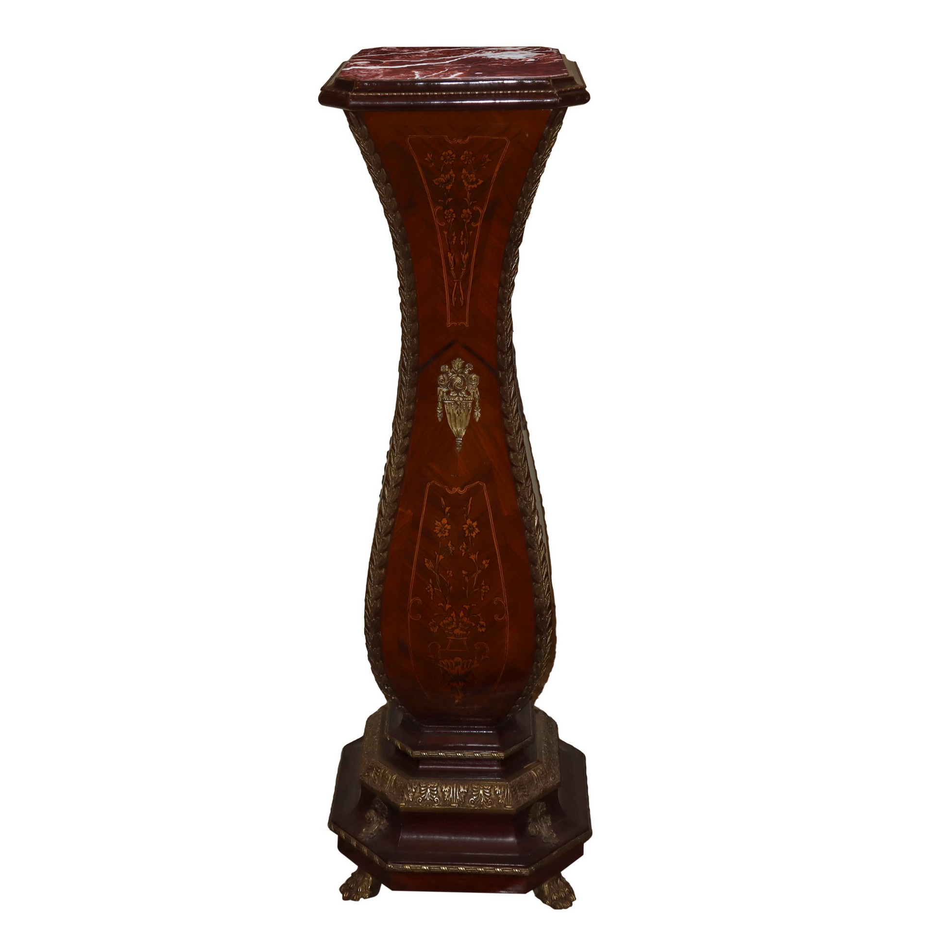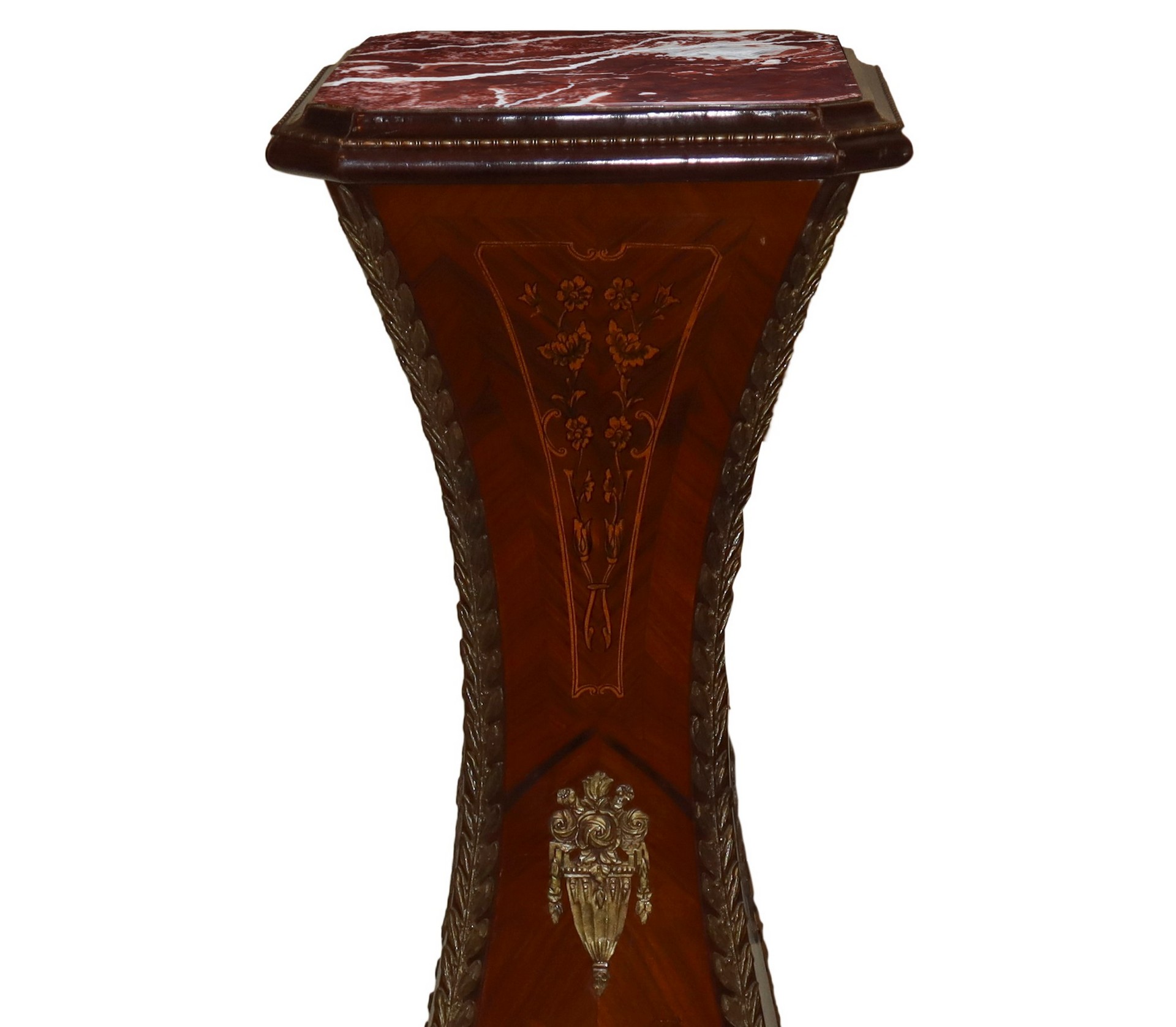 Gueridon a balaustra stile Luigi XIV h cm 137 base 42 x 42 piano 40 x 40, In legno di rosa, base in mogano, piano con marmo rosso Verona, bronzi a spiga applicati ai quattro angoli, intarsi floreali in legni chiari