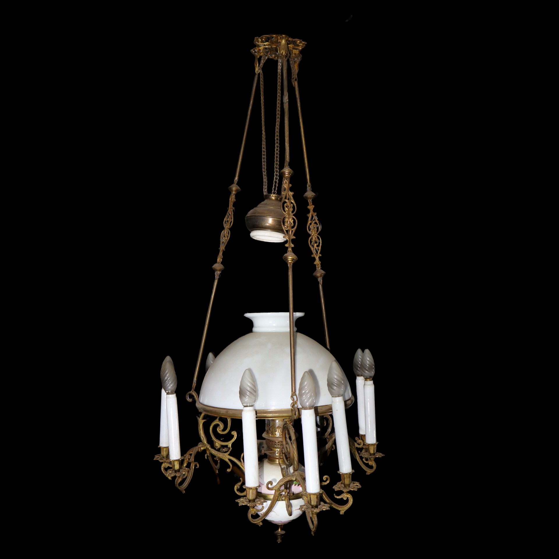 Sospensione a petrolio a 10 luci Cm 115x60 Con campana in opaline bianco e contenitore in porcellana dipinta