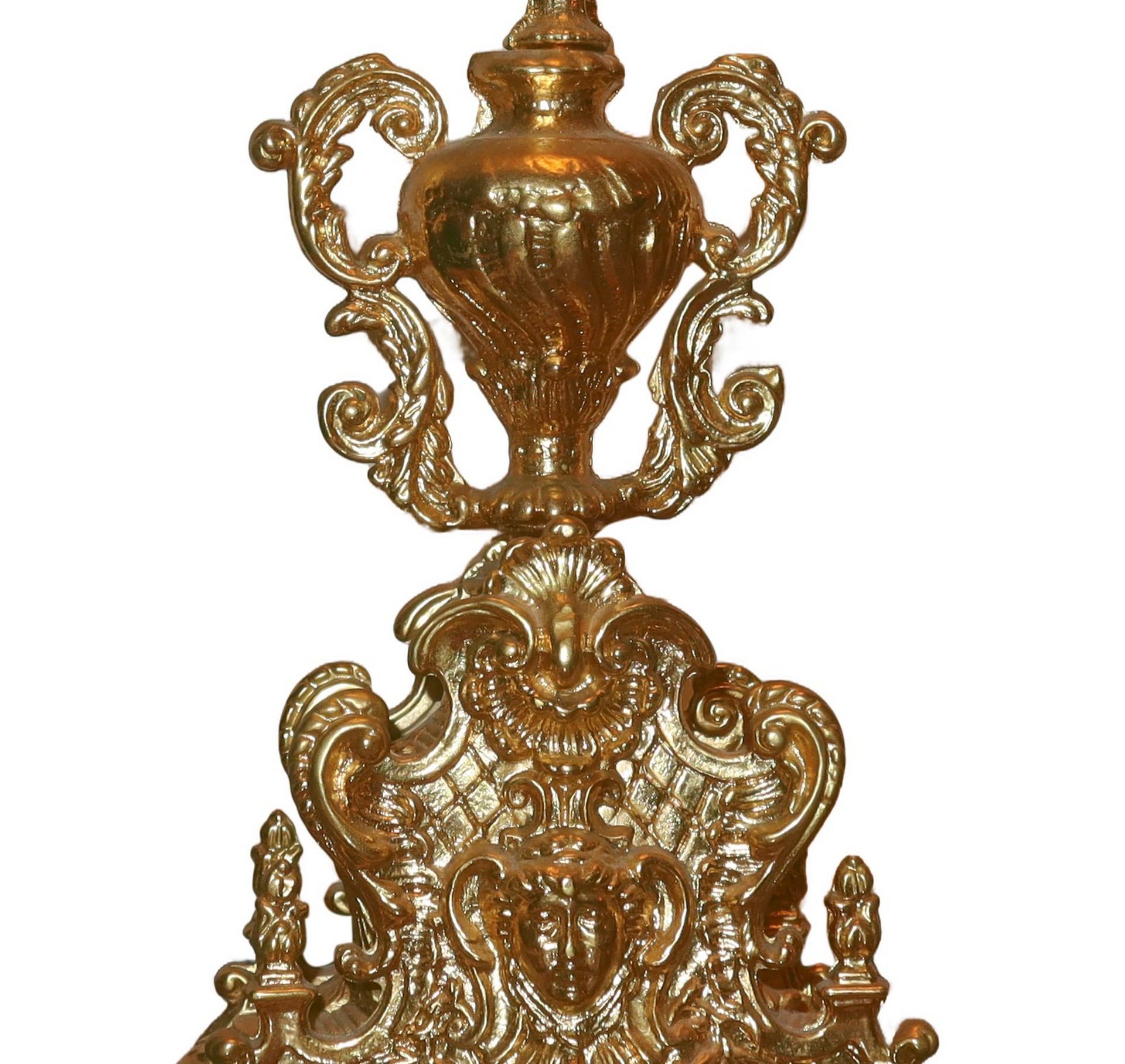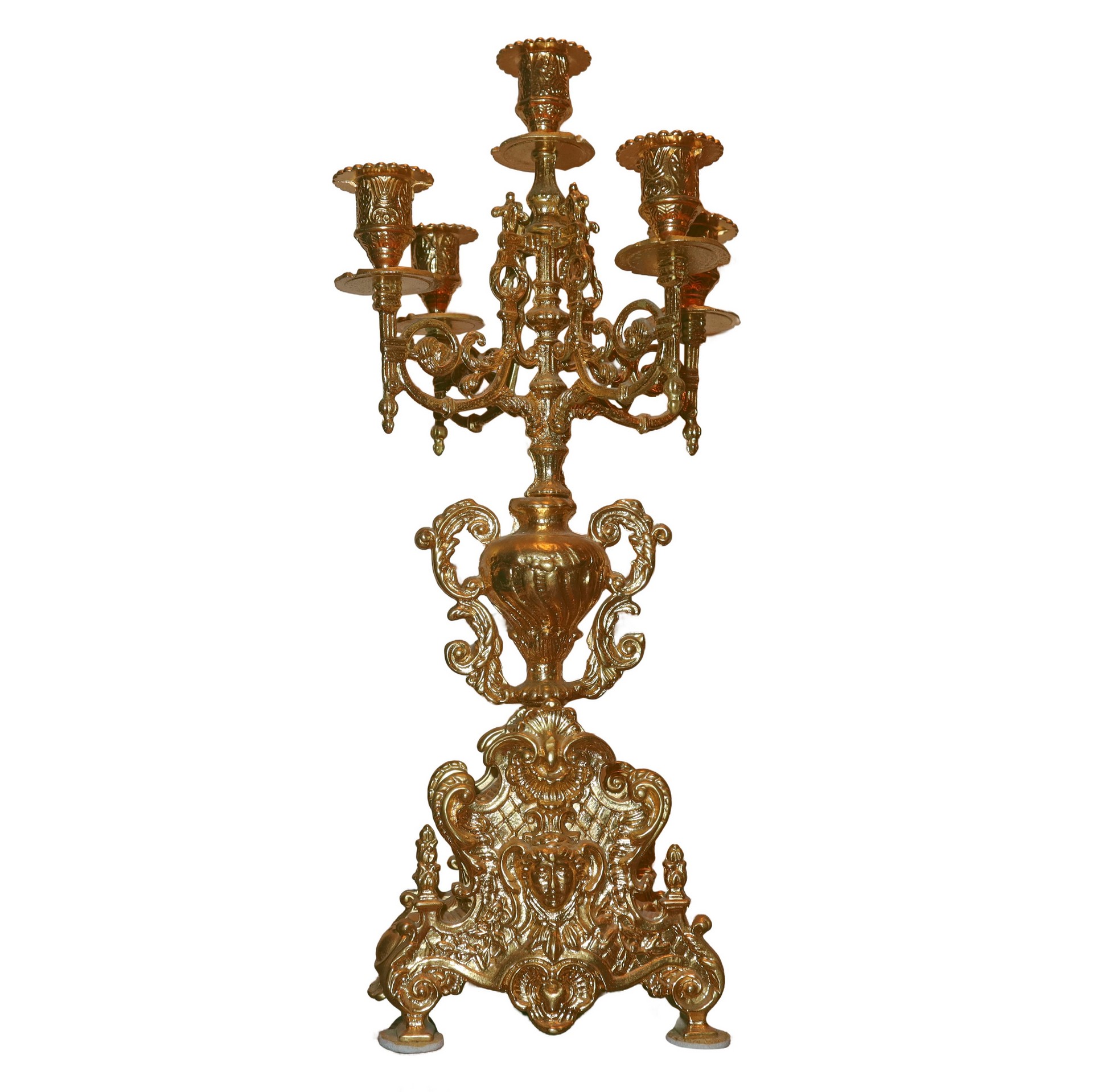 Coppia di candelabri a 5 luci in metallo dorato H cm 46 Nello stile Luigi XIV barocco, base con grottesche e ghirlande a rilievo,