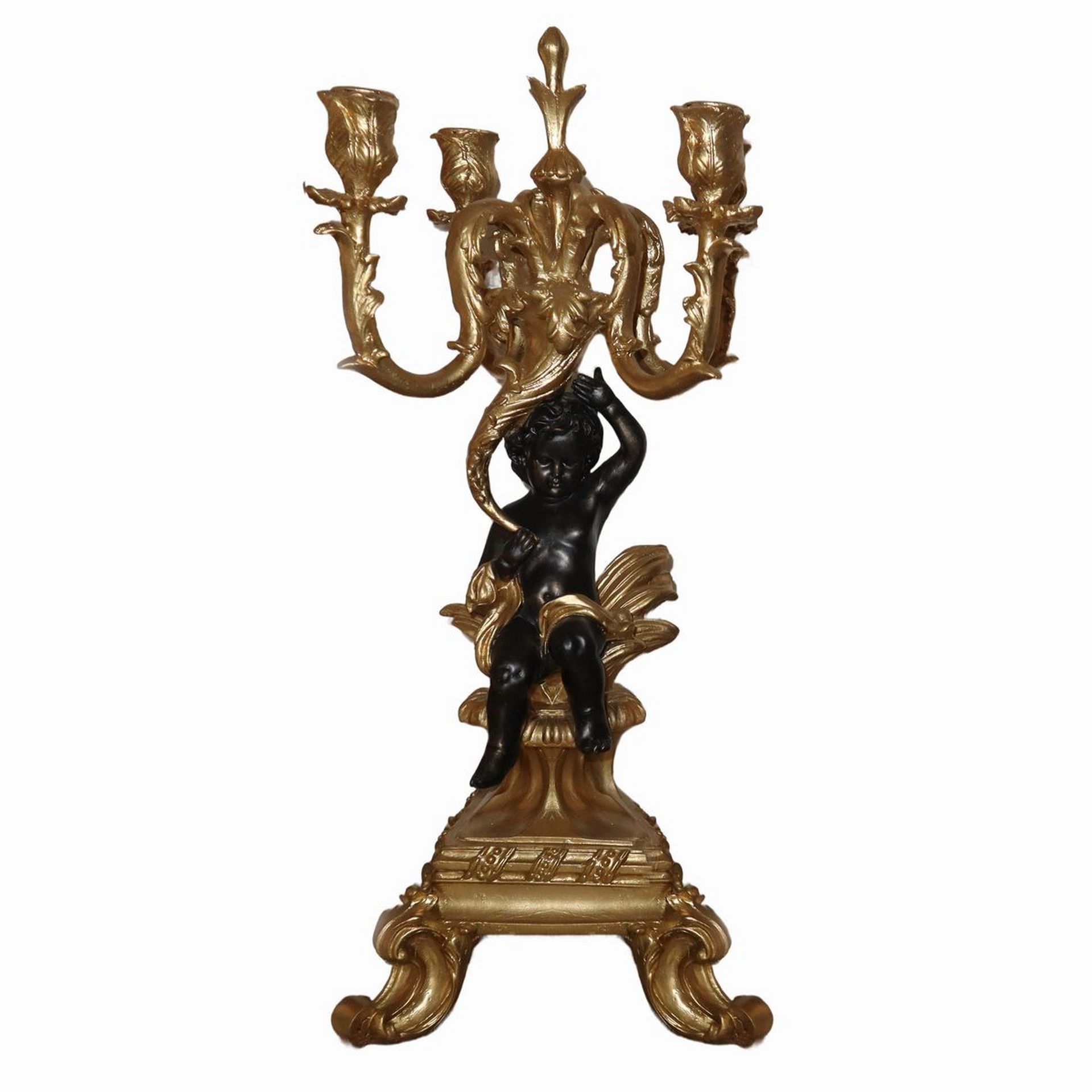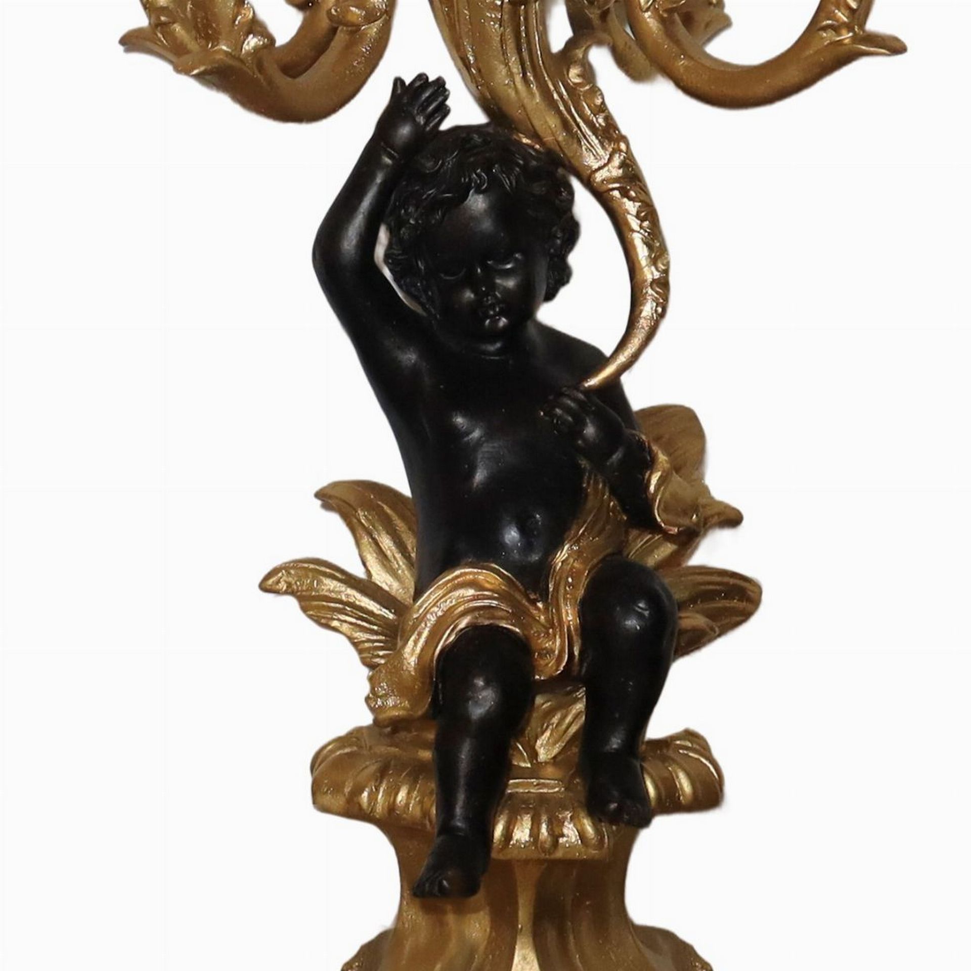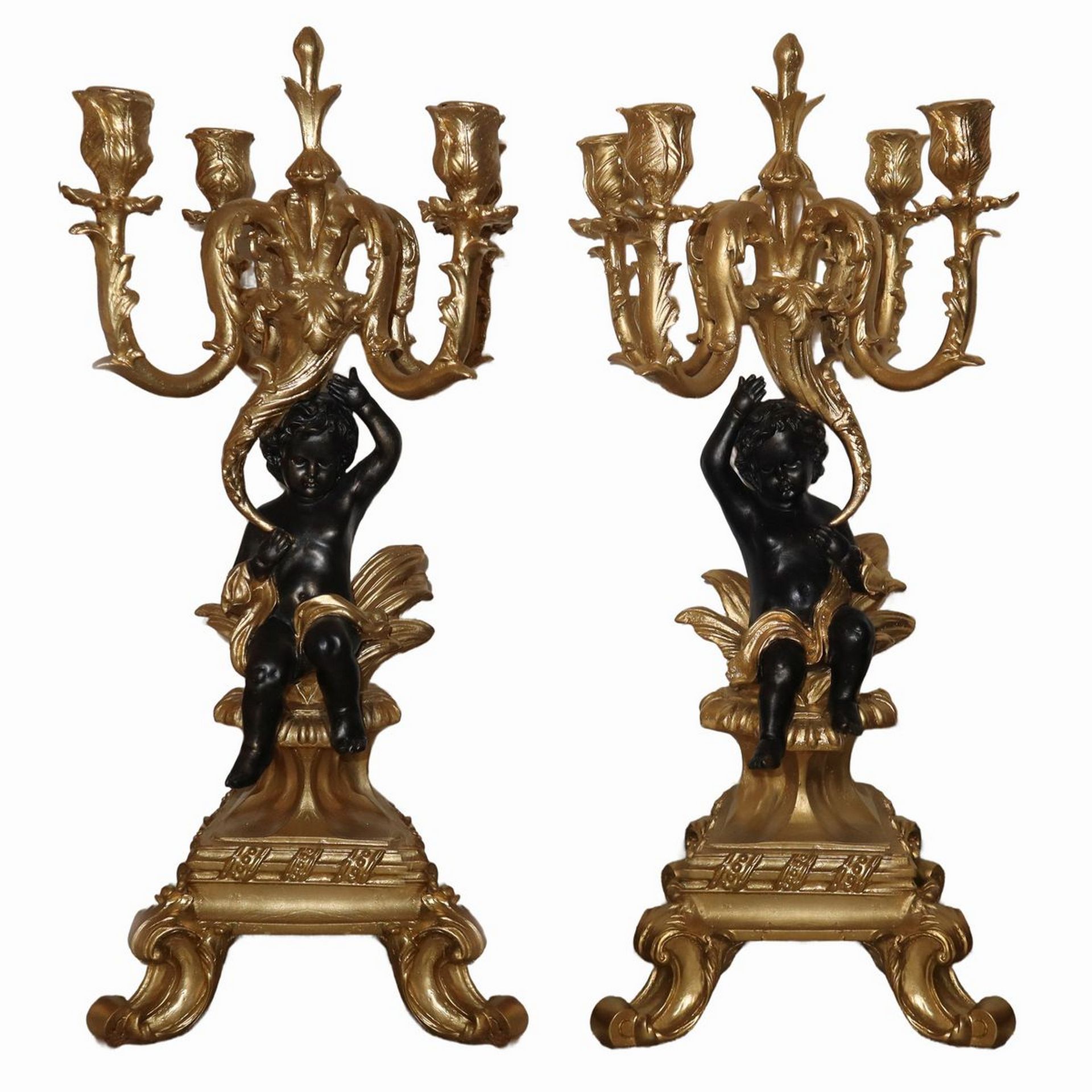 Coppia di candelabri in stile barocco a 5 luci H cm 61 In metallo dorato con putti laccati nero a sostegno, base quadrata a quattro piedi