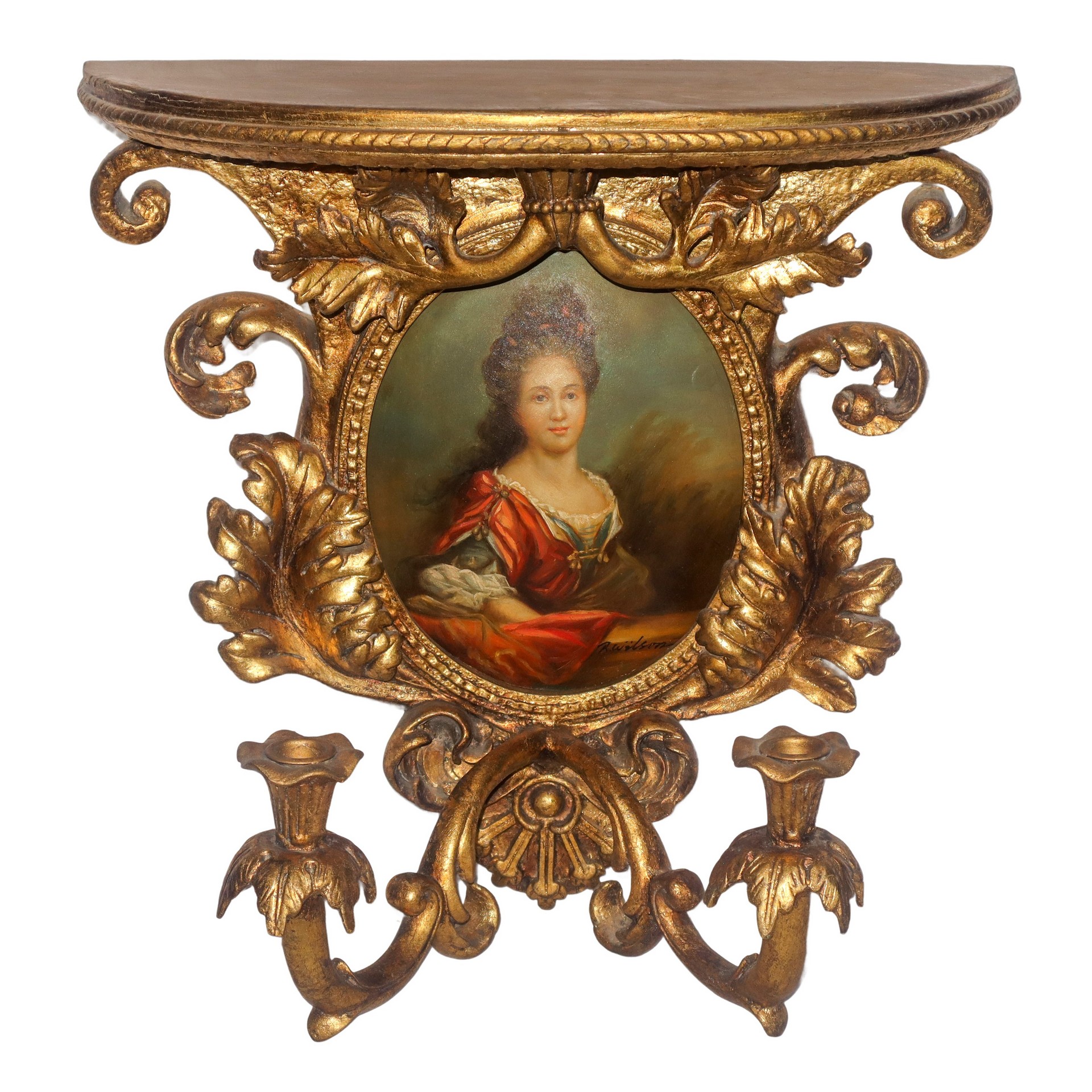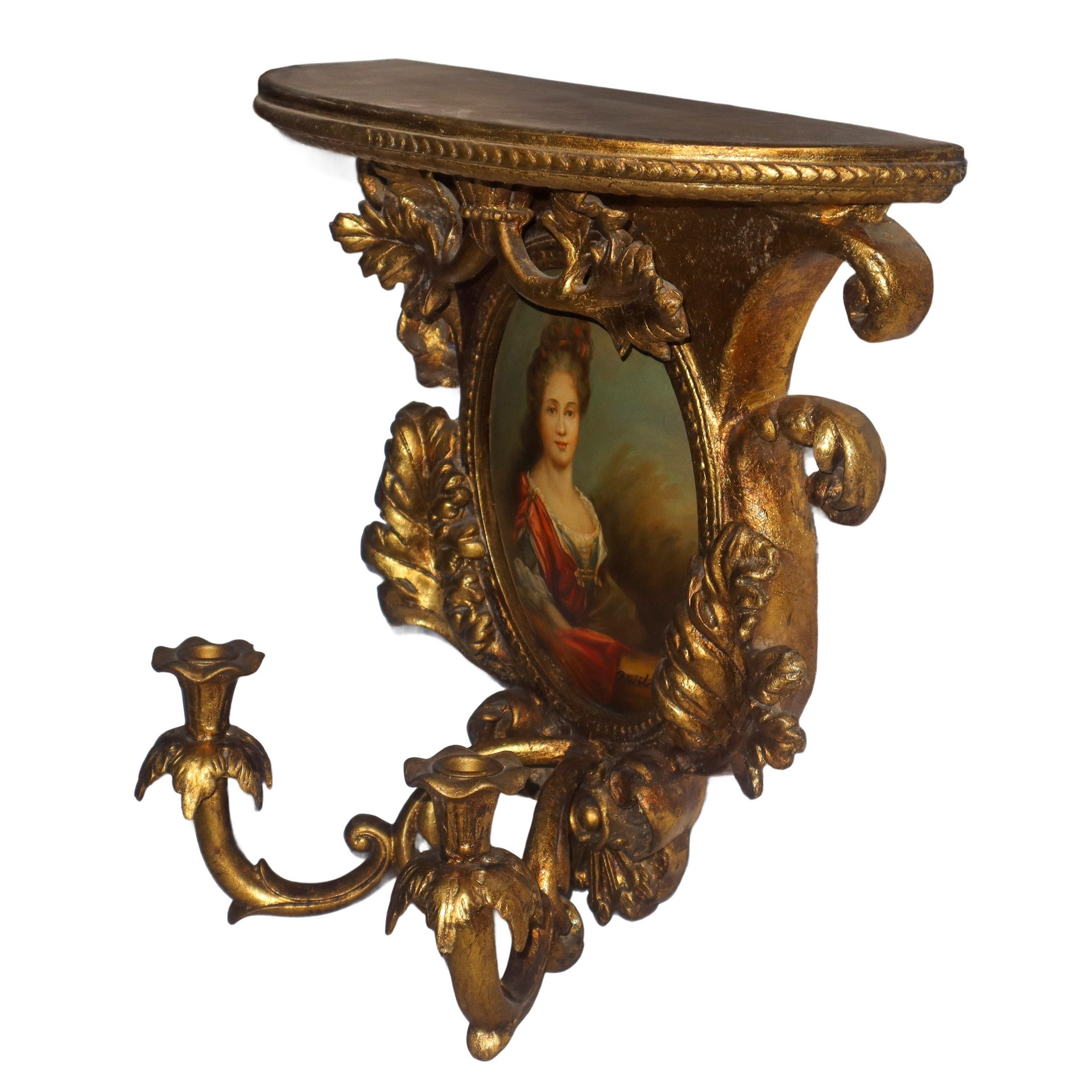 Applique dorata a due luci con decori vegetali ed ovale centrale con ritratto di dama h cm 46x47