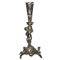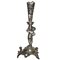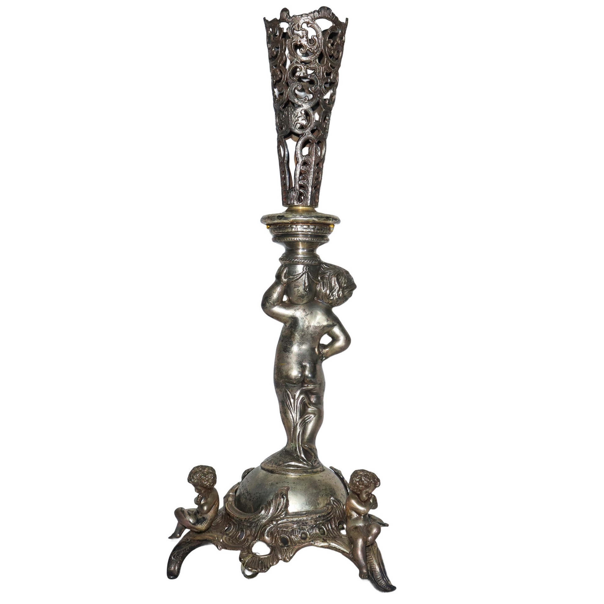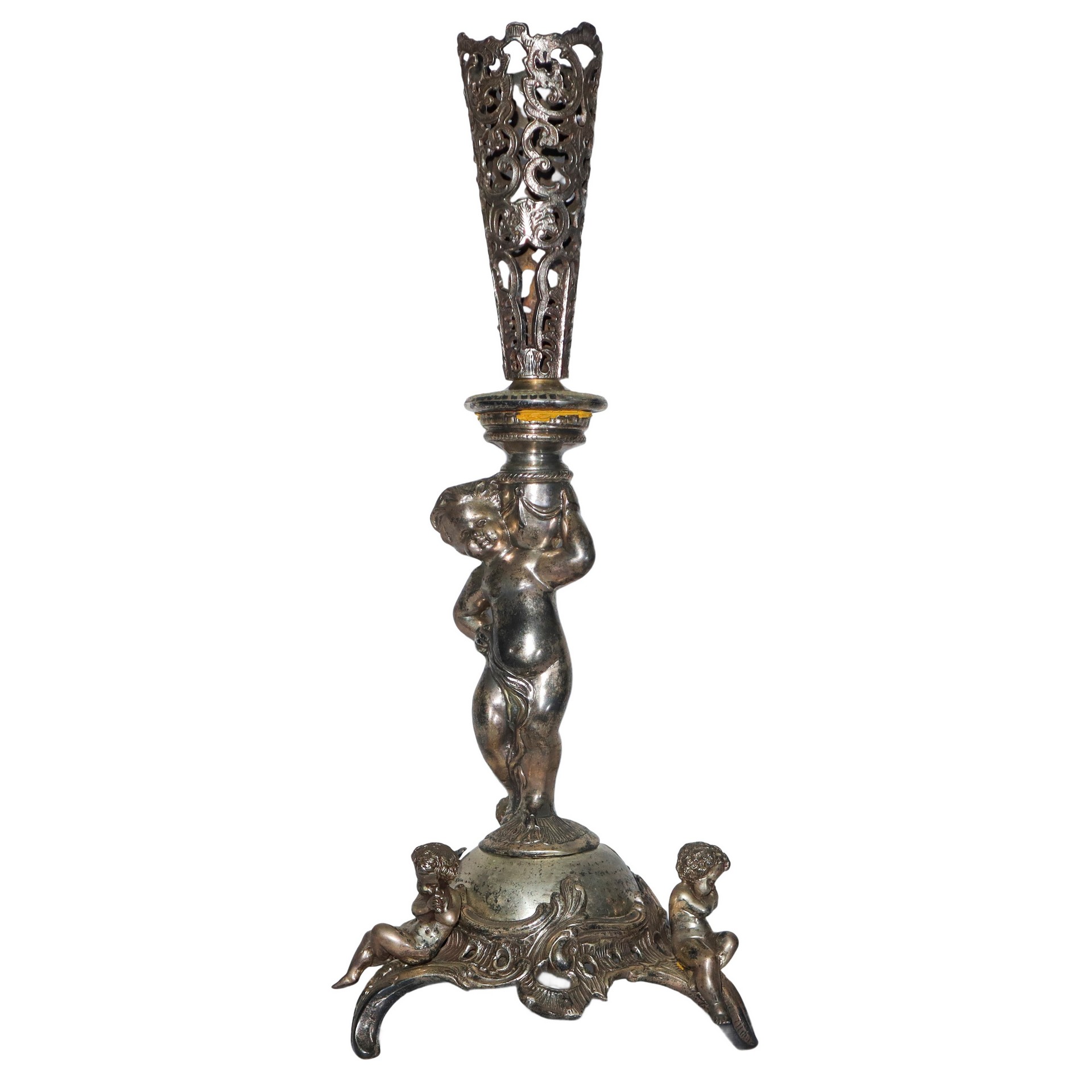 Candeliere in metallo con putto reggicandela, puttini alla base e decori a traforo
