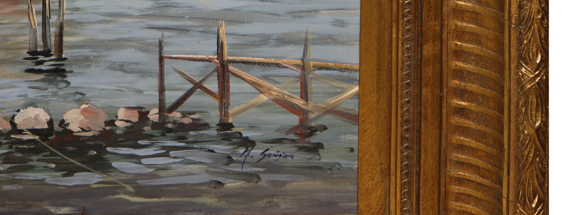 Andrea Savino (1958) - Marina con barche in porticciolo h cm 70X50 in cornice h cm 93X73 olio su tela