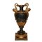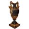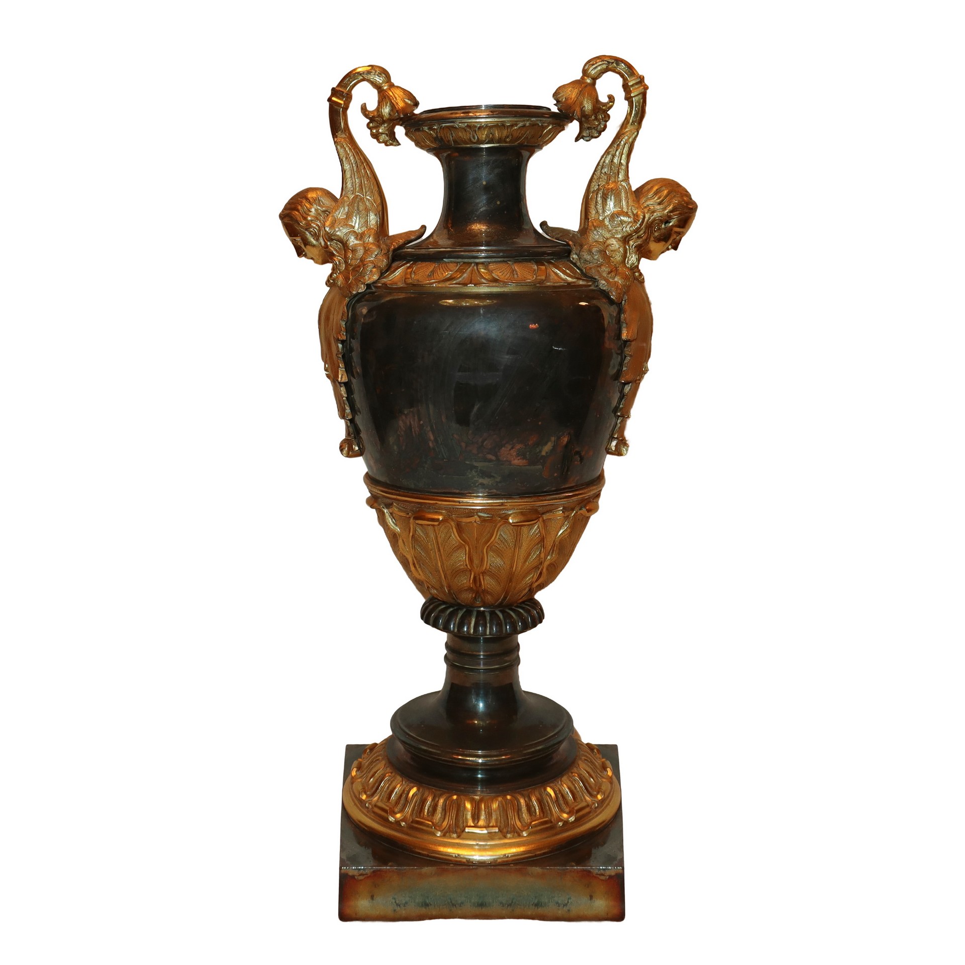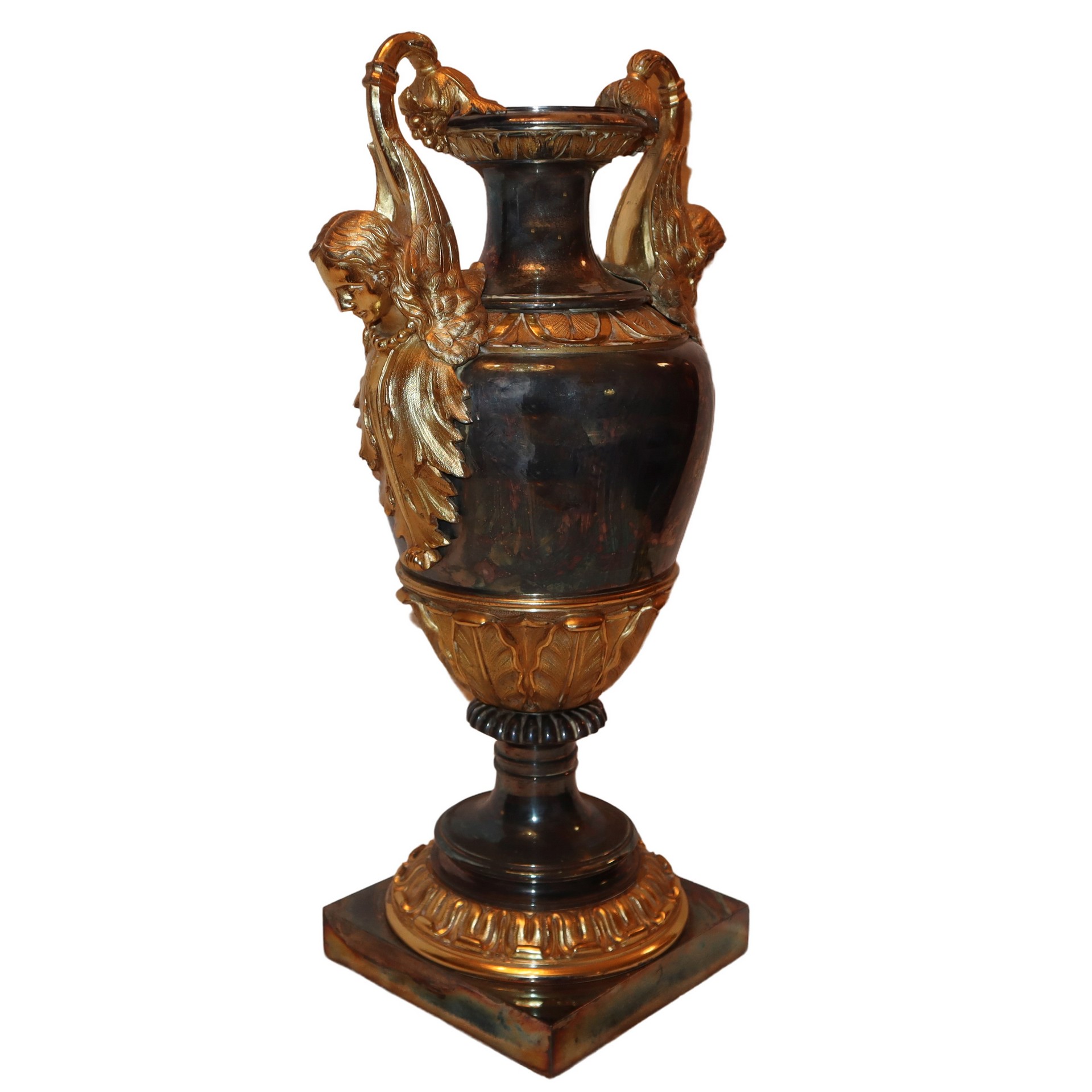 Vaso in metallo patinato e dorato H cm 50, base 17 x 17 Con prese laterali a forma di cariatidi dorate, foglie d'acanto a decoro alla base