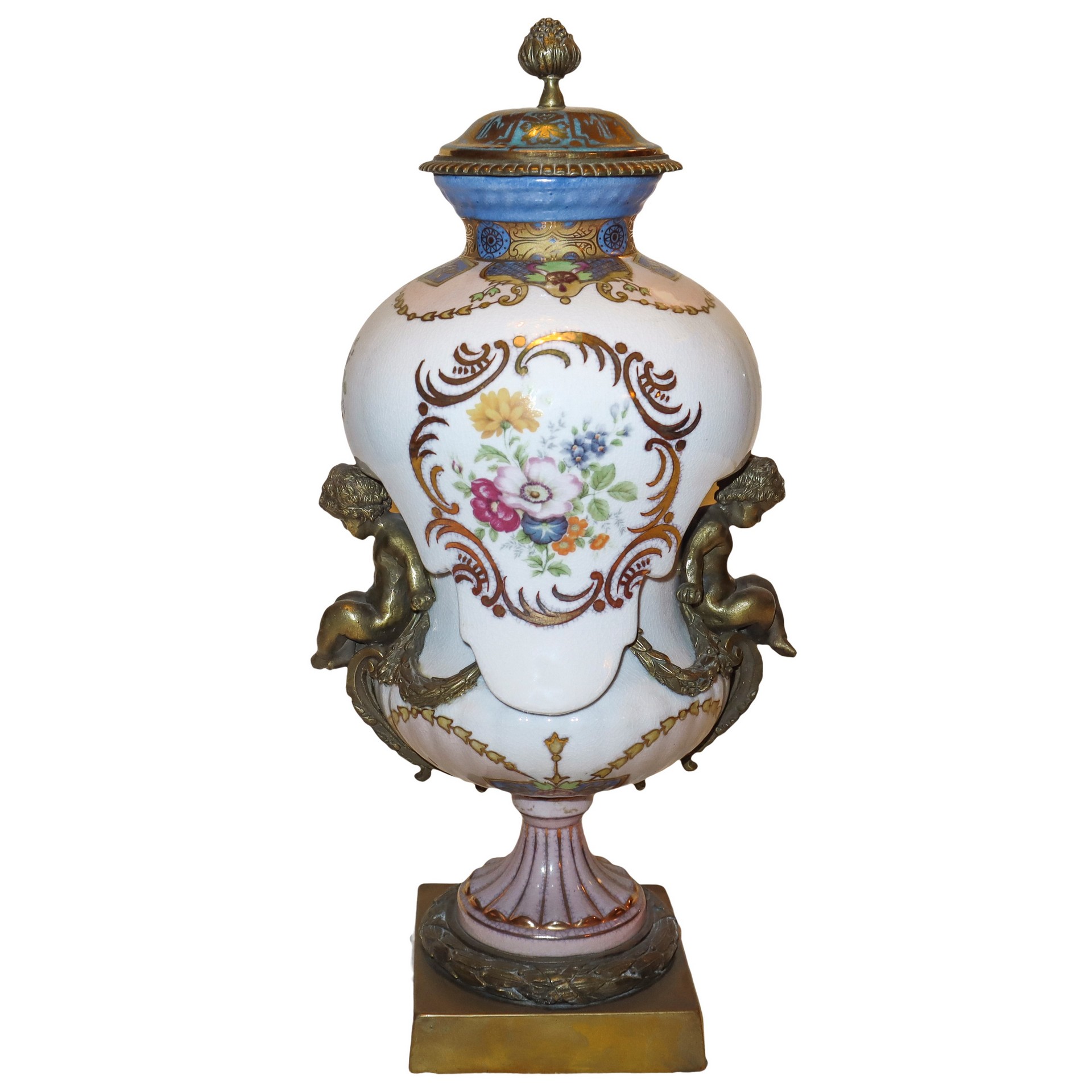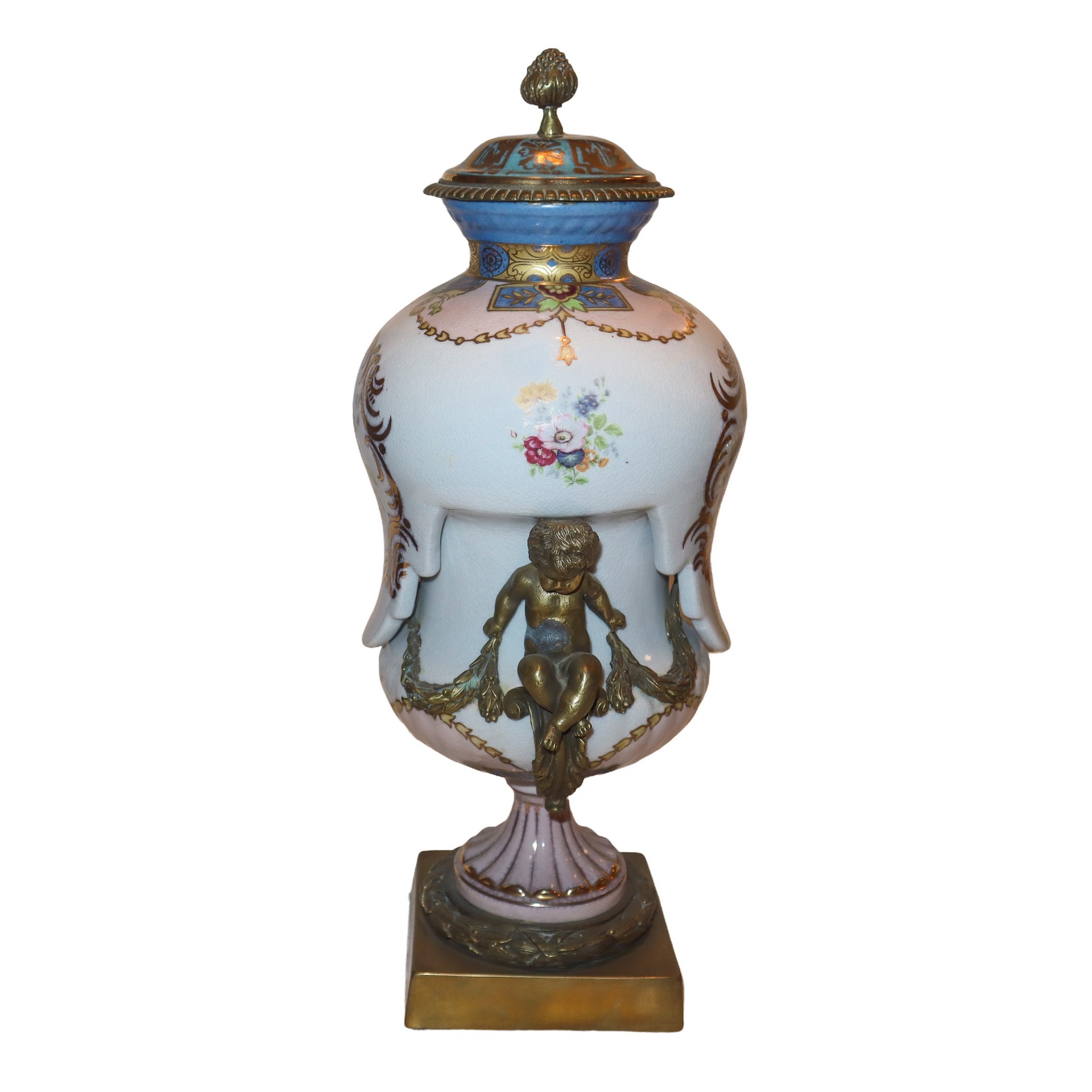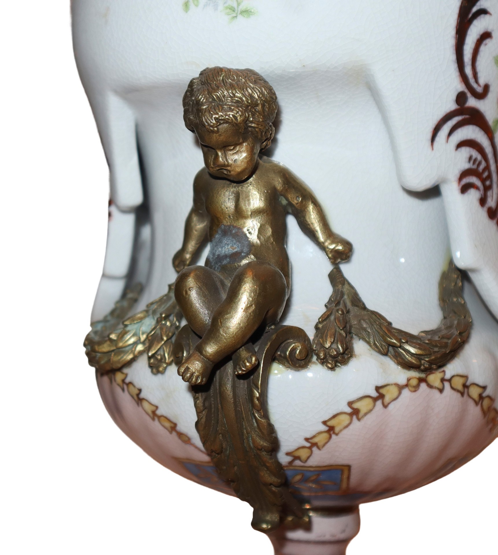 Vaso poutiche in porcellana bianca decorata e dipinta, putti in bronzo dorato applicati ai lati