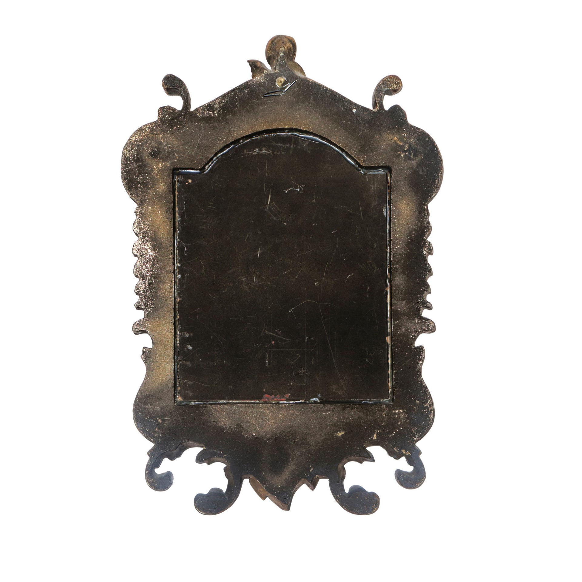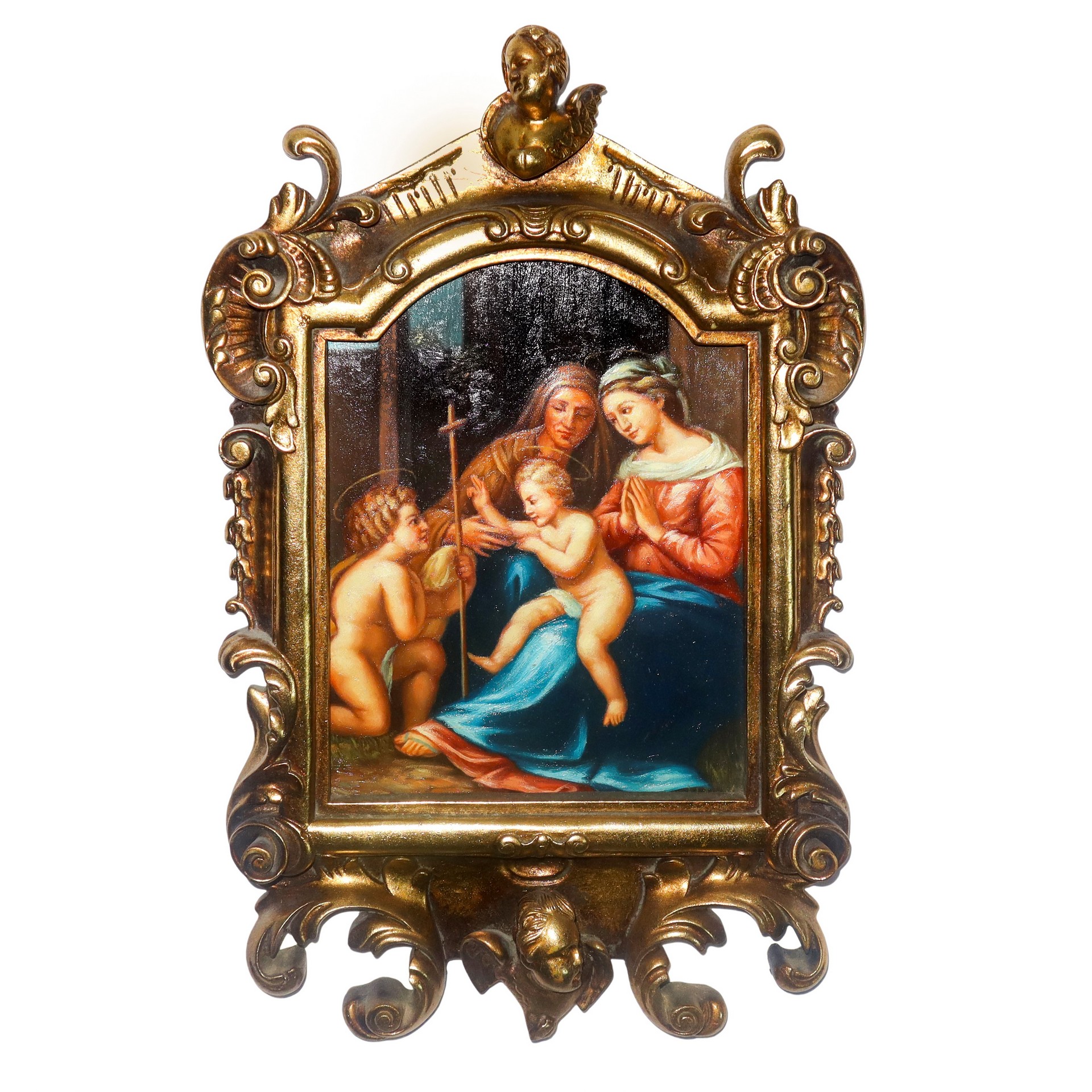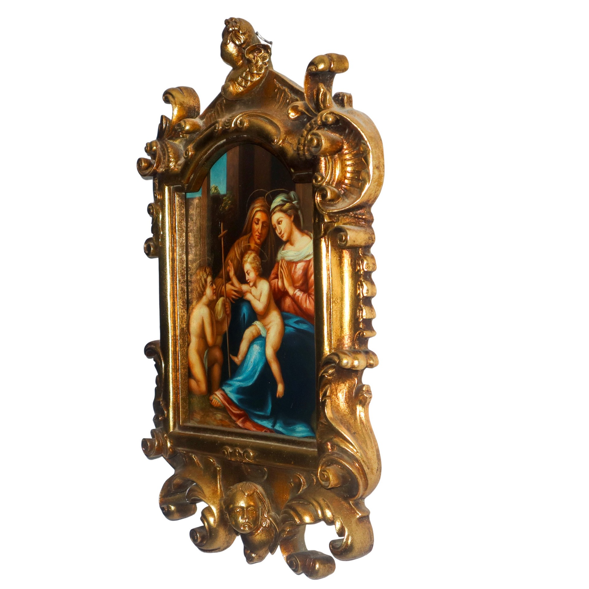 Madonna con Gesù Bambino, San Giovannino e Santa Elisabetta in cornice centinata dorata con decori e bustino alla sommità h cm 49x32.5
