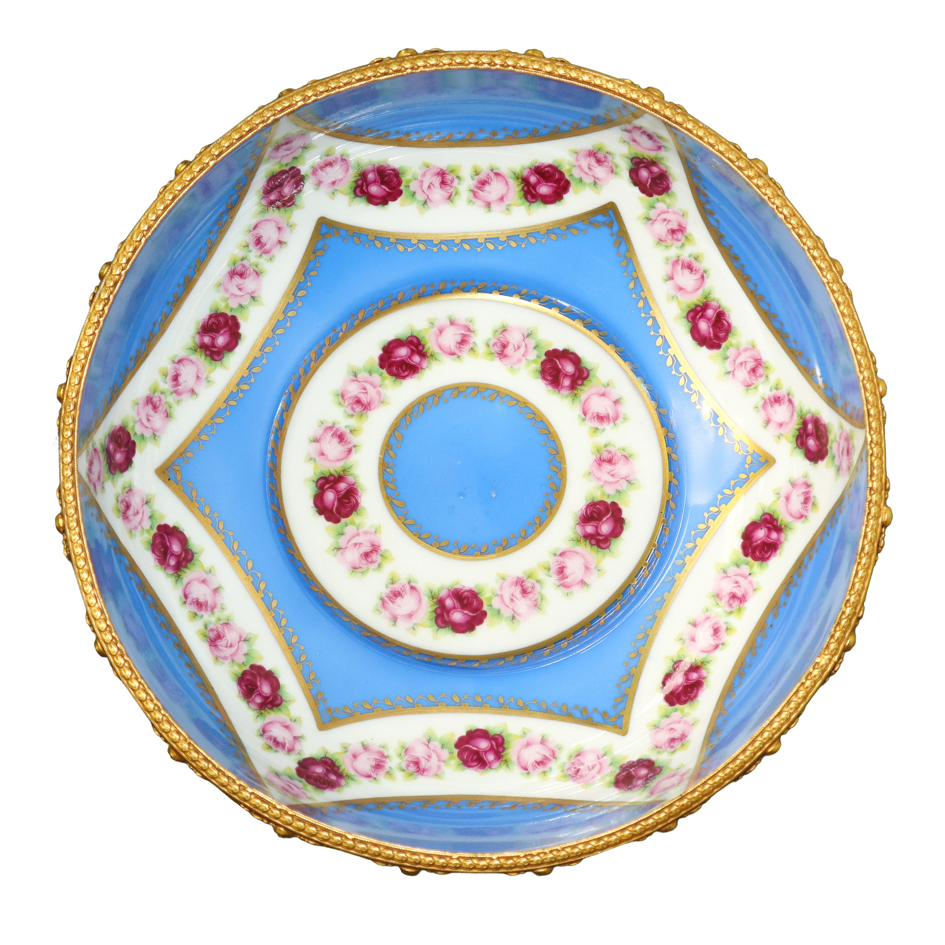 Alzatina centrotavola in stile Sèvres con decori floreali e applicazioni metalliche h 14cm diam. 23.5cm