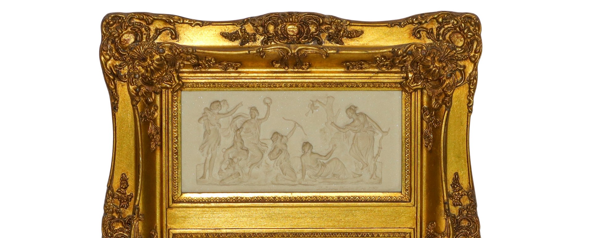 Lotto 196 | Specchiera entro cornice dorata con decori e bassorilievo neoclassico