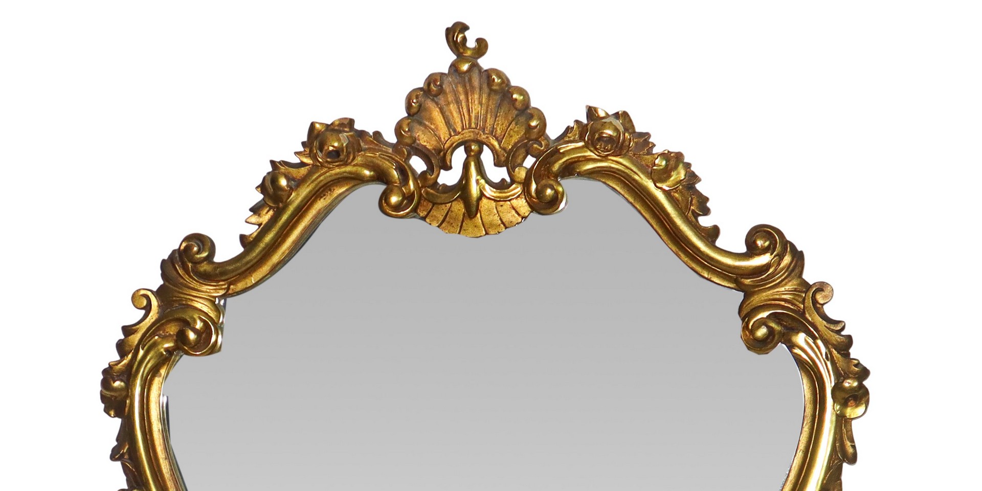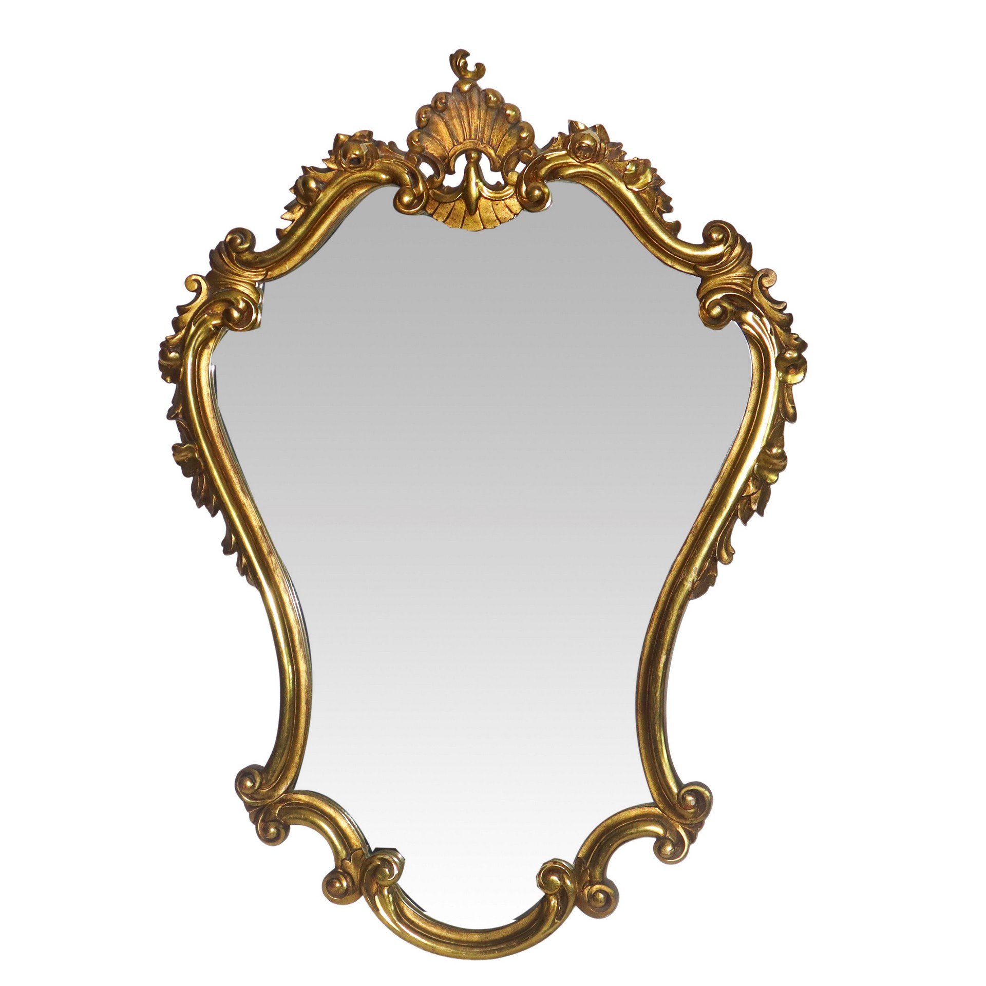 Specchiera sagomata in stile Rococò entro cornice dorata con decori e motivo a conchiglia sulla sommità