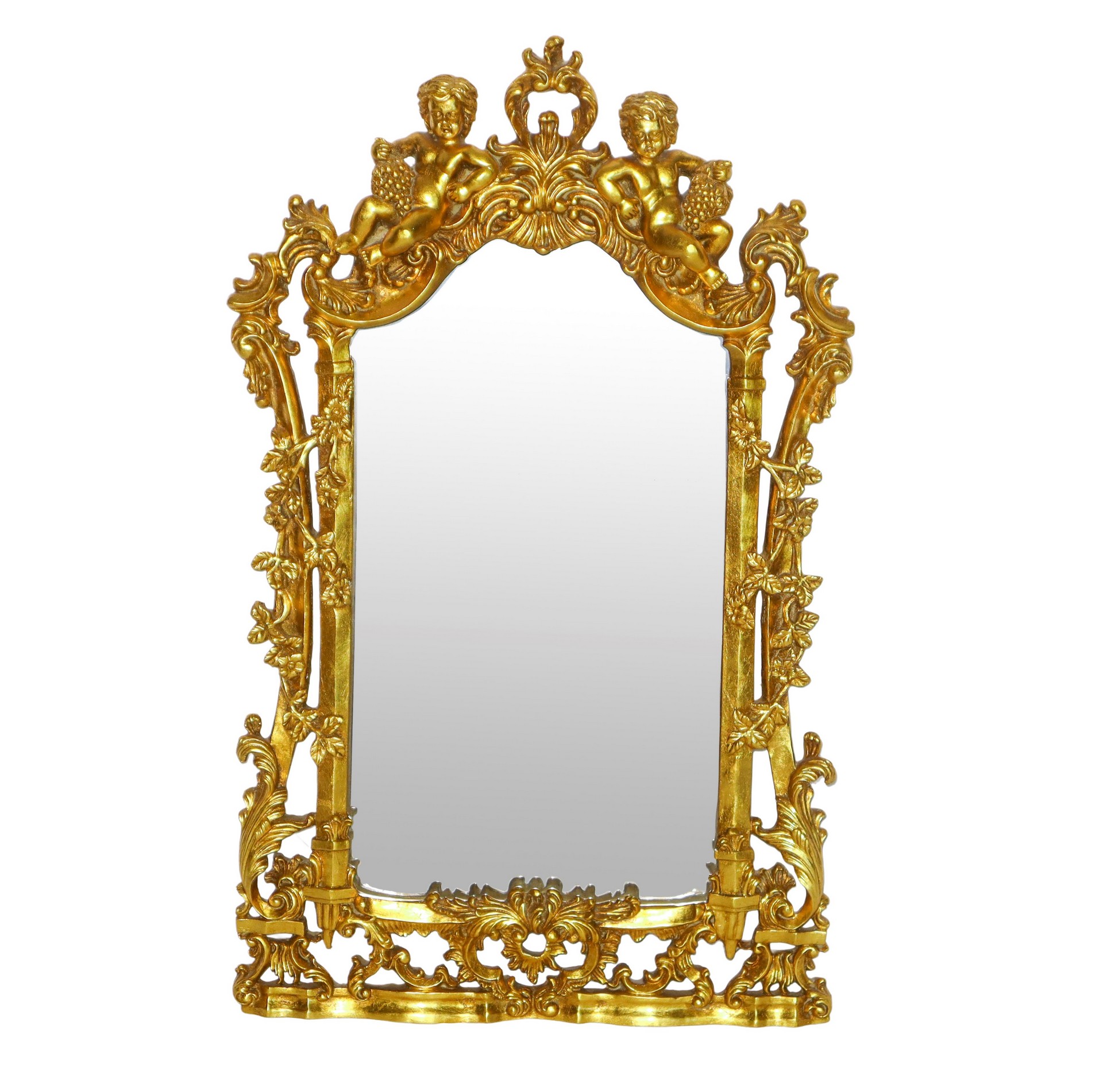 Specchiera sagomata entro cornice dorata riccamente decorata a traforo con due bacchini alla sommità h cm 76x48